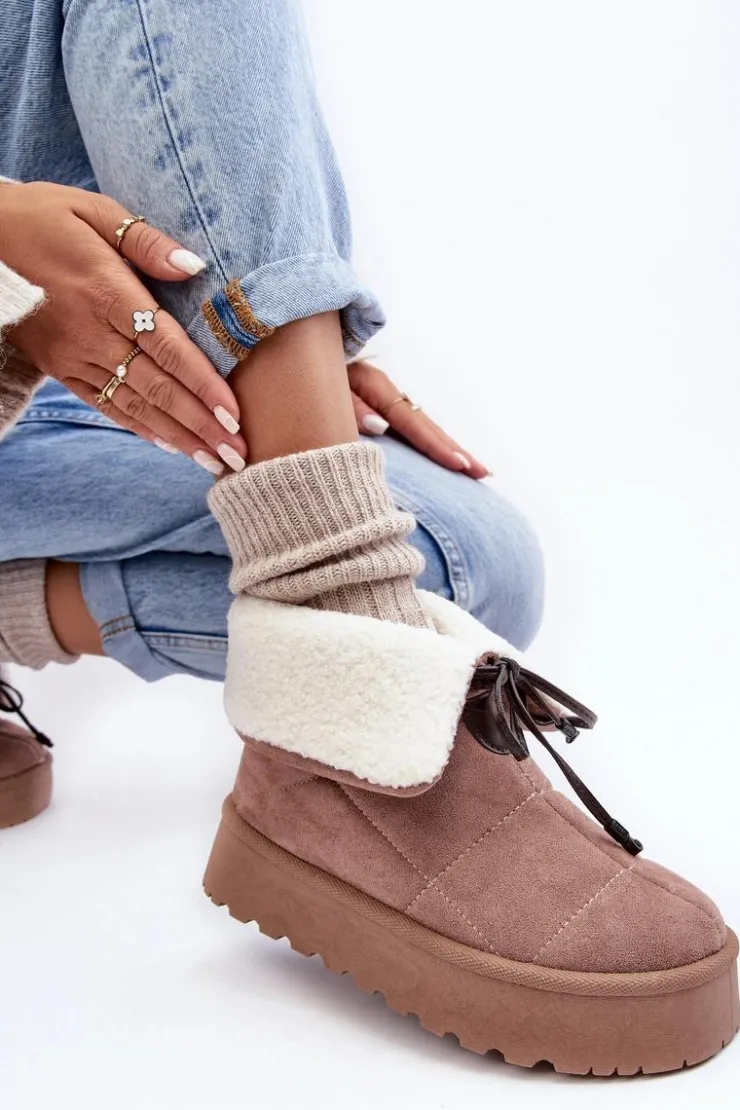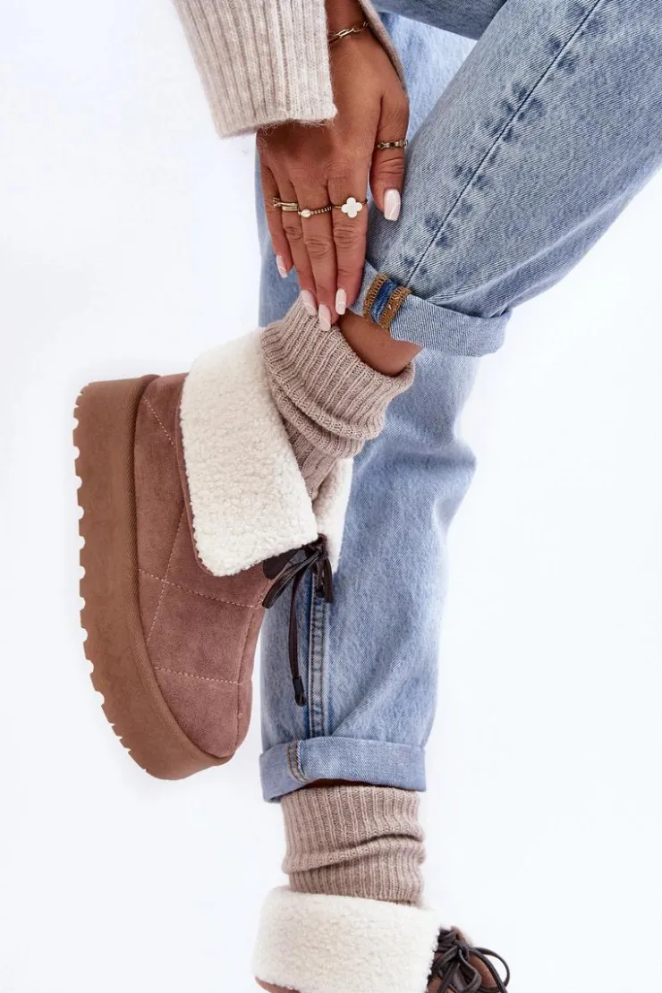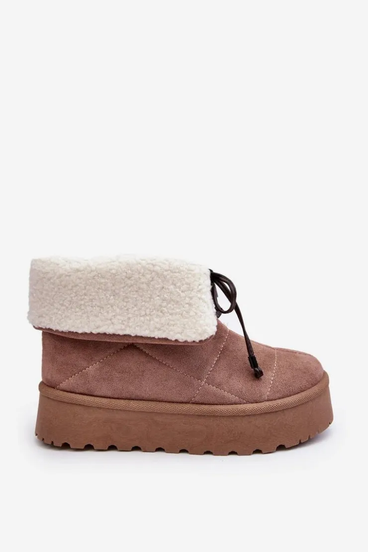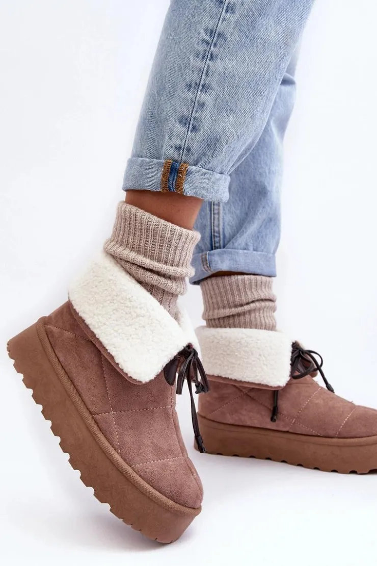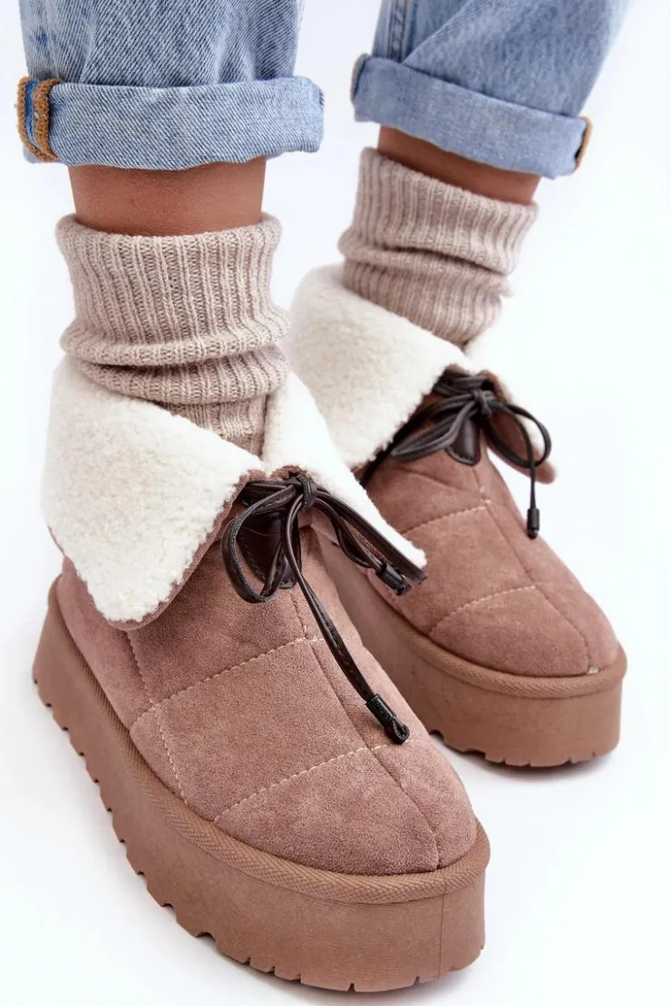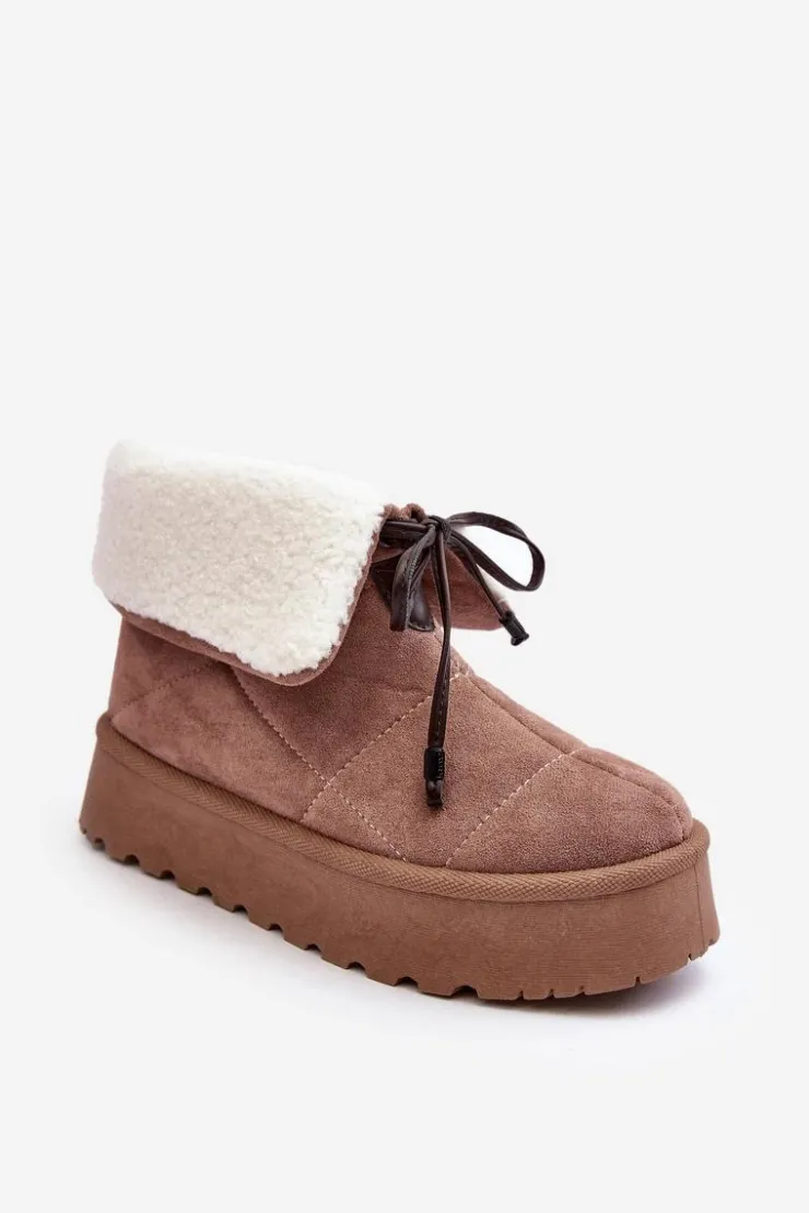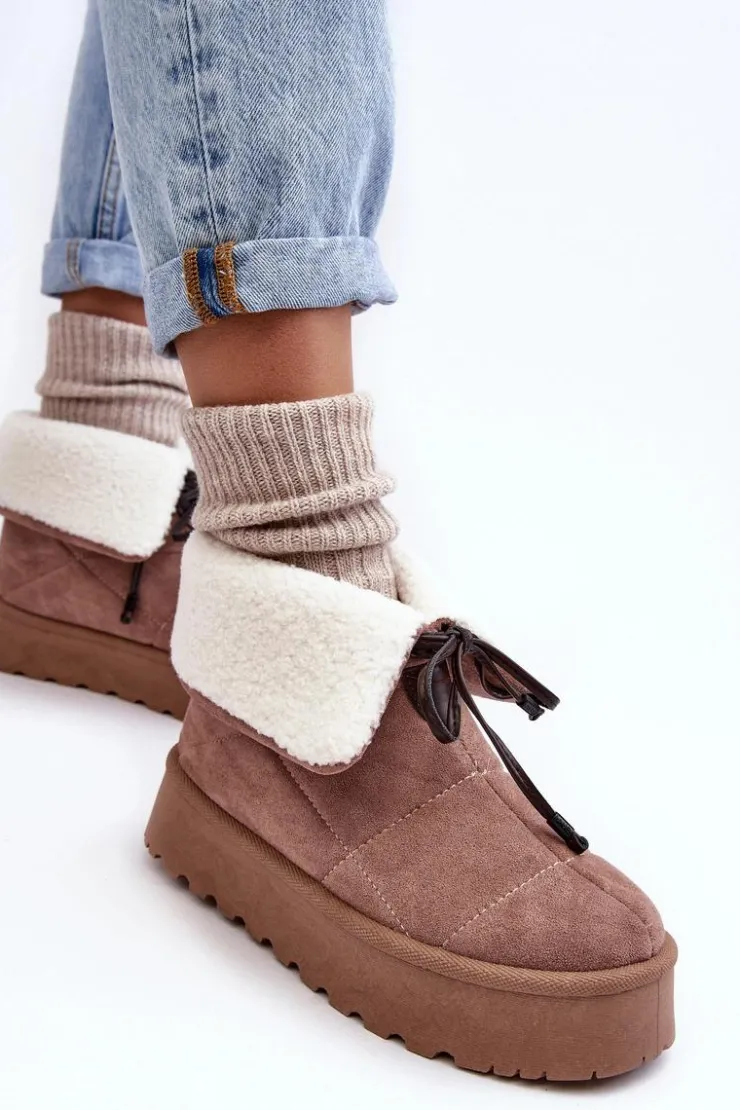 Damskie śniegowce idealnie sprawdzą się podczas mroźnych dni. Wykonane z eko zamszu. Osadzone na grubej platformie. Ocieplone kożuchem. Model wsuwany. Cholewka ozdobiona wiązaniem. Przy wyborze rozmiaru prosimy sugerować się tabelą rozmiarów.
