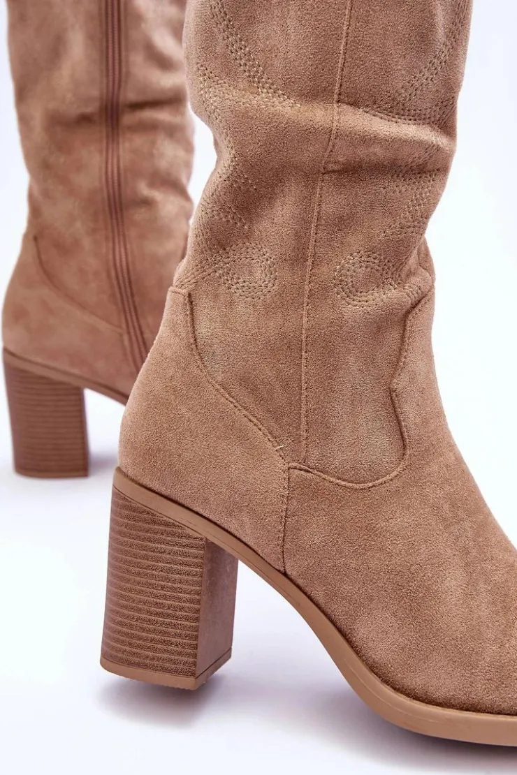 Kozaki damskie zostały wykonane z eko zamszu. Osadzone na obcasie w postaci słupka. Zapinane na suwak z boku. Dodatkowo zapiętek w tym obuwiu został usztywniony. Miękka wkładka zapewni komfortowe użytkowanie. Model ten świetnie sprawdzi się w wielu stylizacjach! Przy wyborze rozmiaru prosimy sugerować się tabelą rozmiarów.