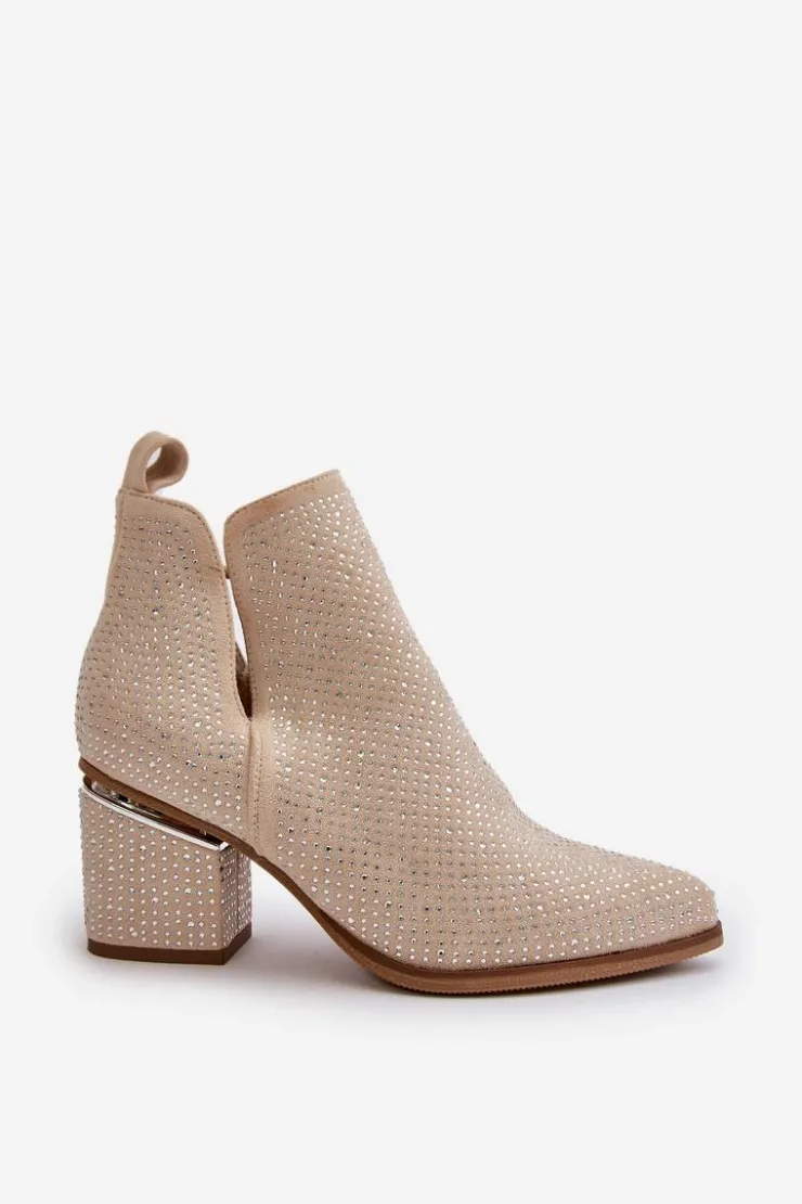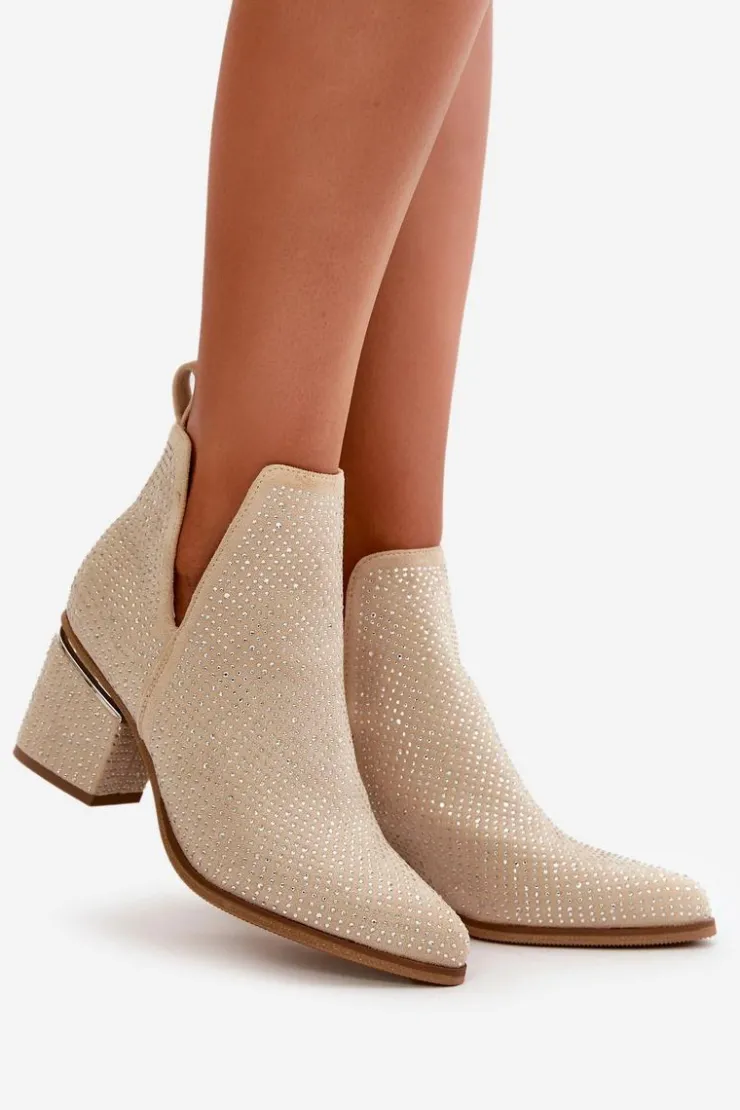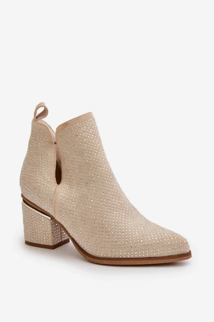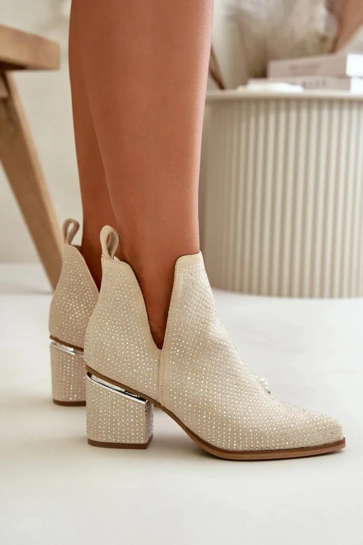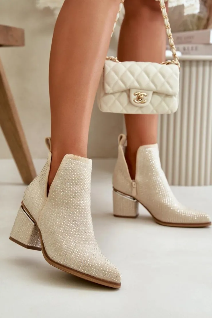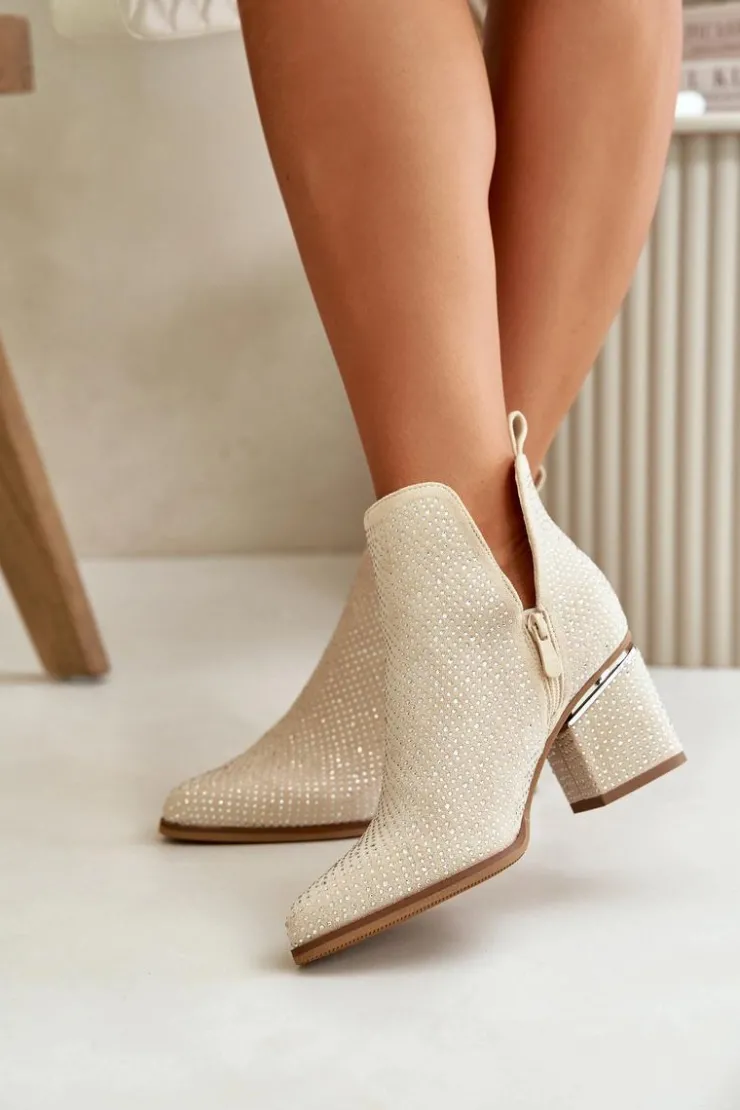 Zdobione botki damskie wykonane z eko zamszu. Cholewka z wycięciami, zapinana na zamek, nadaje im unikalnego charakteru. Osadzone na stabilnym obcasie typu słupek, z noskami w szpic, te botki łączą elegancję z nowoczesnym stylem, idealnie komponując się z różnymi stylizacjami. Przy wyborze rozmiaru prosimy sugerować się tabelą rozmiarów.