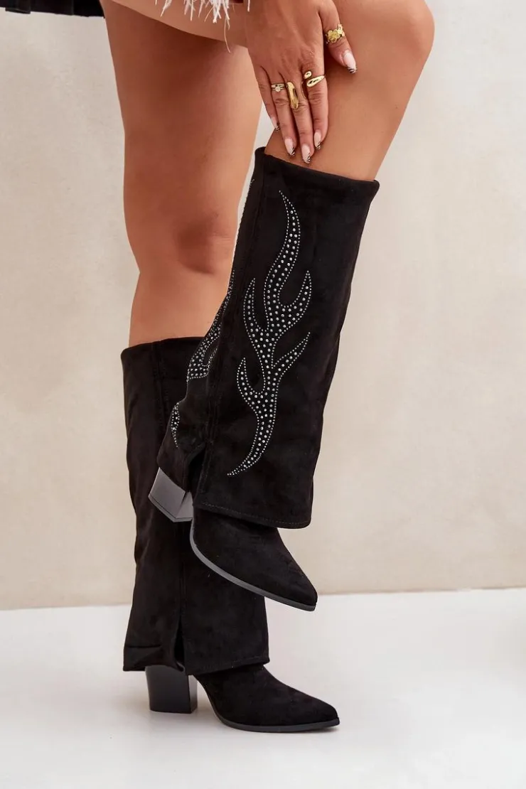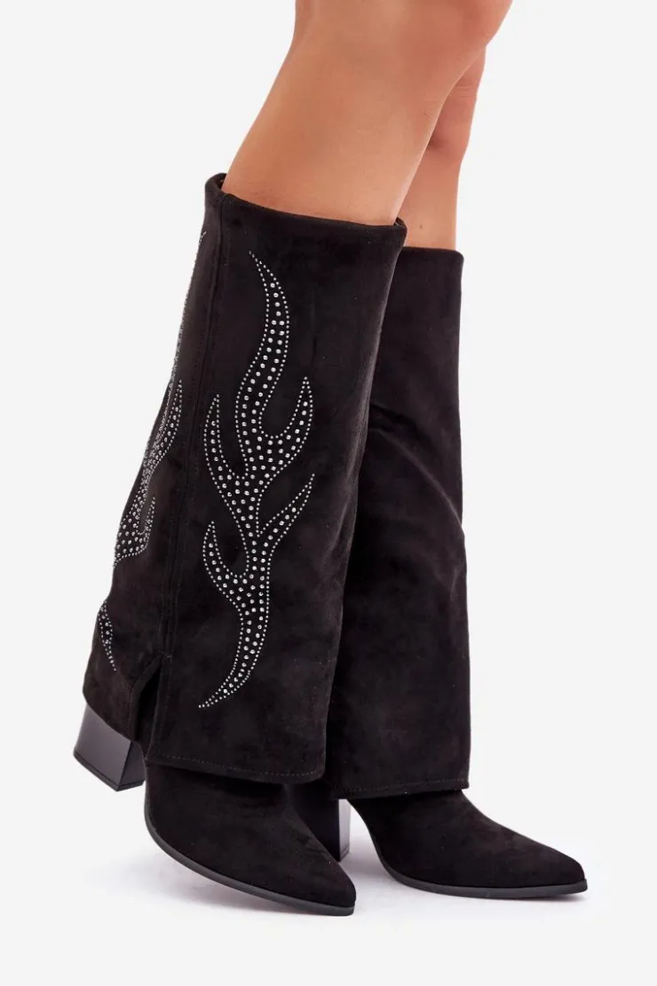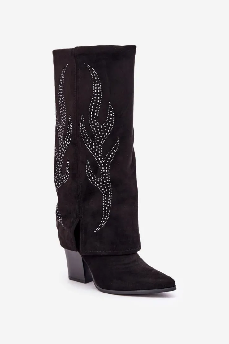 Kozaki damskie wykonane z eko zamszu. Model wsuwany z dodatkowym zapięciem na zamek na dole dla wygody zakładania i zdejmowania. Szpiczaste noski optycznie wysmuklają nogi, a wywinięta cholewka ze zdobieniem dodaje unikalnego charakteru. Stylowe i wyjątkowe, idealne do modnych stylizacji. Przy wyborze rozmiaru prosimy sugerować się tabelą rozmiarów.