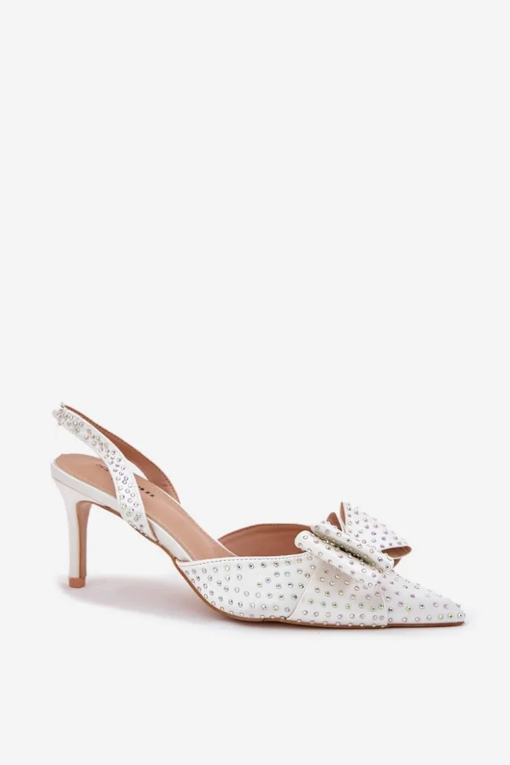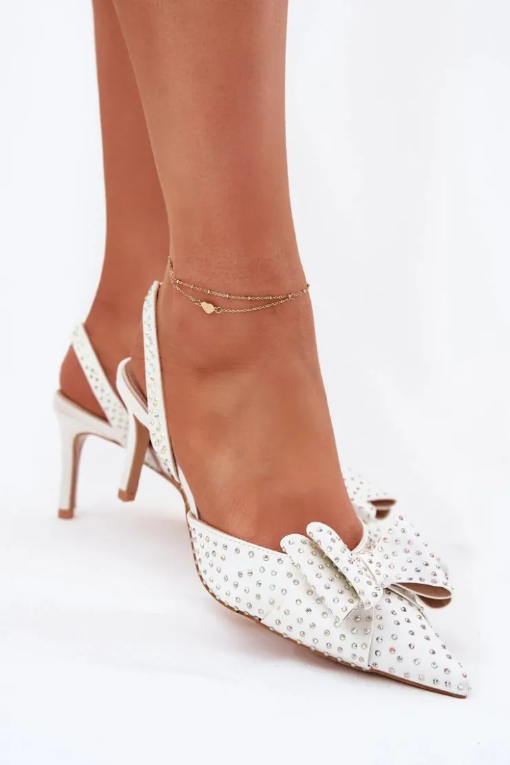 Zdobione szpilki damskie z odkrytą piętą to elegancka i stylowa propozycja na wyjątkowe okazje. Szpiczaste noski podkreślają smukłość sylwetki, a kokardka z przodu dodaje uroku i subtelności. Miękka wkładka zapewnia komfort przez cały dzień, łącząc wygodę z modnym wyglądem. Idealne na wieczorne wyjścia, wesela czy inne formalne uroczystości. Przy wyborze rozmiaru prosimy sugerować się tabelą rozmiarów.