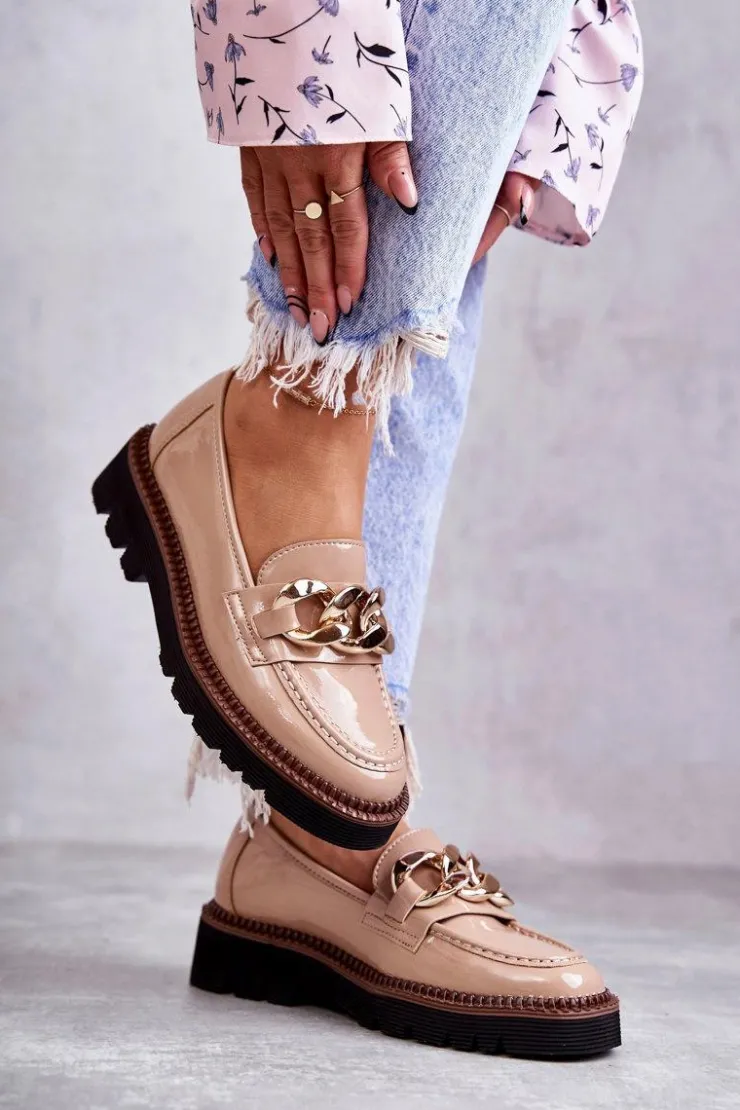 Klasyczne półbuty to doskonały wybór w stylizacjach do pracy. Posiadają skórzaną wkładkę, która zapewnia komfort na długie godziny. Złote zdobienie z tworzywa sztucznego pięknie podkreśla całość. Buty posiadają masywną podeszwę z wyraźnym wyżłobieniem. Lakierowana eko skóra o praktyczny wybór na co dzień. Półbuty Loafery to buty, które muszą znaleźć się w Twojej szafie. Przy wyborze rozmiaru prosimy sugerować się tabelą rozmiarów.