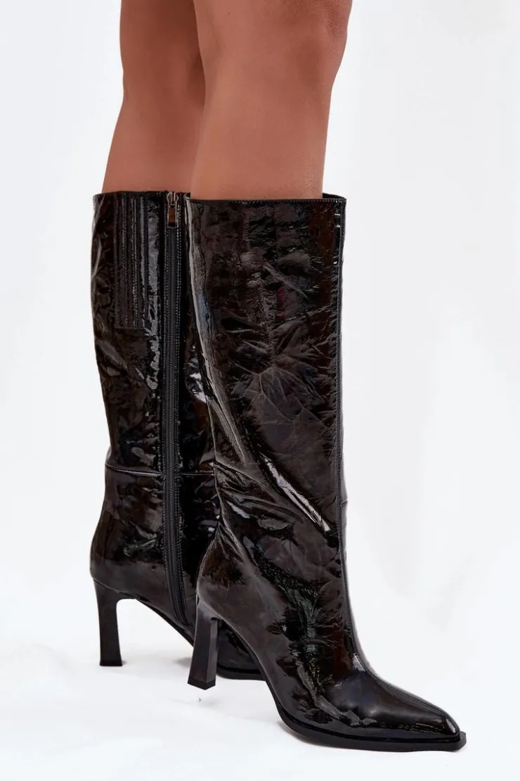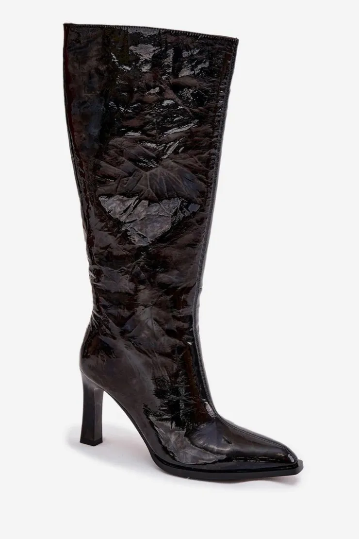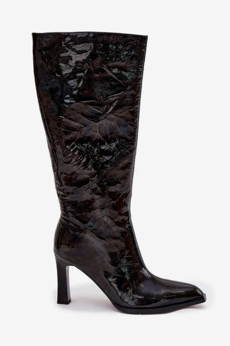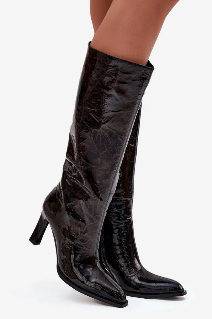 Kozaki damskie wykonane z lakierowanej skóry naturalnej to propozycja dla kobiet ceniących elegancję w ponadczasowym wydaniu. Lśniąca cholewka ozdobiona przeszyciami przyciąga uwagę i podkreśla wyjątkowy charakter obuwia. Smukła linia buta z migdałowymi noskami nadaje całości kobiecego stylu i subtelnej klasy. Model osadzony został na stabilnym obcasie w formie słupka, który wysmukla sylwetkę i jednocześnie zapewnia komfort noszenia. Praktyczne zapięcie na zamek ułatwia zakładanie i zdejmowanie, a ocieplane wnętrze gwarantuje ciepło w chłodniejsze dni. To eleganckie kozaki, które doskonale sprawdzą się w sezonie jesienno-zimowym, idealnie uzupełniając zarówno codzienne, jak i bardziej formalne stylizacje. Przy wyborze rozmiaru prosimy sugerować się tabelą rozmiarów.