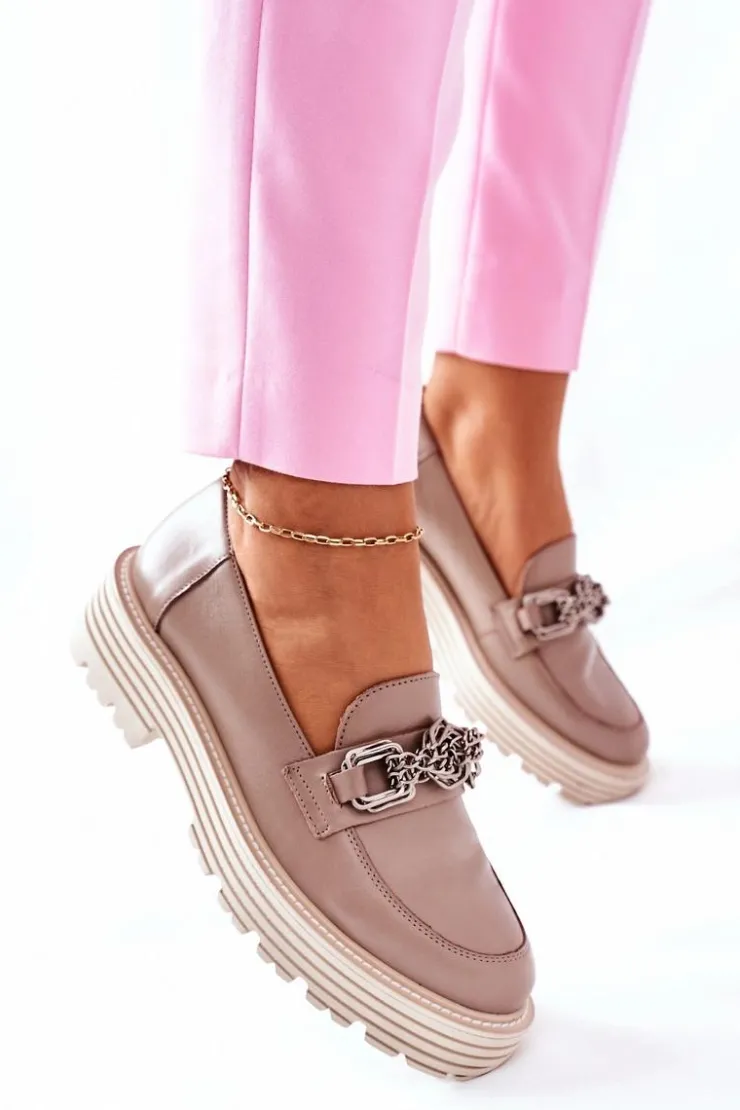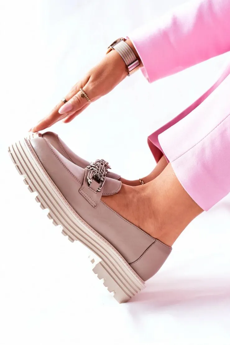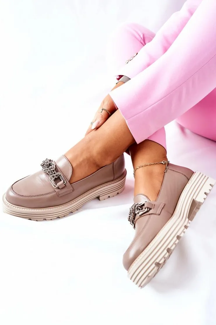 Klasyczne półbuty w stylu przepięknych loaferów! Buty zostały wykonane z wysokiej jakości skóry naturalnej. Charakterystyczne zdobienie w postaci łańcucha sprawi, że stworzymy z nimi wiele wspaniałych stylizacji. Wysoka podeszwa oraz obcas, który uniesie naszą sylwetkę. Przy wyborze rozmiaru prosimy sugerować się tabelą rozmiarów.