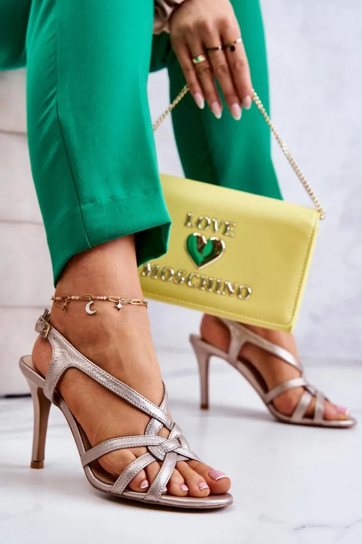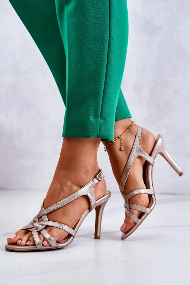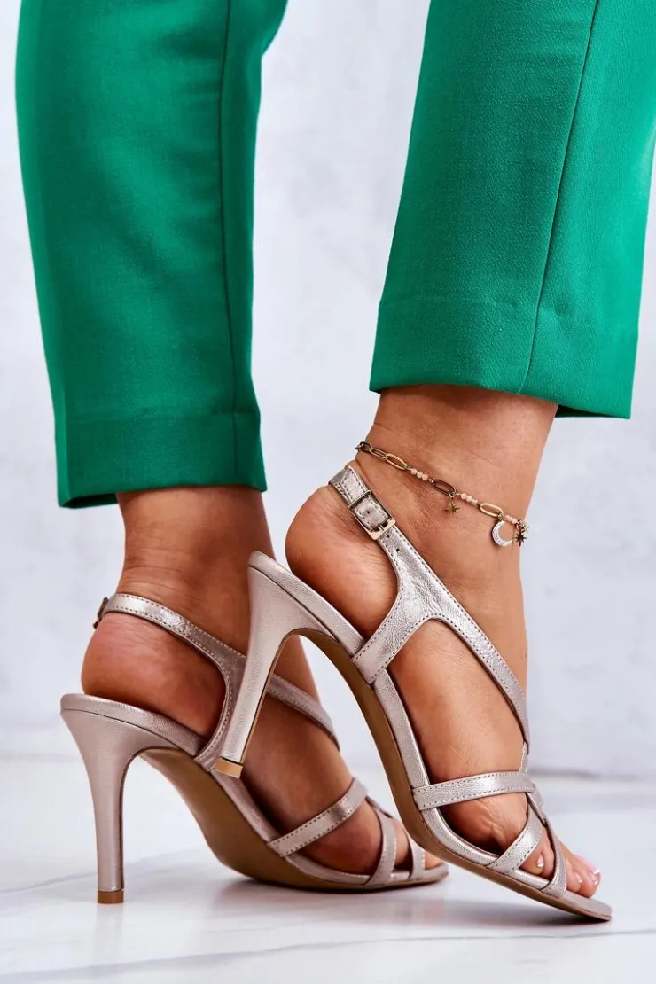 Piękne sandały na szpilce zostały wykonane z naturalnej skóry z dbałością o szczegóły. Paseczki przeplatają się na przodzie, co sprawia że buty cudownie prezentują się na nodze. Zapinane na regulowany pasek ze sprzączką. Miękka, wygodna wkładka to gwarancja komfortu przez cały dzień. Model ten idealnie sprawdzi się do eleganckich spodni czy wieczorowej sukienki. Idealne sandałki na lato, które po prostu musisz mieć! Nie czekaj aż znikną! Przy wyborze rozmiaru prosimy sugerować się tabelą rozmiarów.