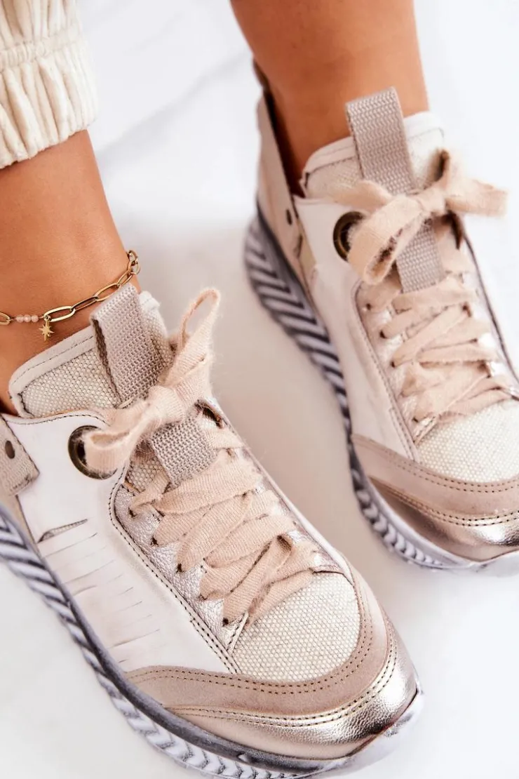 Niewątpliwie fasony tej marki wyróżniają się na tle innych butów! Cudowne połączenia kolorystyczne oraz materiałowe. Sneakersy, którymi podkreślisz wiele stylizacji. Posiadają koturn, platformę oraz sztywny zapiętek stabilizujący nogę. Wykonane z naturalnej skóry oraz materiału. Miękka wyściółka ze skóry daje duże poczucie komfortu. Ciekawe wiązanie oraz przecięcia materiału na bokach tworzą oryginalny design!Przy wyborze rozmiaru prosimy sugerować się tabelą rozmiarów.