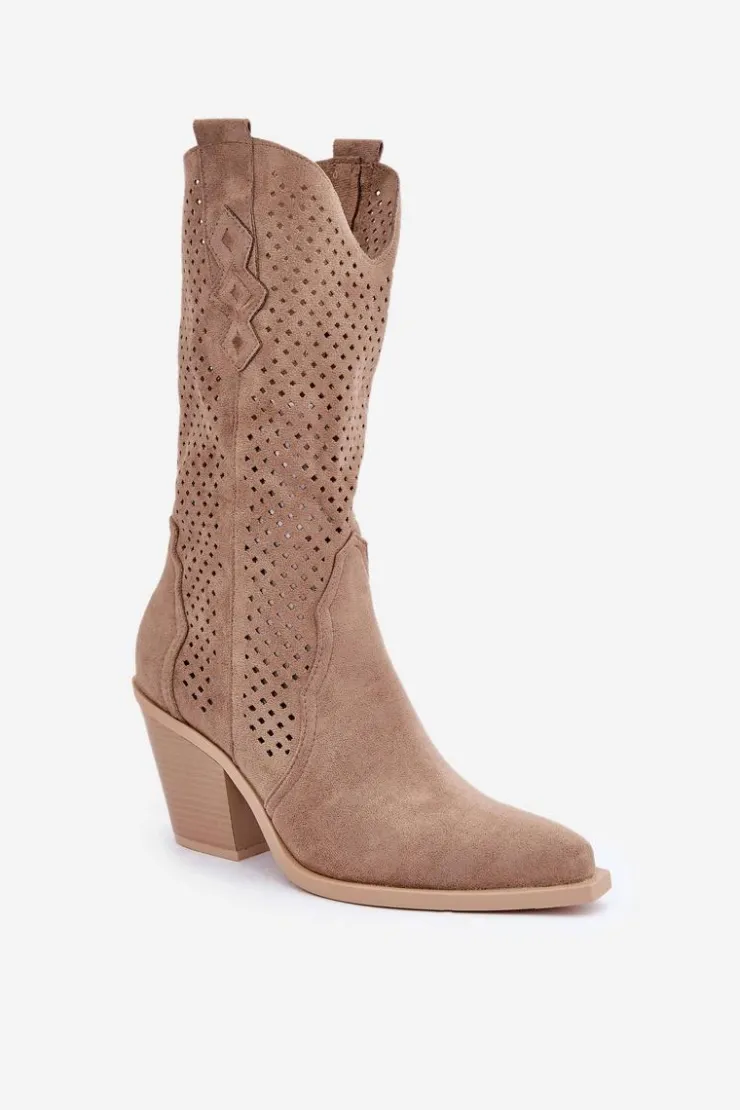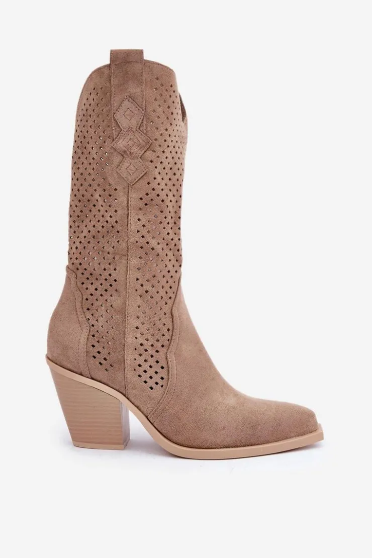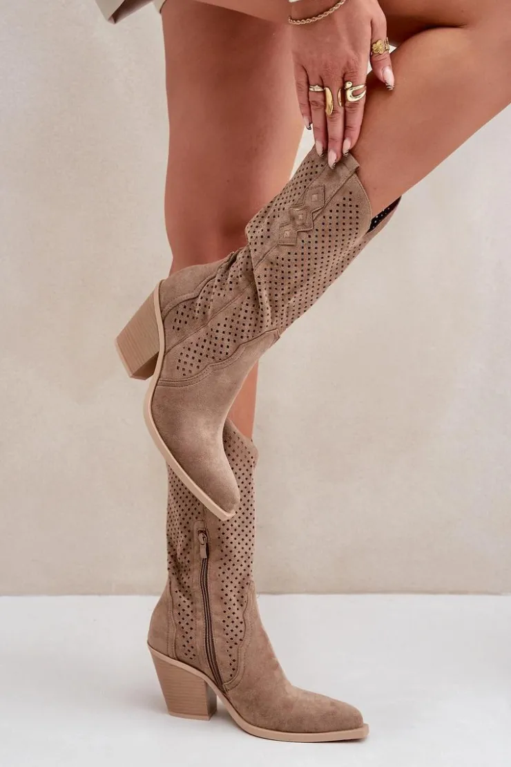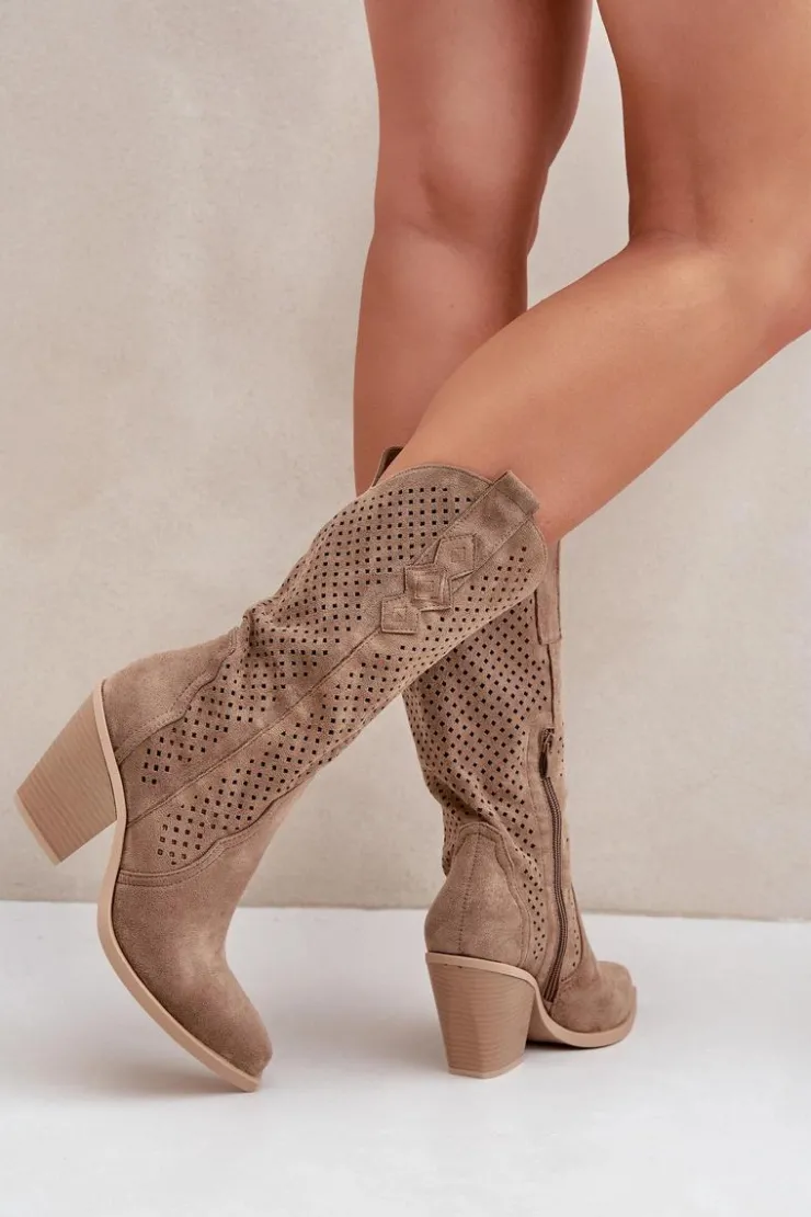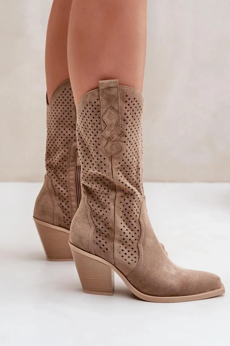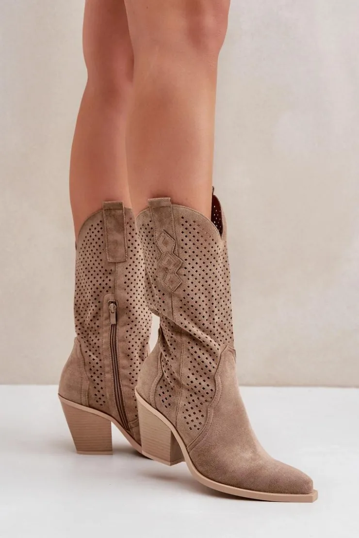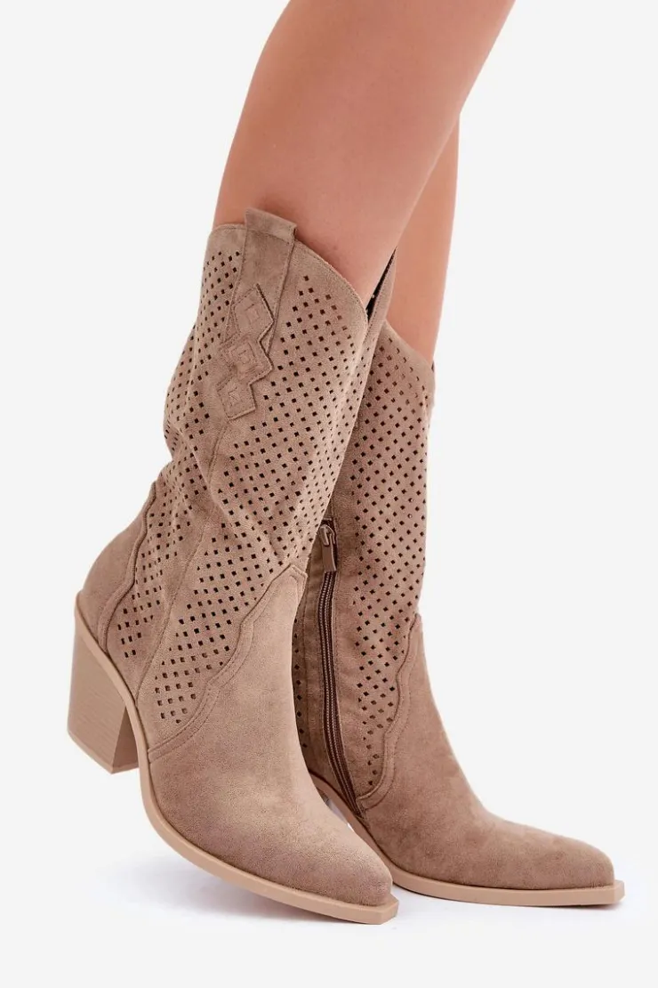 Botki kowbojki to wyjątkowy model dla kobiet, które cenią sobie połączenie stylu i komfortu. Ażurowa cholewka dodaje unikalnego charakteru. Miękka wkładka wykonana z eko skóry zapewnia doskonały komfort noszenia, dbając o stopy nawet podczas długiego użytkowania. Stabilny obcas słupek łączy elegancję z praktycznością, umożliwiając swobodne poruszanie się. Model wsuwany z dodatkowym zapięciem na zamek gwarantuje łatwe zakładanie oraz idealne dopasowanie do stopy. Szpiczaste noski podkreślają kobiecość i dodają wyrafinowanego wyglądu. Stylowe botki kowbojki doskonale komponują się zarówno z jeansami, jak i bardziej eleganckimi stylizacjami, nadając im wyrazisty i modny akcent. Idealne na każdą okazję, te botki są must-have w każdej garderobie! Przy wyborze rozmiaru prosimy sugerować się tabelą rozmiarów.