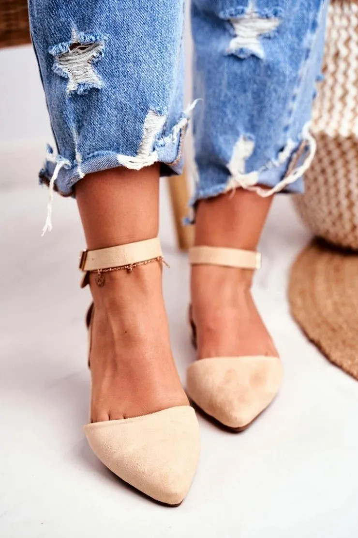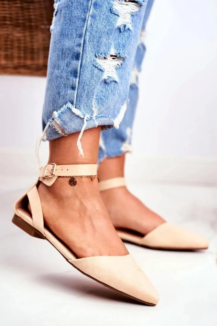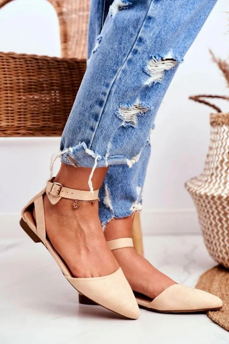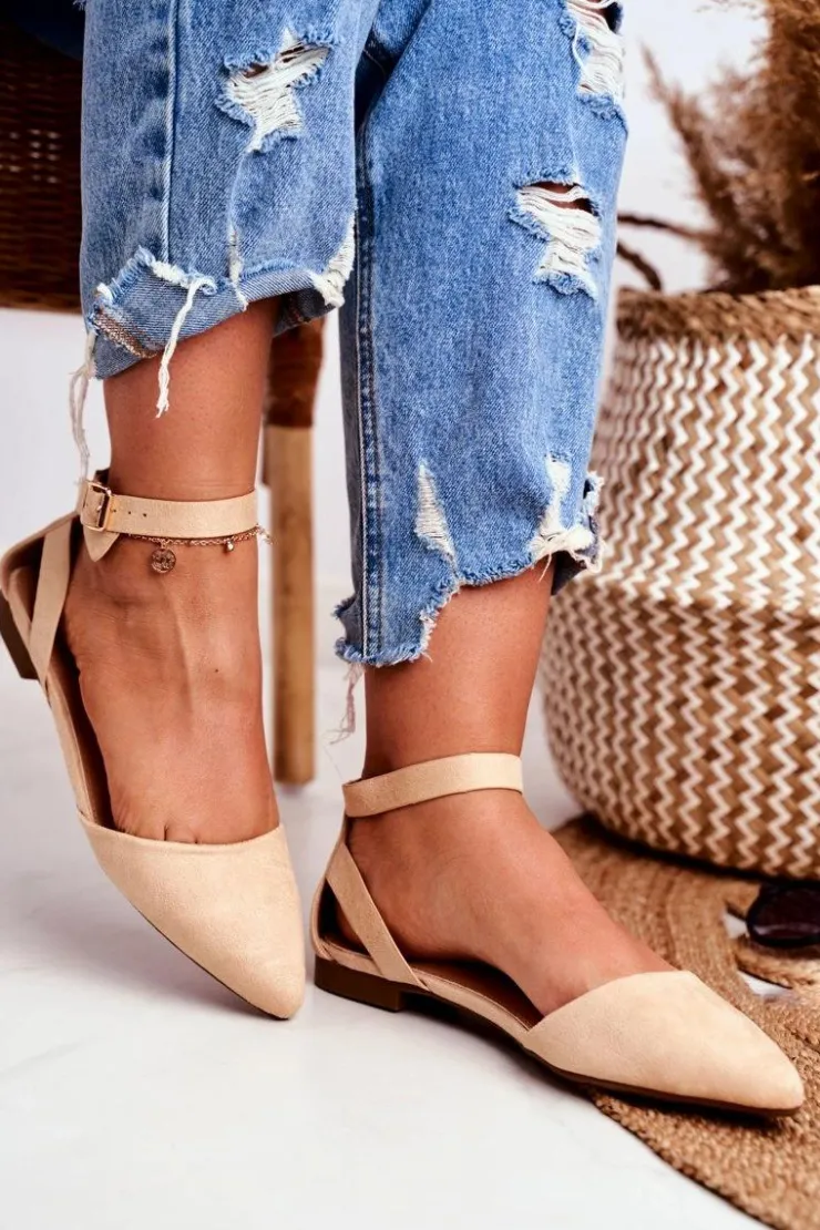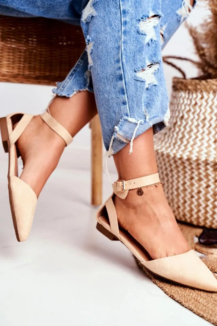 Outlet Boto Baleriny Damskie Beżowe Na Pasek W Szpic Allison