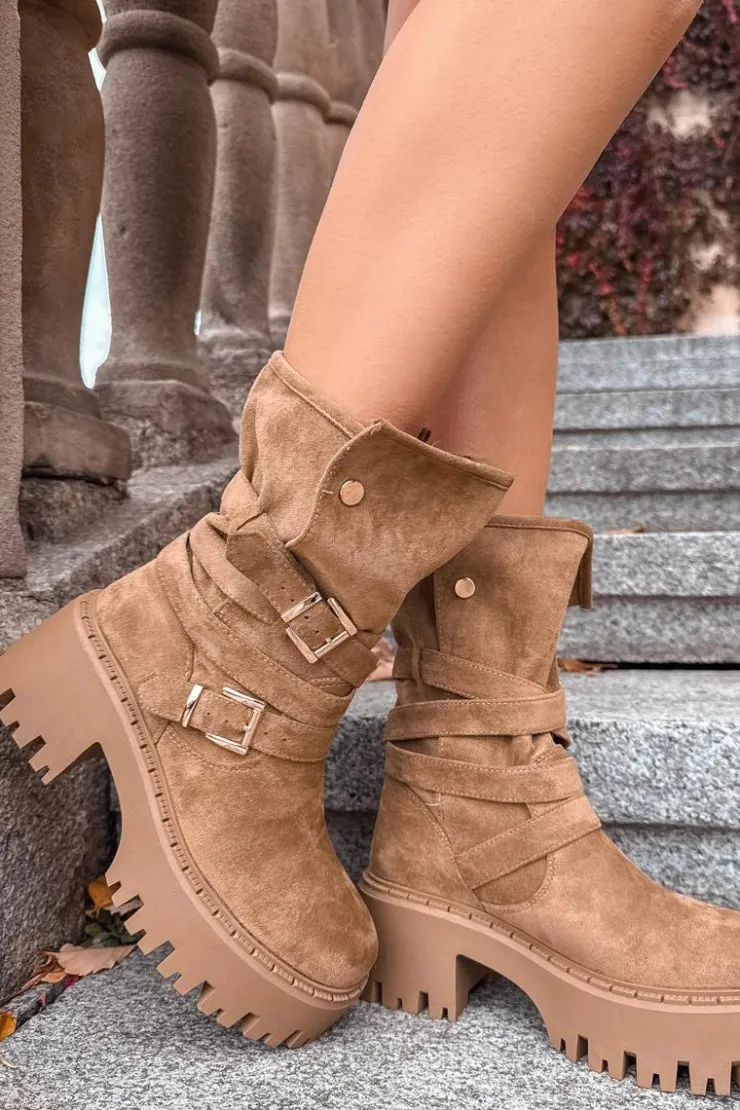 Botki damskie wykonane z eko zamszu. Osadzone na masywnym obcasie, który zapewni stabilność na każdym kroku. Noski zaokrąglone. Model ten wyróżnia się paskiem oplecionym wokół cholewki ze złotymi klamrami. Góra cholewki zapinana na dwa zatrzaski. Bez względu na okazję, te botki będą doskonałym uzupełnieniem Twojej garderoby! Przy wyborze rozmiaru prosimy sugerować się tabelą rozmiarów.