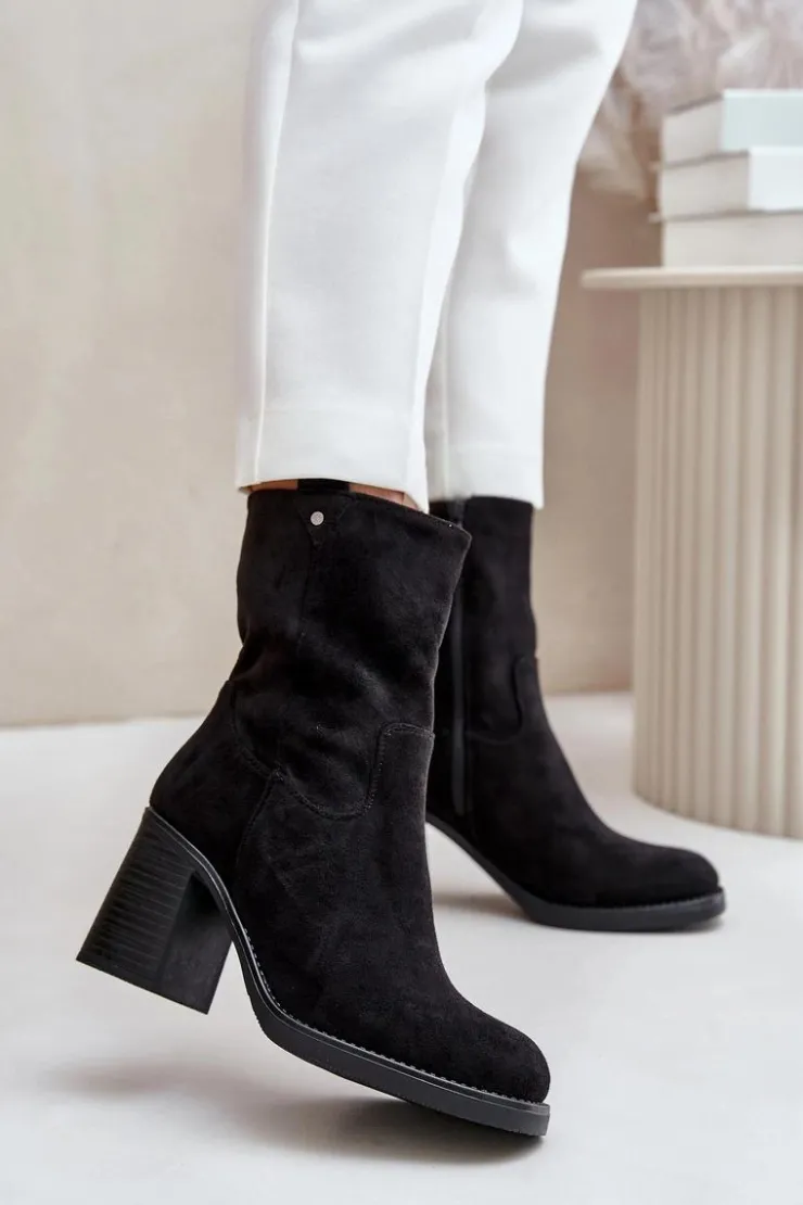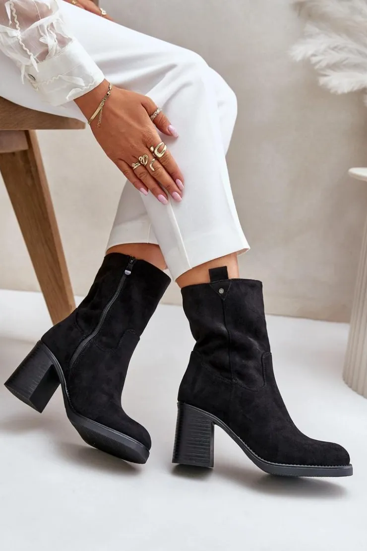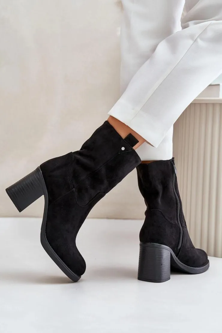 Botki damskie z eko zamszu. Ocieplane kocem obuwniczym. Noski zaokrąglone. Obcas w postaci słupka. Zapinane na zamek. Klasyczny fason, który dopełni wiele jesienno-zimowych stylizacji! Przy wyborze rozmiaru prosimy sugerować się tabelą rozmiarów.