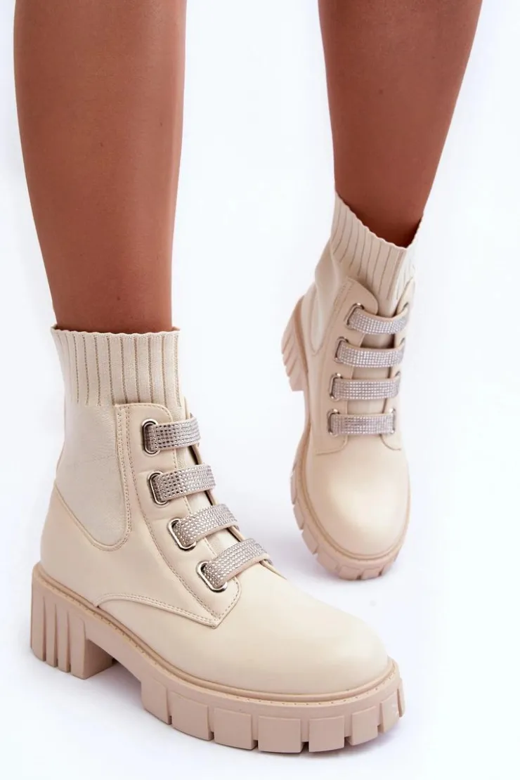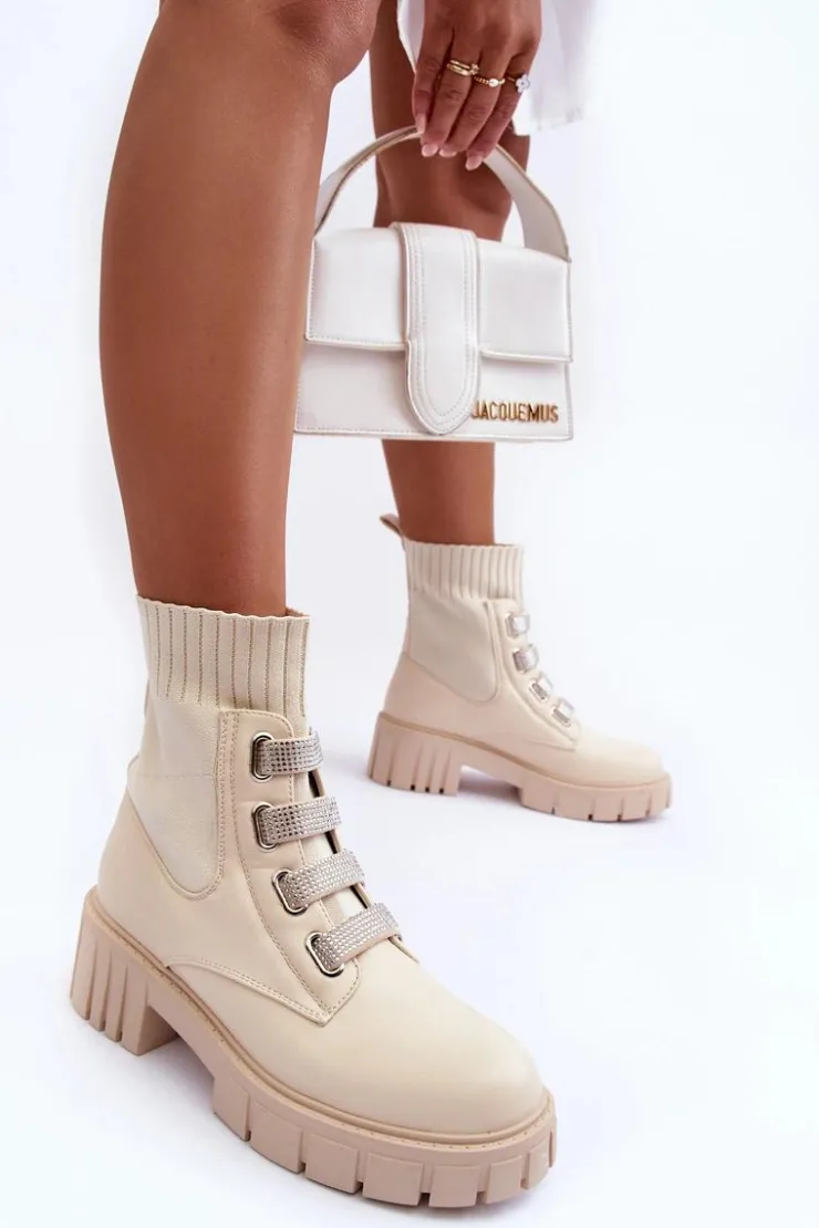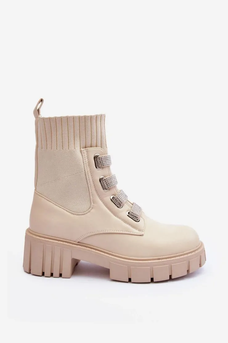 Botki damskie osadzone na płaskim obcasie i platformie. Wykonane z połączenia eko skóry i tkaniny. Z przodu znajdują się ozdobione małymi dżetami paski. Model wsuwany z elastyczną cholewką w formie skarpety. Ocieplenie kocem obuwniczym na wysokości stopy. Idealne do jesiennych stylizacji! Przy wyborze rozmiaru prosimy sugerować się tabelą rozmiarów.