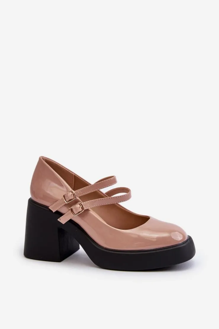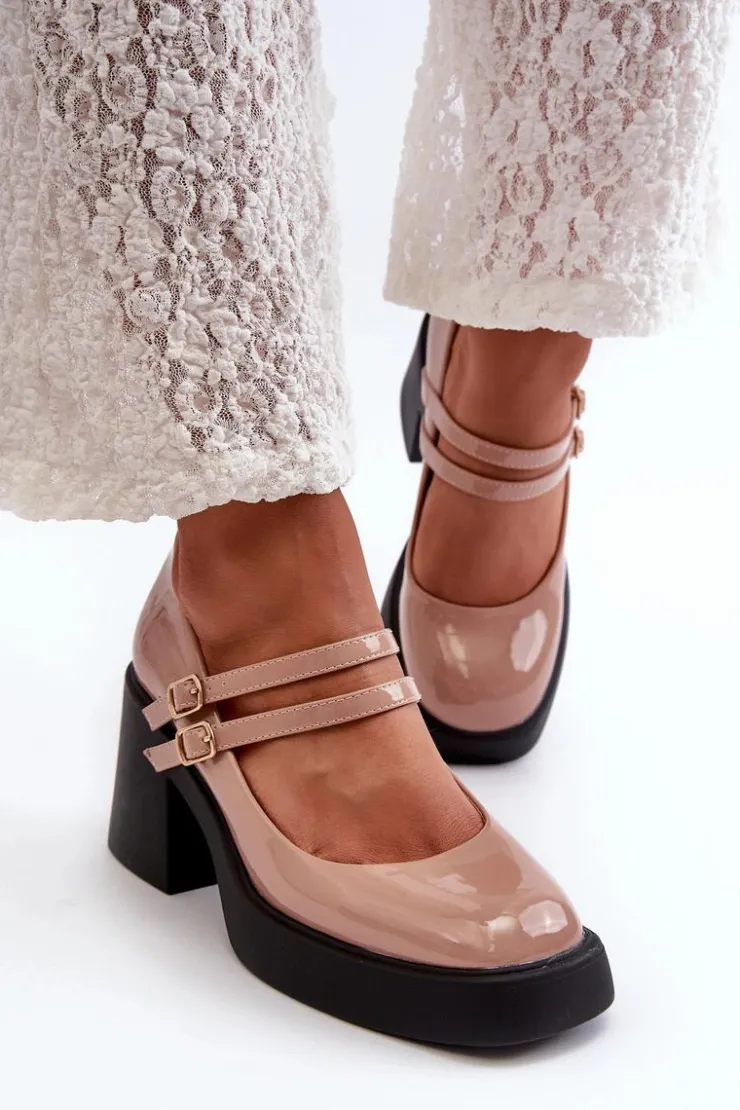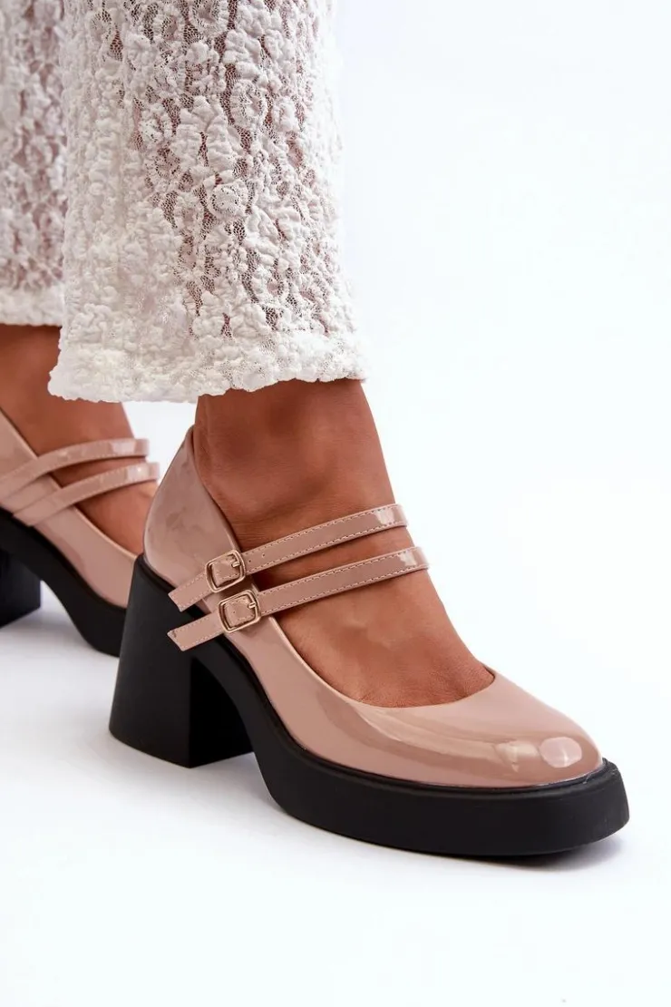 Czółenka wykonane ze skóry ekologicznej. Zapinane na dwa regulowane, cienkie, paseczki. Osadzone na masywnym, wyższym obcasie w postaci klocka. Zapiętek jest usztywniany, a nosek kwadratowy. Dodatkowo buty posiadają delikatną platformę. Ten modny fason koniecznie musi być Twój! Przy wyborze rozmiaru prosimy sugerować się tabelą rozmiarów.