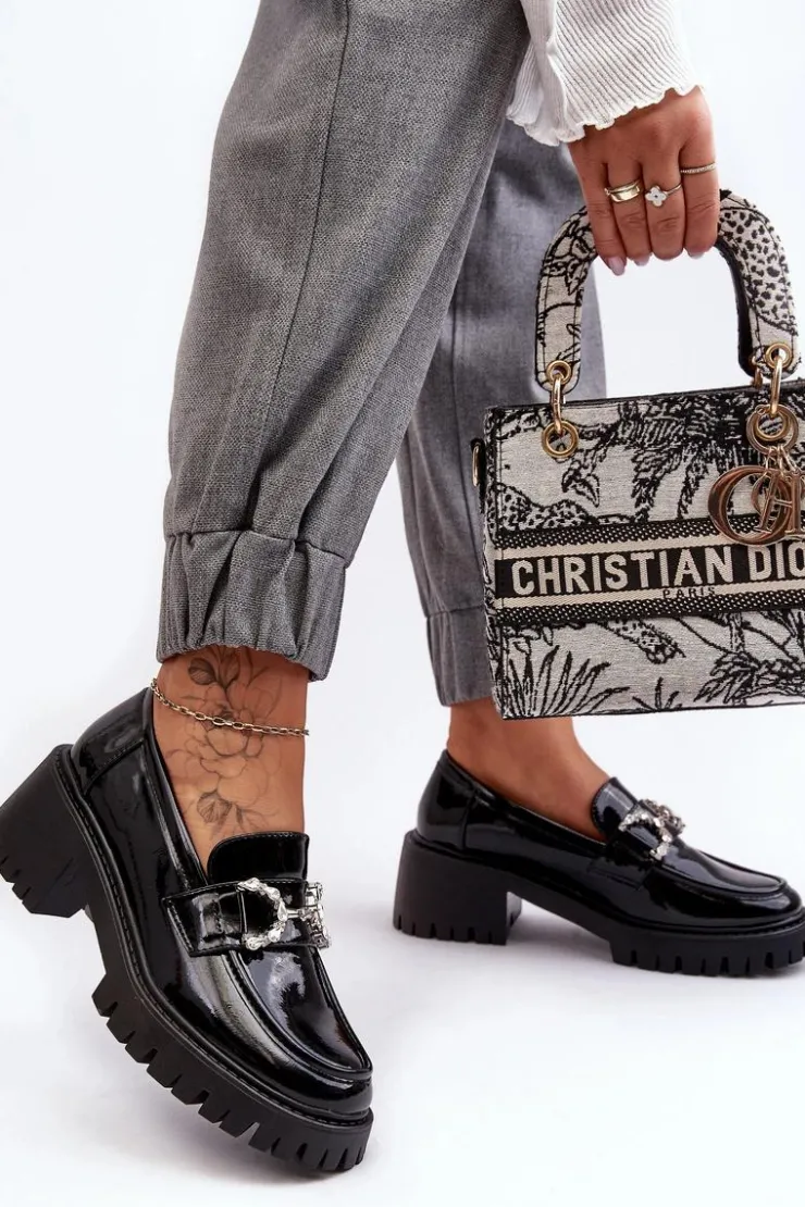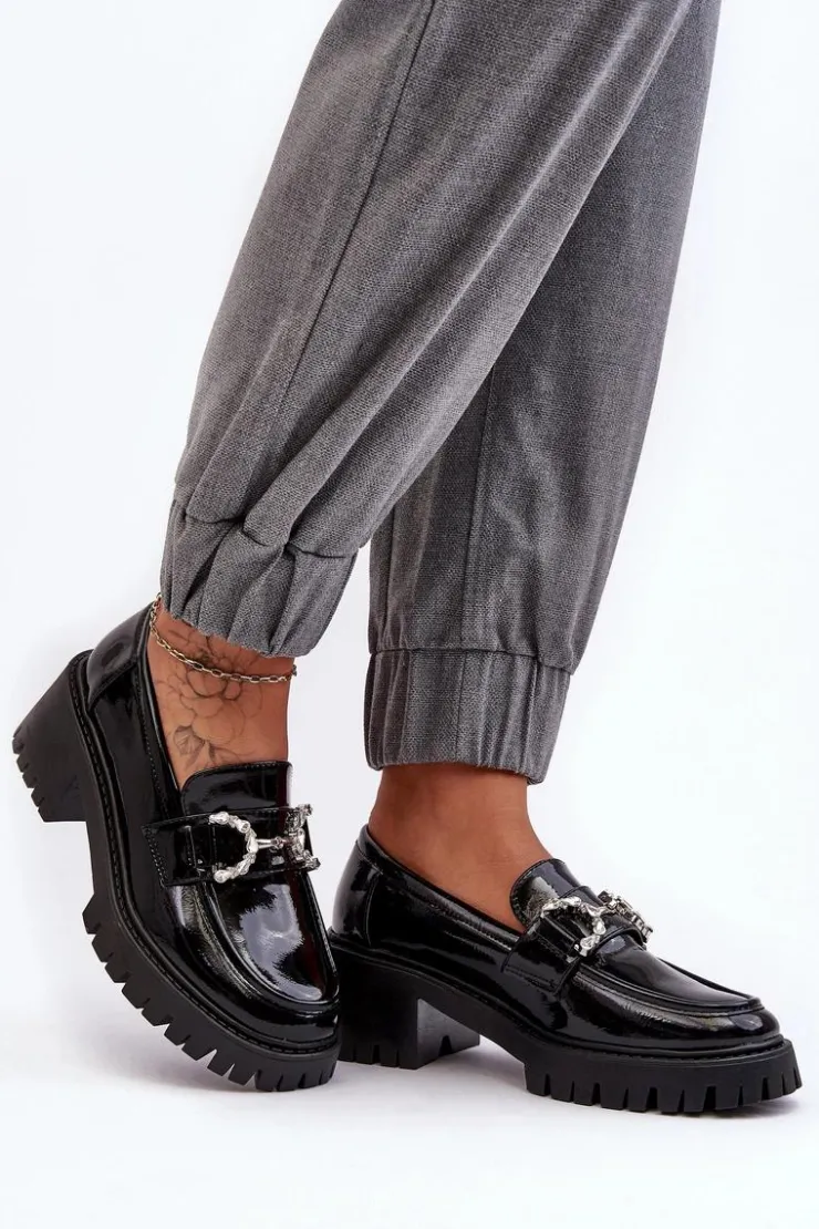 Półbuty damskie wykonane z eko skóry. Osadzone na masywnym, niskim obcasie i platformie. Z przodu na pasku biżuteryjna ozdoba. Noski zaokrąglone. Usztywniony zapiętek. Z tym modelem stworzysz wiele świetnych jesiennych stylizacji! Przy wyborze rozmiaru prosimy sugerować się tabelą rozmiarów.
