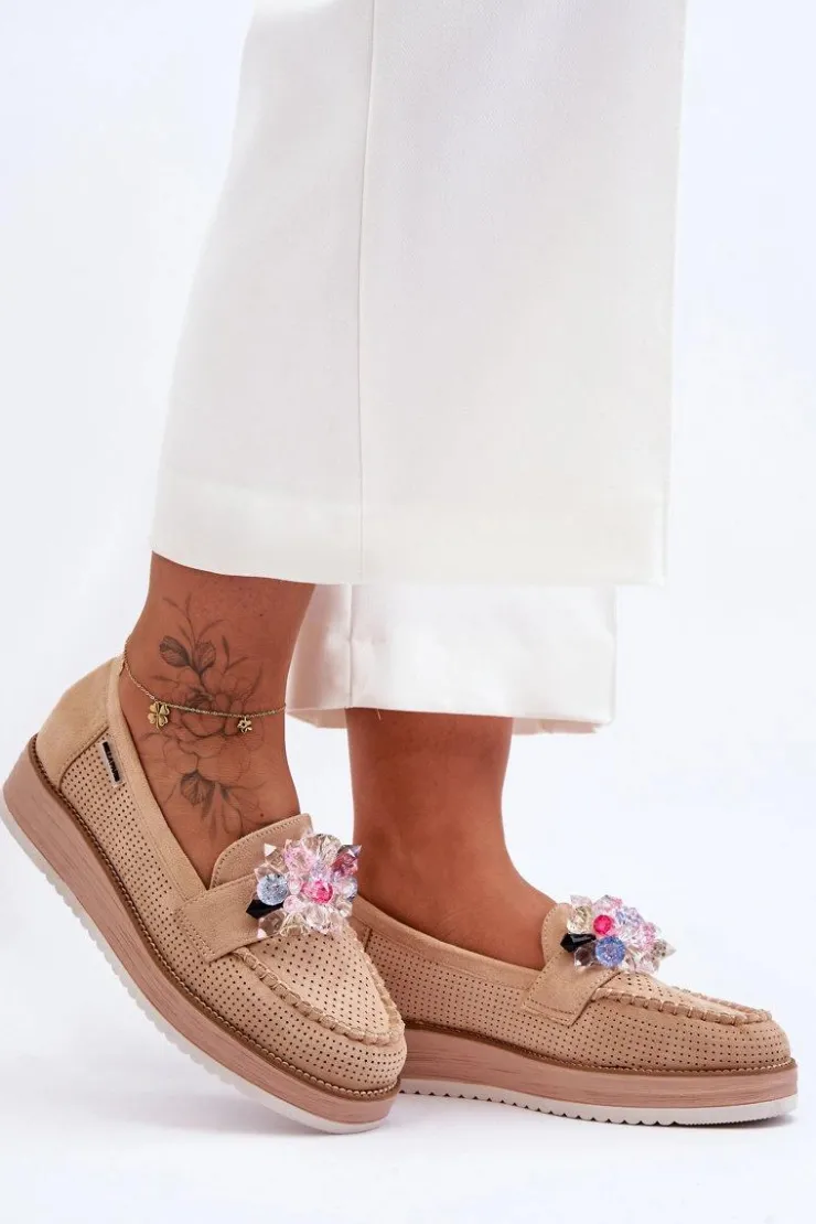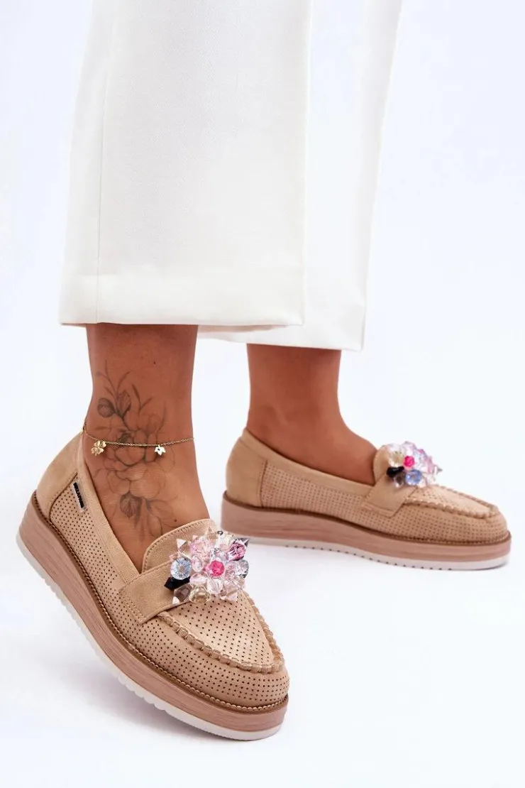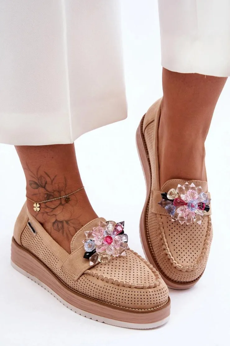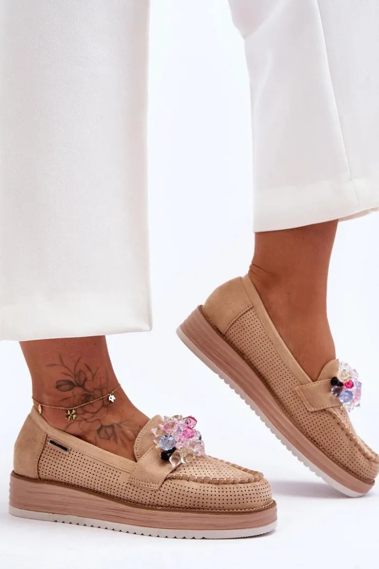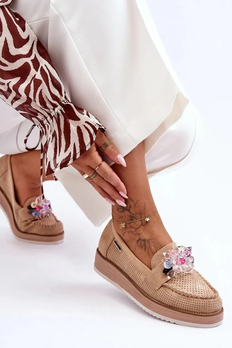 Outlet Boto Damskie Mokasyny Na Platformie Z Kamieniami Beżowe Elonore