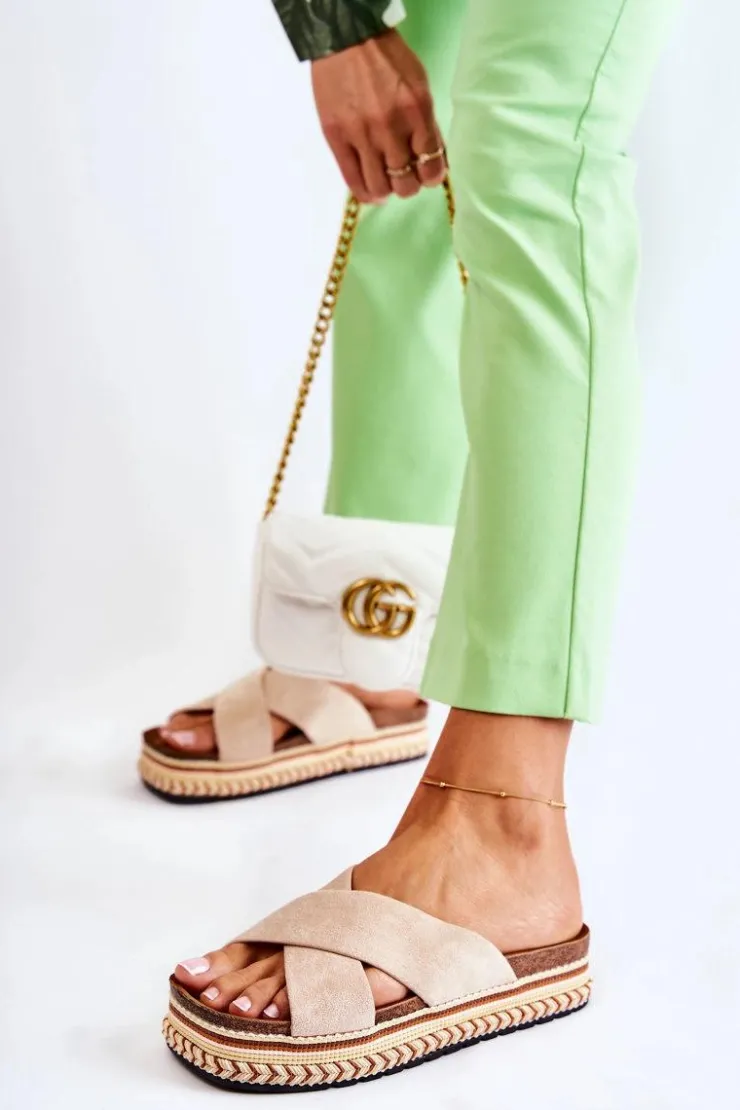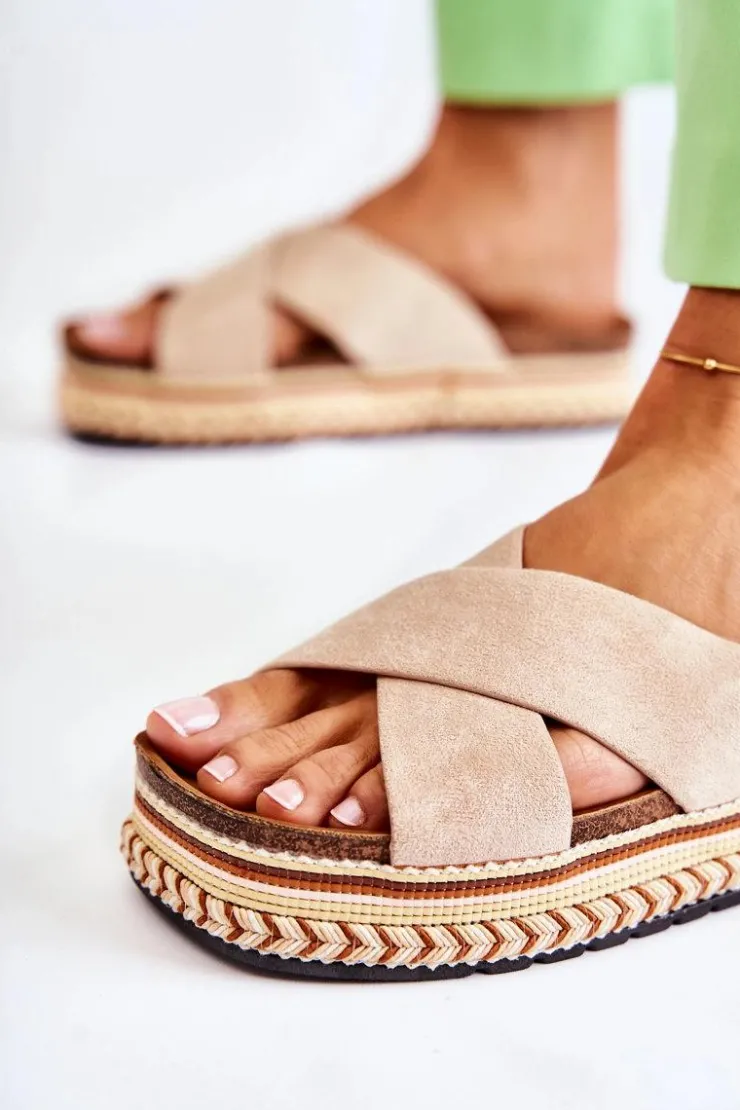 Klasyczne klapki damskie zostały wykonane z eko zamszu. Paski klapek krzyżują się na przodzie. Wkładka jest wykonana z eko skóry. Klapki osadzone na platformie ozdobionej warkoczem i elementami z tworzywa sztucznego. Model z odkrytym, kwadratowym noskiem. Profilowana wkładka zapewni wygodę podczas użytkowania. Koniecznie sprawdź pozostałe modele damskich klapek! Przy wyborze rozmiaru prosimy sugerować się tabelą rozmiarów.