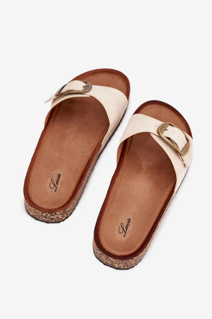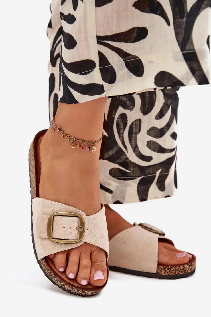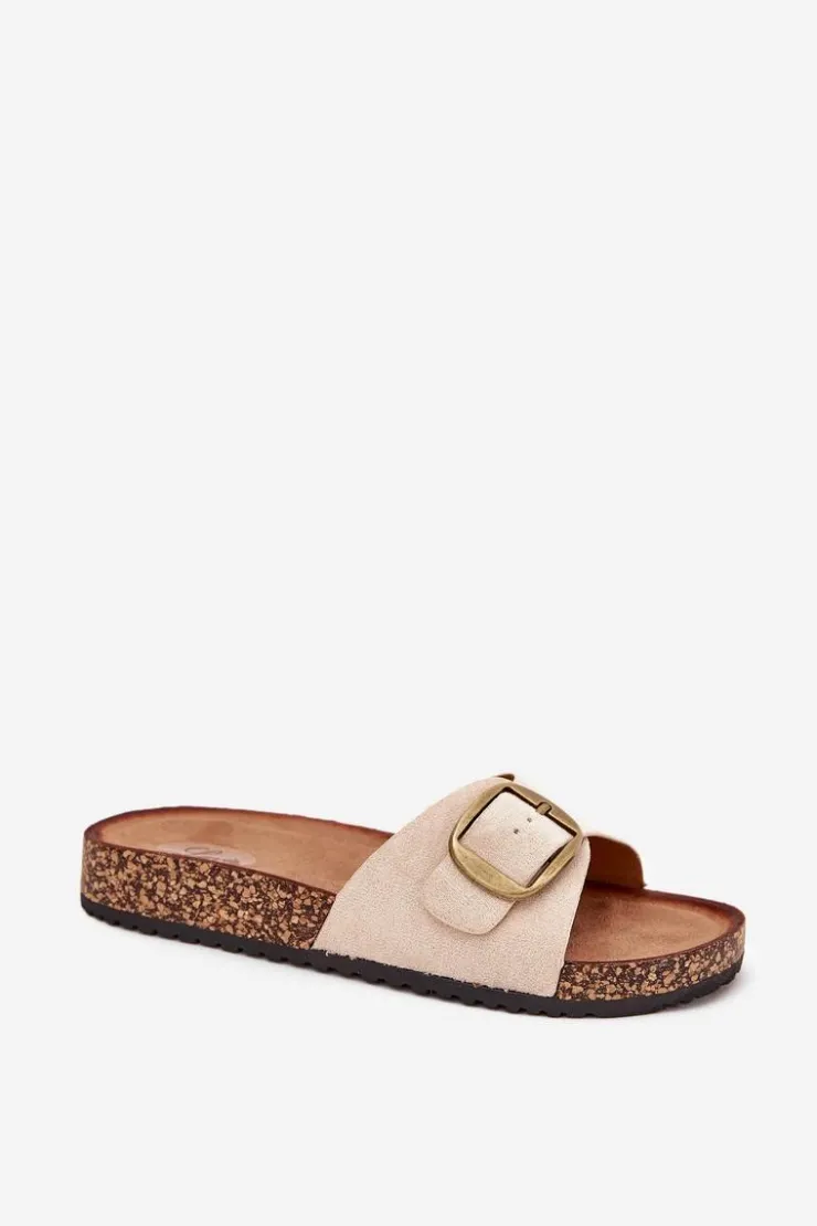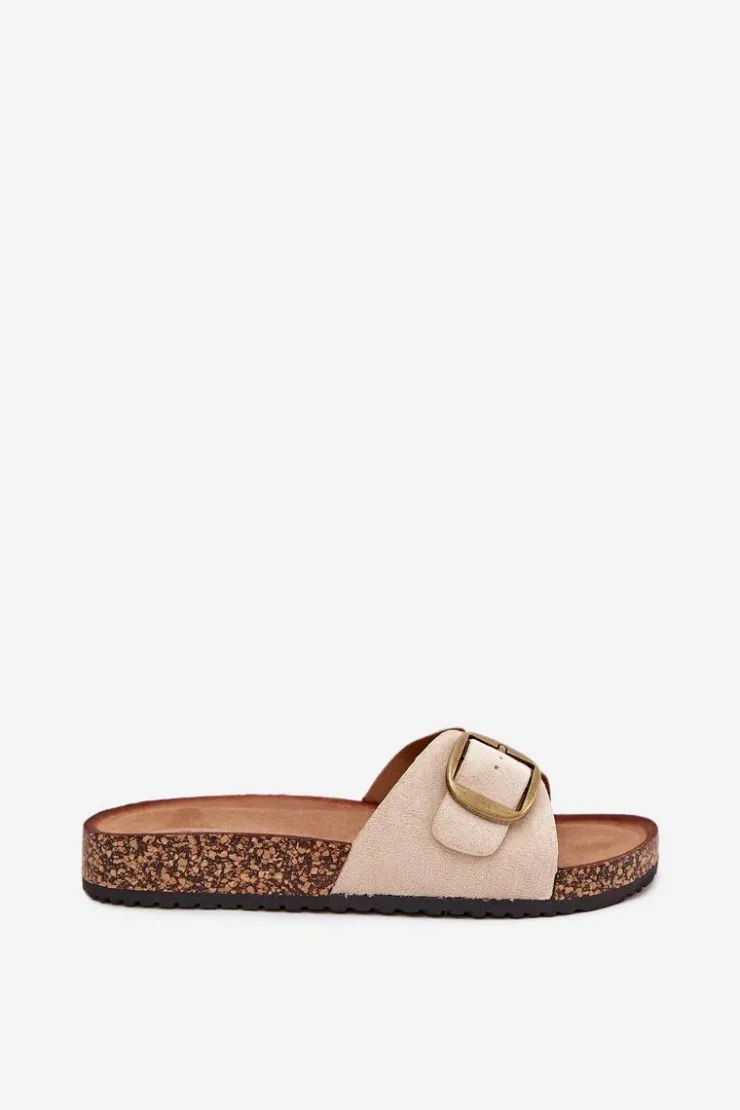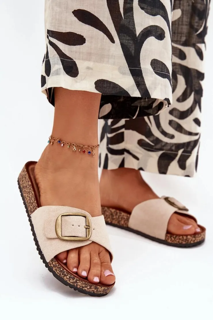 Klapki damskie wykonane z eko zamszu. Osadzone na korkowej platformie. Wyróżniają się klamrą z regulowanym paskiem, który umożliwia idealne dopasowanie do stopy. Profilowana wkładka zapewnia komfort przez cały dzień, a ich prosty wygląd sprawia, że są doskonałe do codziennych stylizacji. Idealne na letnie dni, pasują do sukienek, spódnic czy spodni, wprowadzając lekkość i styl do każdej kreacji. Przy wyborze rozmiaru rosimy sugerować się tabelą rozmiarów.