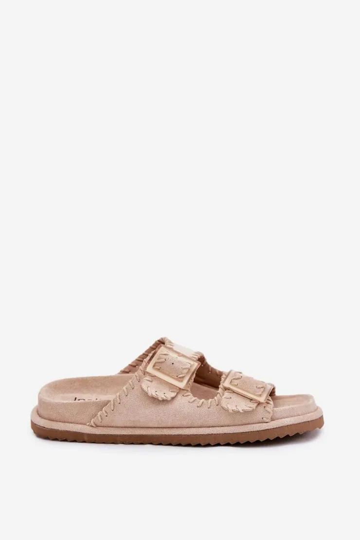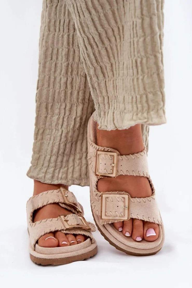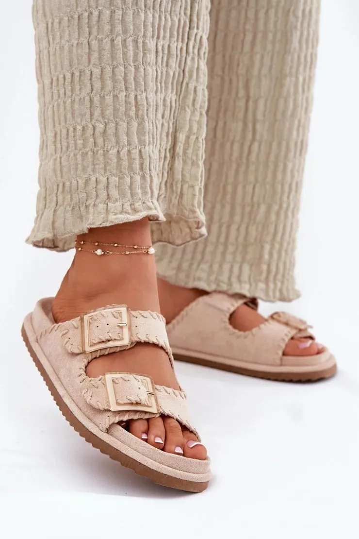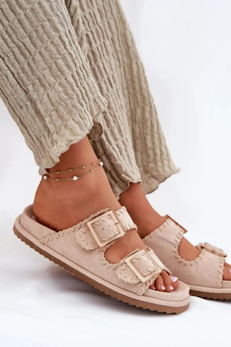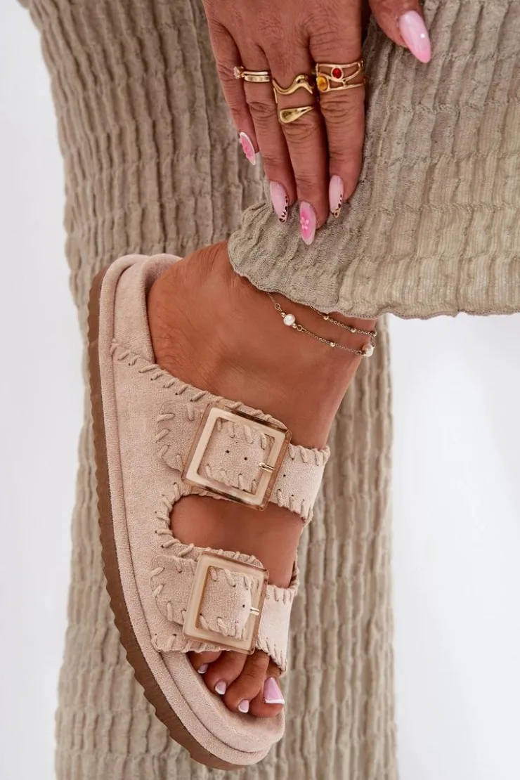 Damskie klapki z eko zamszu, które przyciągają wzrok ozdobnym obszyciem oraz efektownymi klamrami z przodu. Komfort noszenia zapewnia profilowana wkładka, która doskonale dopasowuje się do kształtu stopy. Ten modny model to świetny wybór na letnie dni – idealny zarówno do miejskich stylizacji, jak i na wakacyjne wyjazdy! Przy wyborze rozmiaru rosimy sugerować się tabelą rozmiarów.
