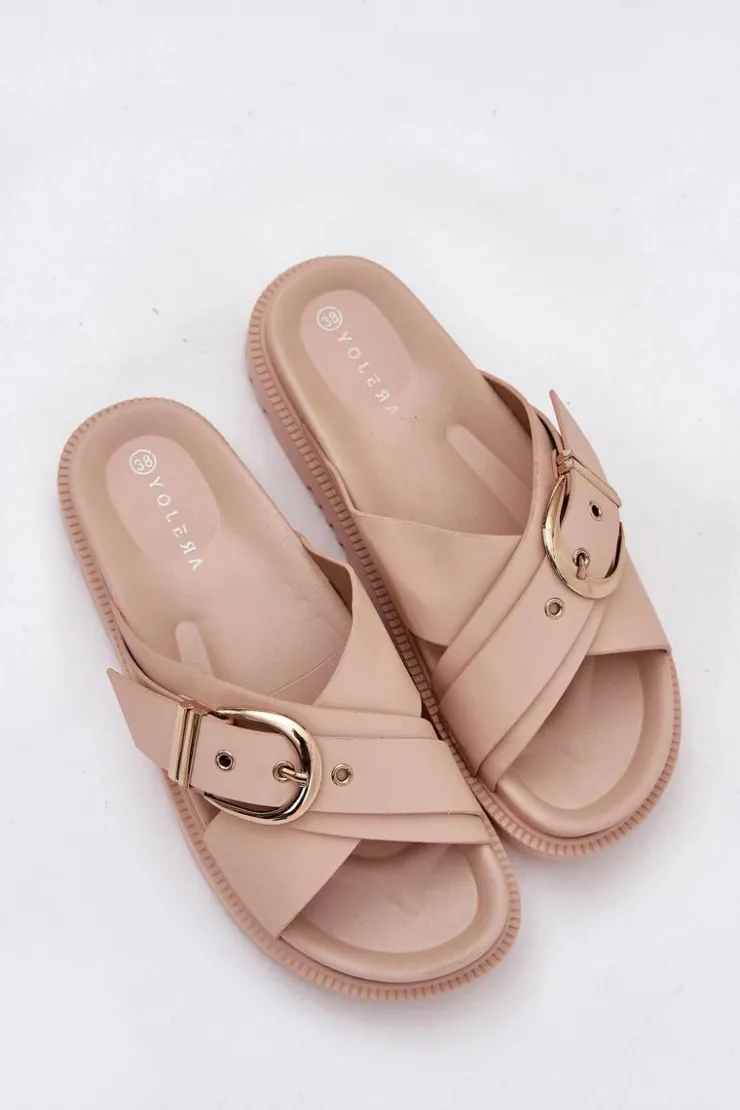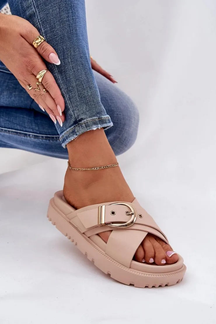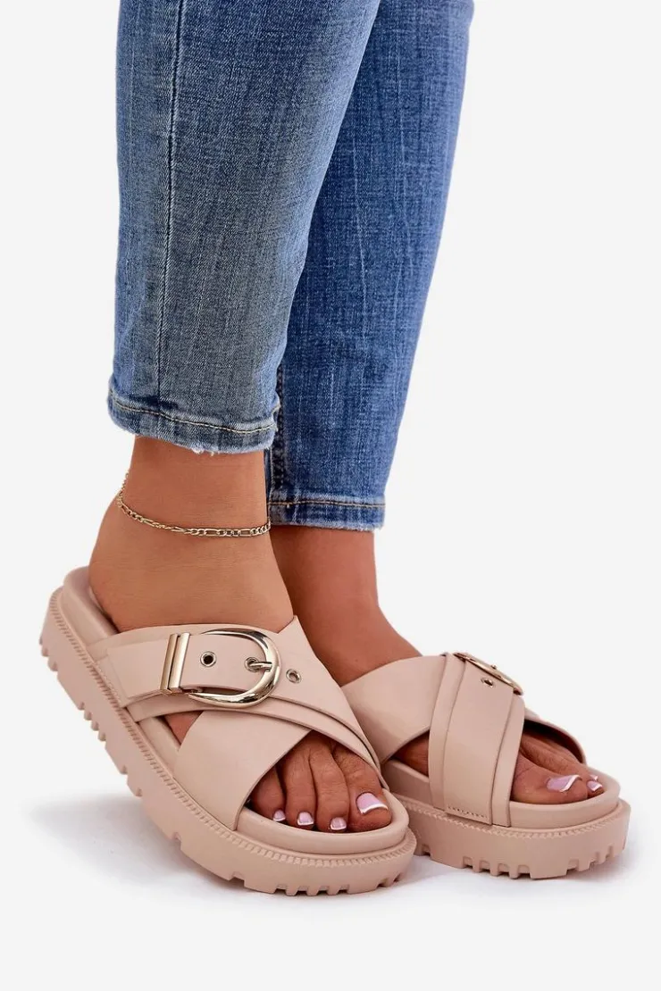 Klapki na platformie wykonane z eko skóry to modna i wygodna propozycja na ciepłe dni. Z przodu znajdują się dwa szerokie, krzyżujące się paski, które dodają nowoczesnego charakteru. Duża klamra na pasku przyciąga uwagę, nadając wyrazistego stylu. Te klapki łączą komfort z eleganckim designem, idealnie pasując do letnich stylizacji. Przy wyborze rozmiaru prosimy sugerować się tabelą rozmiarów.</p