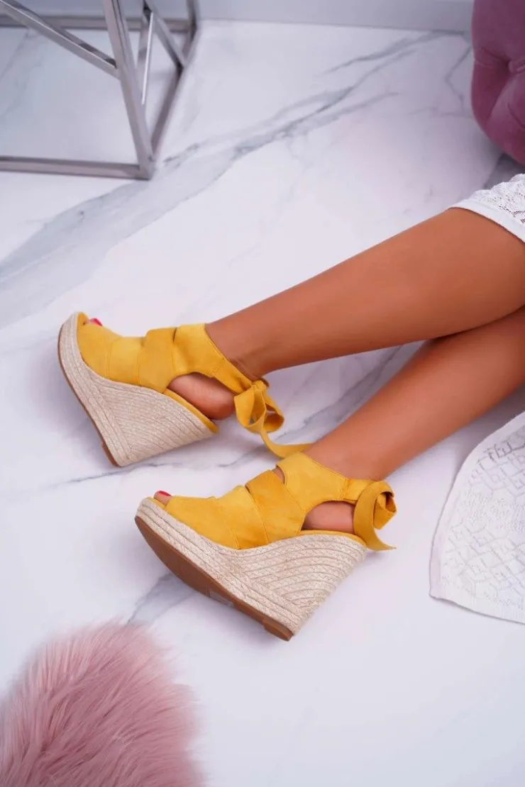Outlet Boto Sandały Damskie Na Koturnie Lniane Wiązane Żółte Cantare