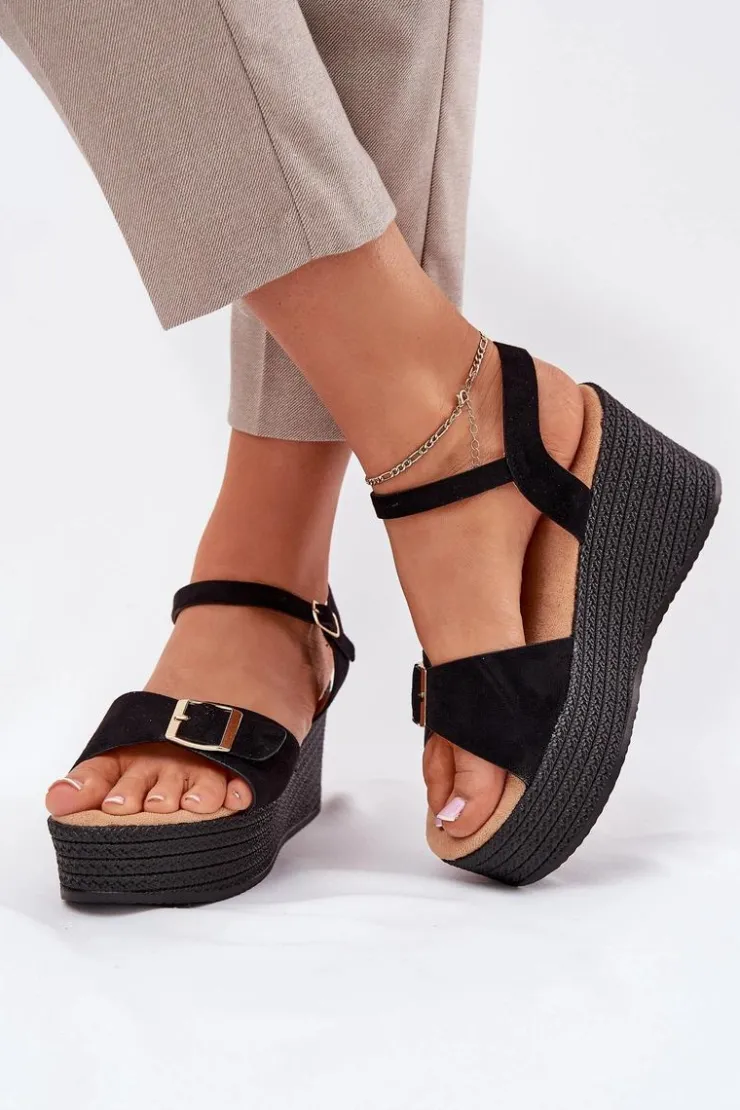Damskie sandały wykonane z eko zamszu. Osadzone na koturnie i platformie z imitacją plecionki, zapewniają wygodę oraz stabilność przez cały dzień. Z przodu znajdują się ozdobna klamra, która dodaje im unikalnego charakteru. Model zapinany na sprzączkę umożliwia idealne dopasowanie do stopy, a miękka wkładka gwarantuje komfort. Te sandały będą doskonałym uzupełnieniem letnich stylizacji. Przy wyborze rozmiaru prosimy sugerować się tabelą rozmiarów.