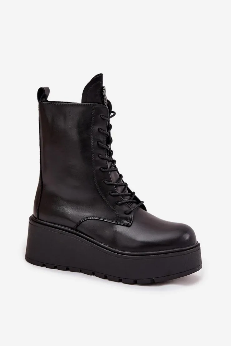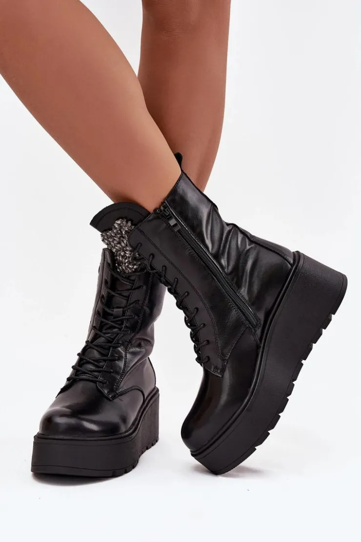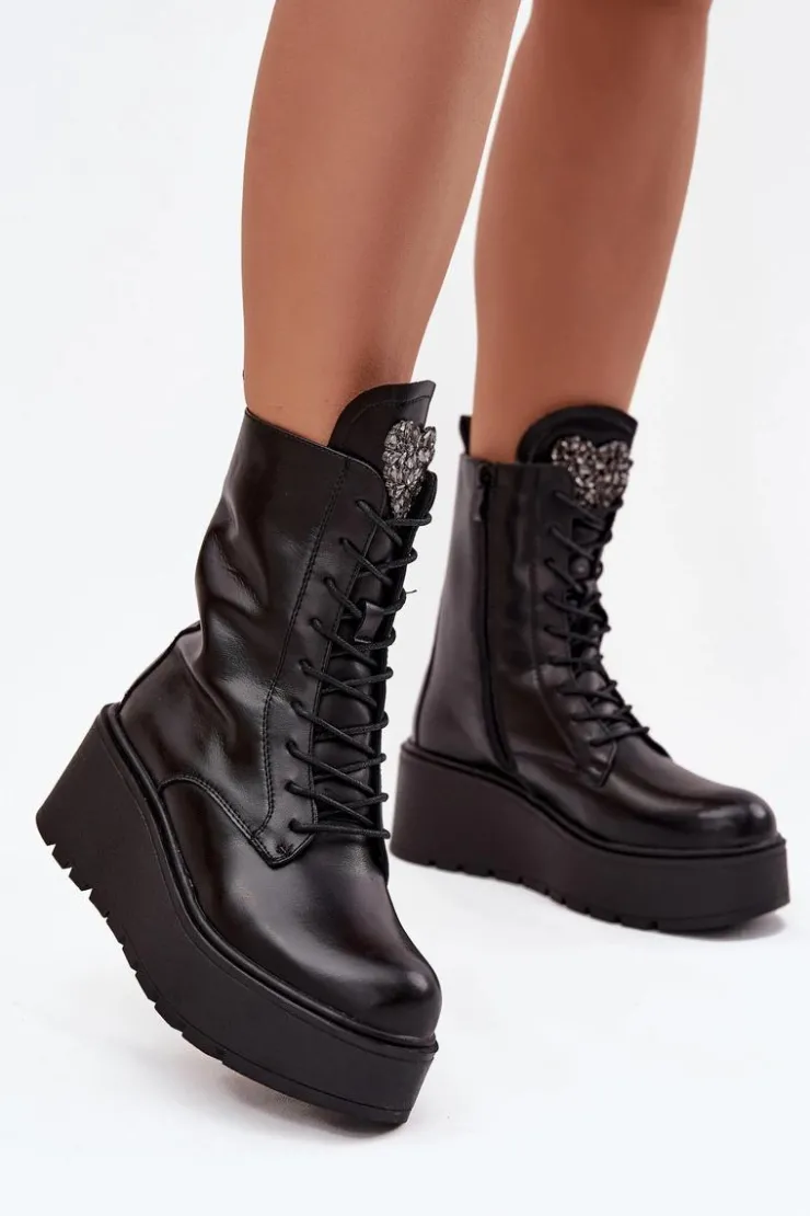 Botki damskie marki Jezzi to propozycja dla kobiet, które cenią wygodę połączoną z modnym wyglądem. Wykonane z naturalnej skóry, wyróżniają się trwałością oraz eleganckim wyglądem. Osadzone na stabilnym koturnie z platformą, optycznie wydłużają sylwetkę, jednocześnie zapewniając komfort podczas noszenia. Wnętrze butów zostało ocieplone, dzięki czemu sprawdzą się one idealnie w chłodniejsze dni sezonu jesienno-zimowego. Model posiada sznurowanie i boczny zamek, co ułatwia dopasowanie oraz szybkie zakładanie. Szczególną uwagę zwracają błyszczące kryształki umieszczone na języku, układające się w kształt serca – ten ozdobny detal dodaje wyjątkowego uroku i podkreśla ich kobiecy charakter. To obuwie, które doskonale pasuje zarówno do codziennych, jak i bardziej eleganckich stylizacji, stając się oryginalnym akcentem w garderobie. Przy wyborze rozmiaru prosimy sugerować się tabelą rozmiarów.