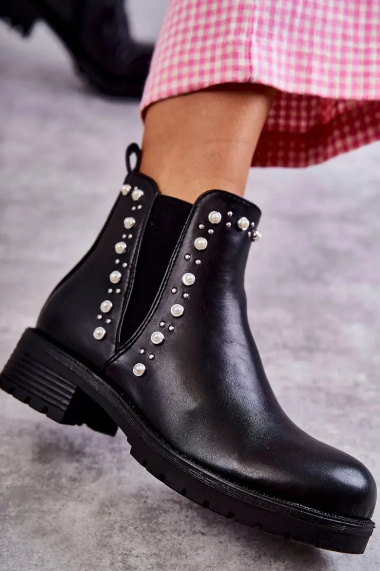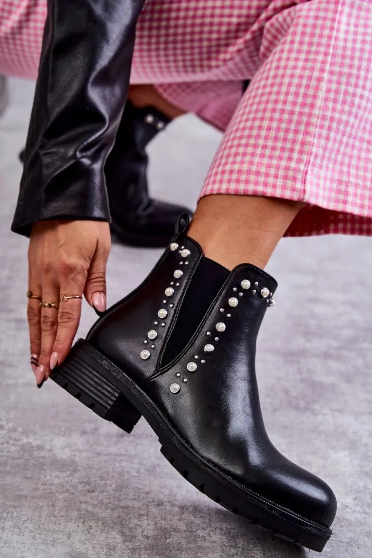 Wsuwane botki damskie zostały osadzone na płaskim obcasie i delikatnej platformie. Wykonane z eko skóry z ozdobami na cholewce w postaci ćwieków i perełek. Zapinane na suwak. Botki te posiadają ocieplenie w postaci koca obuwniczego. Model klasyczny, idealny do wielu stylizacji. Koniecznie musisz je mieć! Przy wyborze rozmiaru prosimy sugerować się tabelą rozmiarów.