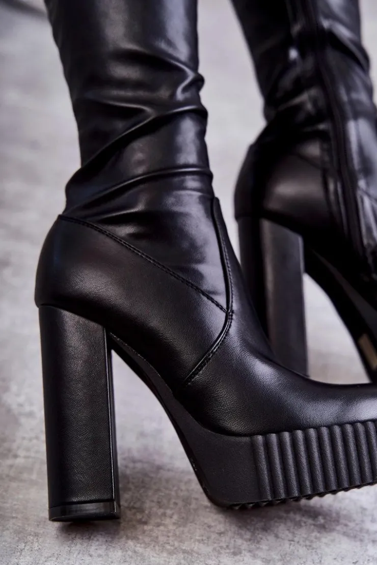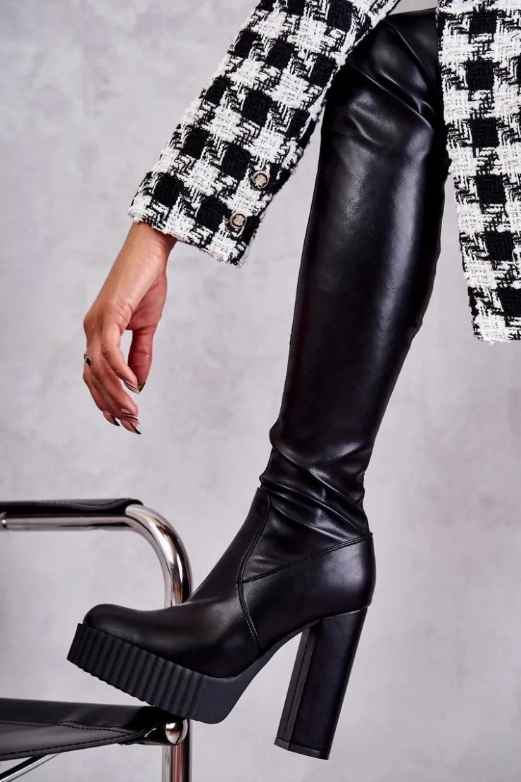 Wyjątkowe kozaki damskie z cholewką za kolano wykonaną z eko skóry. Model wsuwany, z dodatkowym suwakiem z boku cholewki. Kozaki osadzono na platformie oraz obcasie w postaci słupka. W środku ocieplone kocem obuwniczym. Dodatkowo posiadają usztywniany zapiętek. Świetnie będą prezentować się ze spódniczkami oraz sukienkami mini. Przy wyborze rozmiaru prosimy sugerować się tabelą rozmiarów.