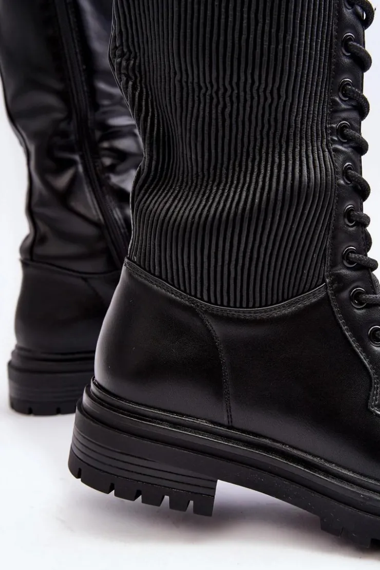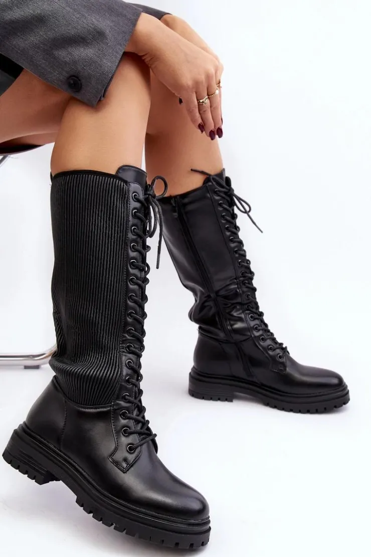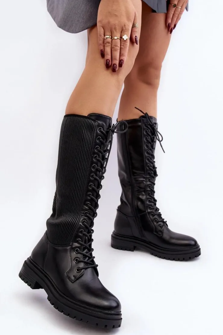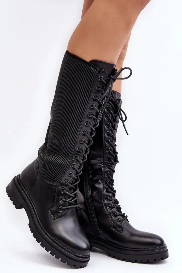 Damskie kozaki — glany zostały wykonane z eko skóry. Osadzone na płaskim, stabilnym obcasie. Cholewka przed kolano. Zapinane na suwak. Z przodu na całej długości sznurowanie. Środek ocieplony kocem obuwniczym. Noski zaokrąglone. Przy wyborze rozmiaru prosimy kierować tabelą rozmiarów.