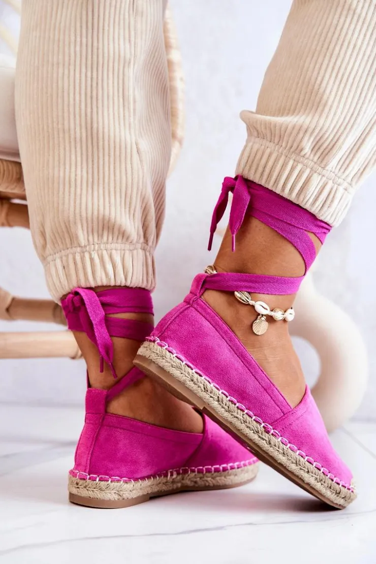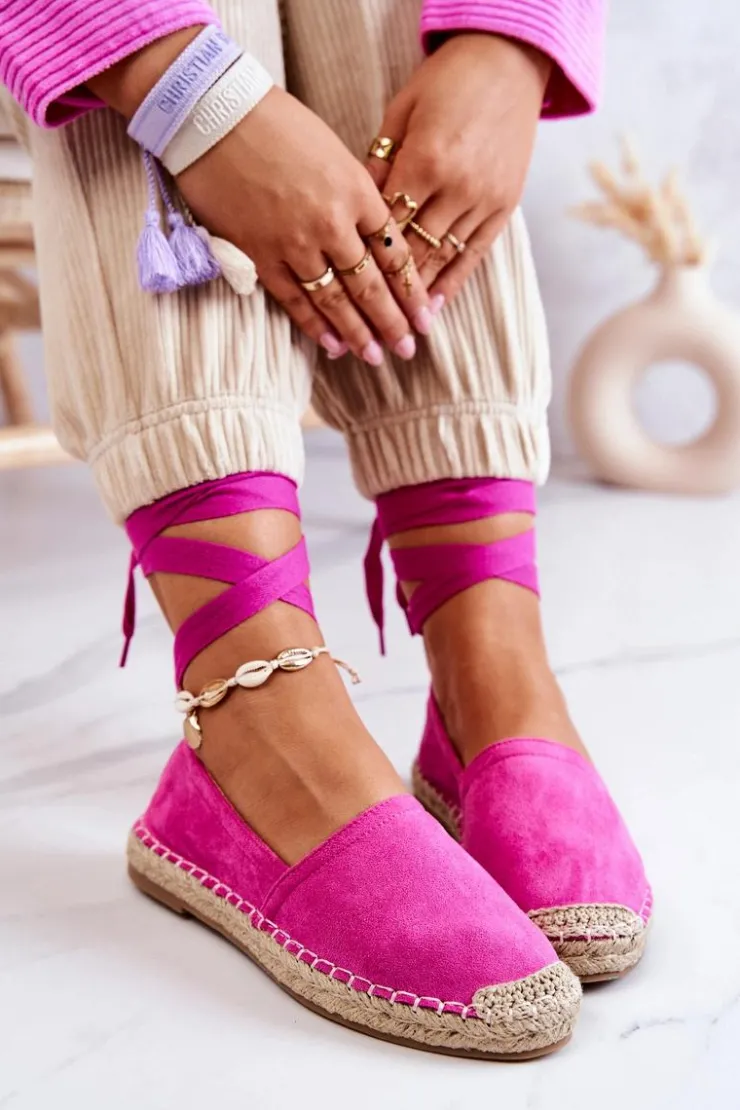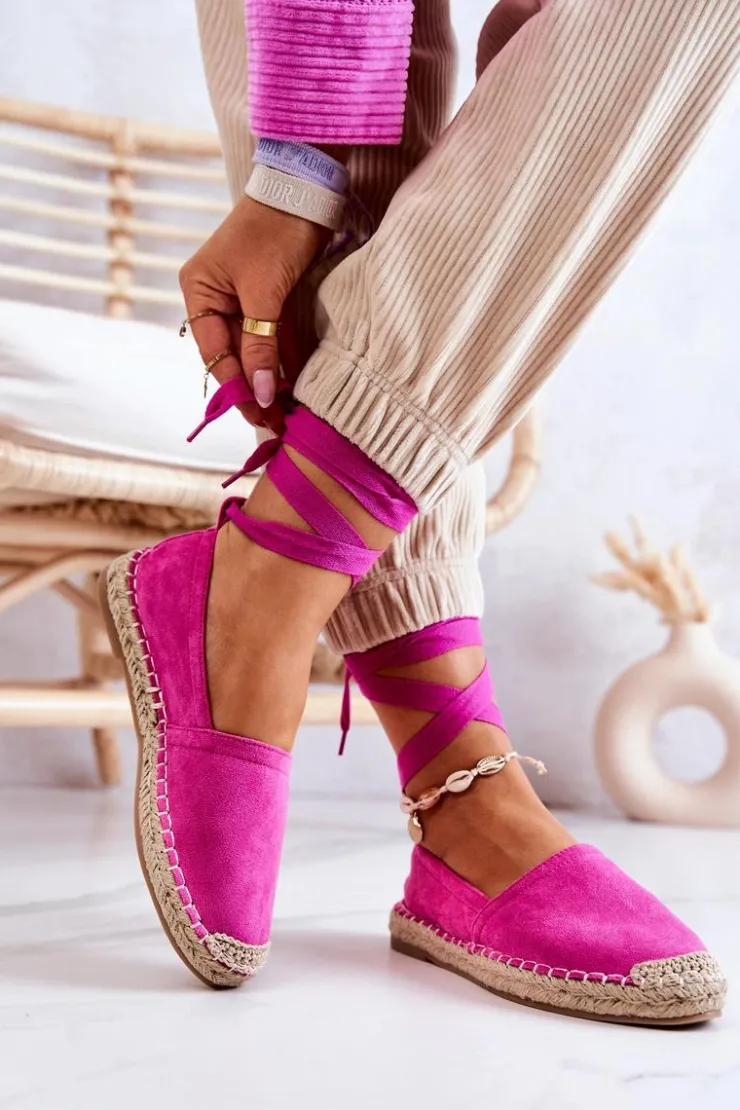 Klasyczne espadryle na płaskiej podeszwie. Wkładka wykonana z eko skóry. Ciekawy model, który powinnaś mieć w swojej garderobie! Eko zamszowe espadryle są wiązane wokół nogi. Materiałowy pasek jest wyciągany. Podeszwa antypoślizgowa oraz pleciona. Koniecznie sprawdź także pozostałą naszą kolekcję damskich espadryli.