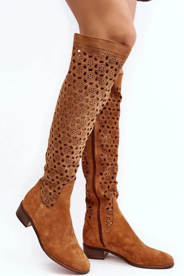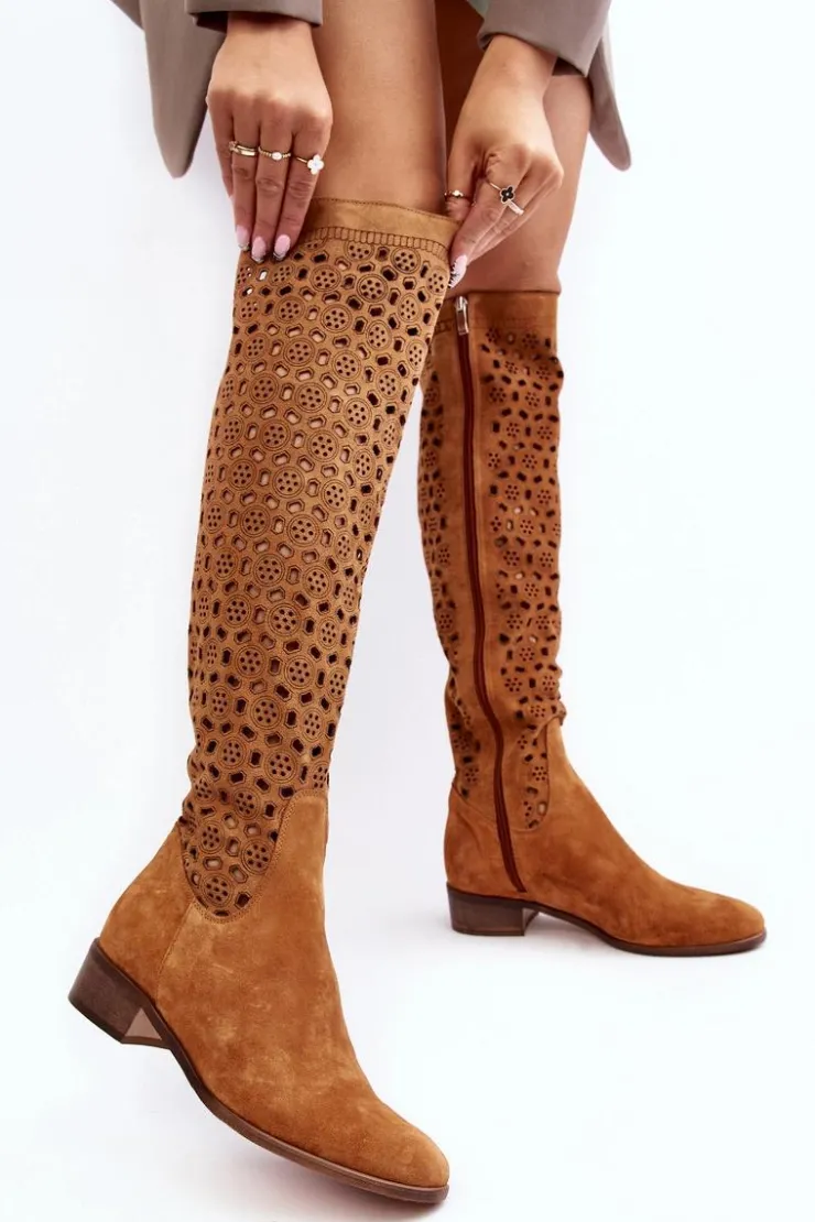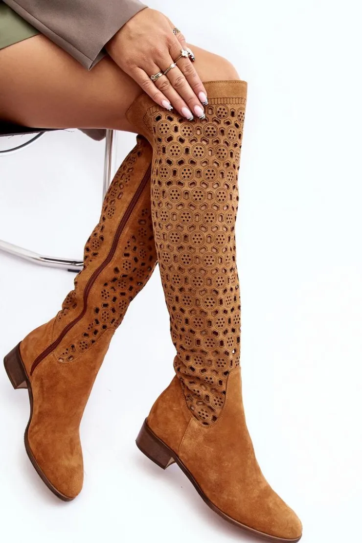 Piękne kozaki damskie od polskiego producenta. Każdy model wykonany jest z naturalnych skór wysokiej jakości. Ażurowe kozaki wykonane są z miękkiego, naturalnego zamszu. Model z zaokrąglonym noskiem. Cholewka na całości zapinana na suwak. Ozdobne wycięcie na górze. Płaski obcas oraz skórzana, miękka wkładka to gwarancja stabilności oraz komfortu podczas użytkowania. Idealny model na sezon wiosenno-letni! Przy wyborze rozmiaru prosimy sugerować się tabelą rozmiarów.