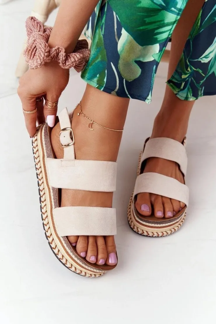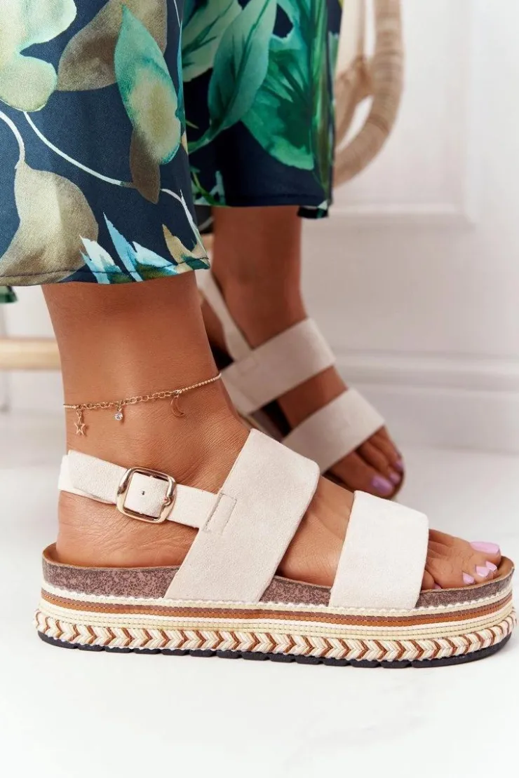 Wyjątkowe sandały na zdobionej platformie. Sandały zostały wykonane z eko zamszu, posiadają delikatnie profilowaną wkładkę. Wyjątkowy model wzbogaci Twoją letnią garderobę! Przy wyborze rozmiaru prosimy sugerować się tabelą rozmiarów.
