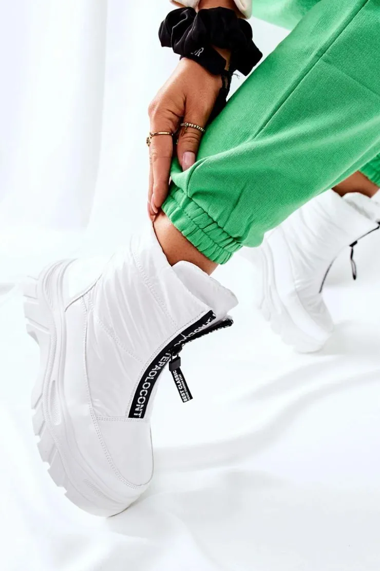 Damskie botki wykonane ze skóry ekologicznej oraz materiału tekstylnego. Zapinane z przodu cholewki na zamek. Ocieplane kocem obuwniczym.