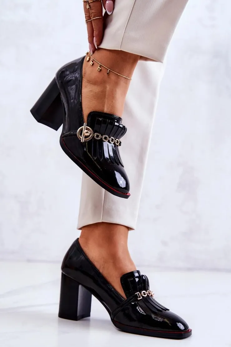 Czółenka wykonane z lakierowanej eko skóry. Posiadają miękką, wykonaną z naturalnej skóry wkładkę. Osadzone na masywnym obcasie typu słupek. Dzięki wyjątkowemu designowi ubierzesz je do wielu stylizacji. Model wsuwany. Na przodzie znajdują się ozdobne elementy w postaci łańcucha oraz pojedynczych pasków z eko skóry. Koniecznie sprawdź pozostałe czółenka dostępne w naszej ofercie! Przy wyborze rozmiaru prosimy sugerować się tabelą rozmiarów.