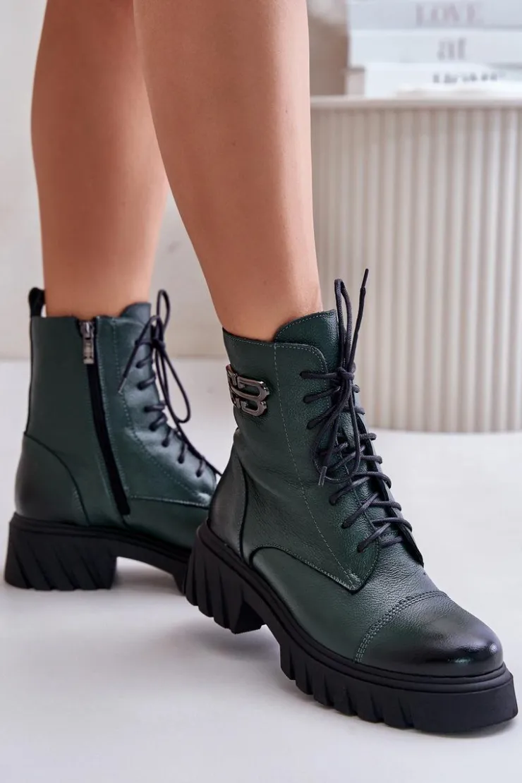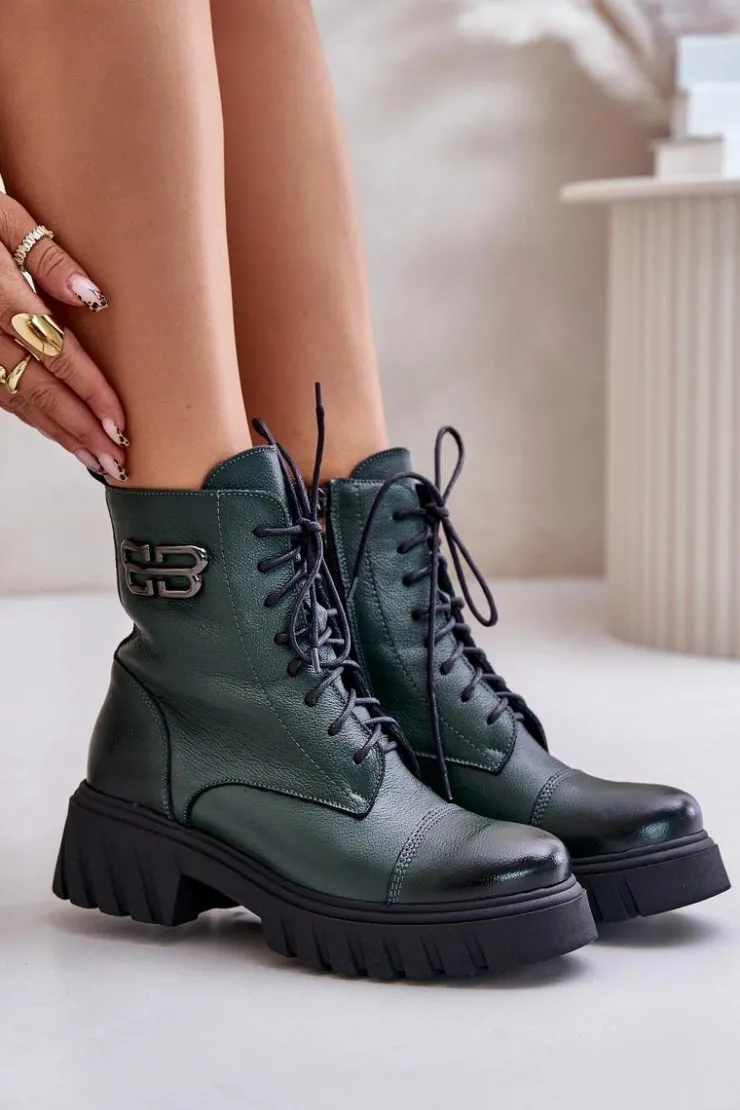 Botki damskie wykonane ze skóry naturalnej. Osadzone na masywnym, płaskim obcasie i platformie. Posiadają zarówno sznurowanie, jak i zamek, co zapewnia wygodę zakładania i dopasowanie do stopy. Z boku cholewki ozdobny, złoty detal, który dodaje elegancji. Wnętrze ocieplone kocem obuwniczym. Idealne do jesiennych i zimowych stylizacji, te botki łączą elegancję z funkcjonalnością. Przy wyborze rozmiaru prosimy kierować się tabelą rozmiarów