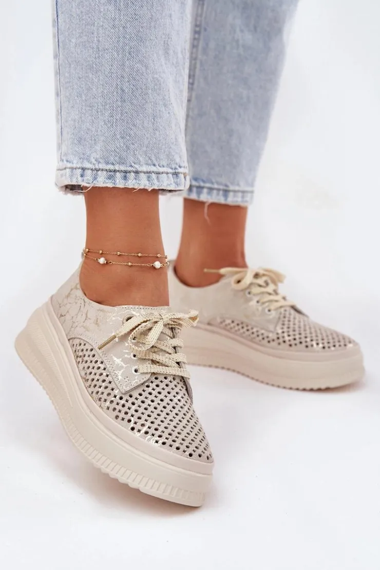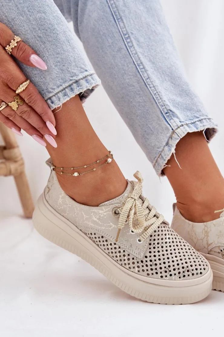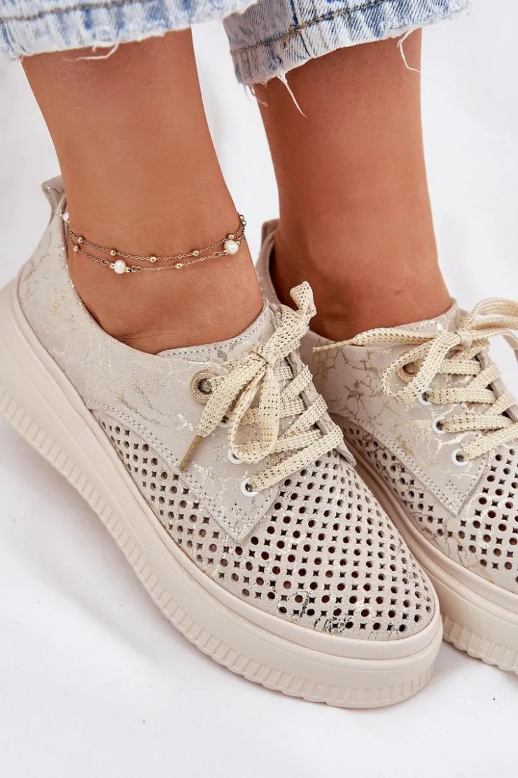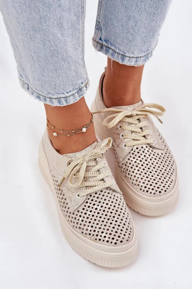 Ażurowe półbuty damskie wykonane z naturalnego zamszu to połączenie elegancji i wygody. Osadzone na platformie, oferują lekkość i stabilność, zapewniając komfort przez cały dzień. Skórzana, miękka wkładka dba o odpowiednią amortyzację stóp. Model charakteryzuje się ażurowym wzorem, który nadaje lekkości i oryginalnego stylu. Te eleganckie i stylowe półbuty będą doskonałym wyborem do codziennych, jak i bardziej formalnych stylizacji. Przy wyborze rozmiaru prosimy sugerować się tabelą rozmiarów.
