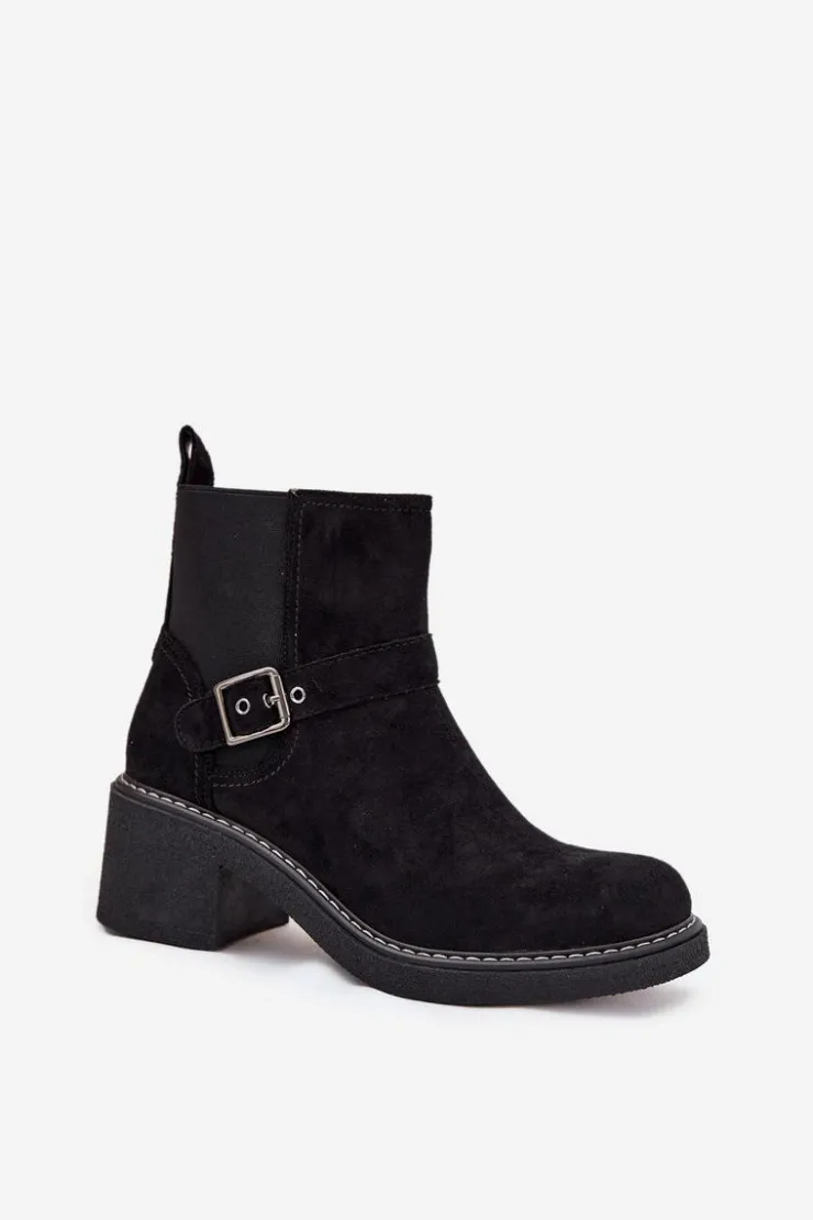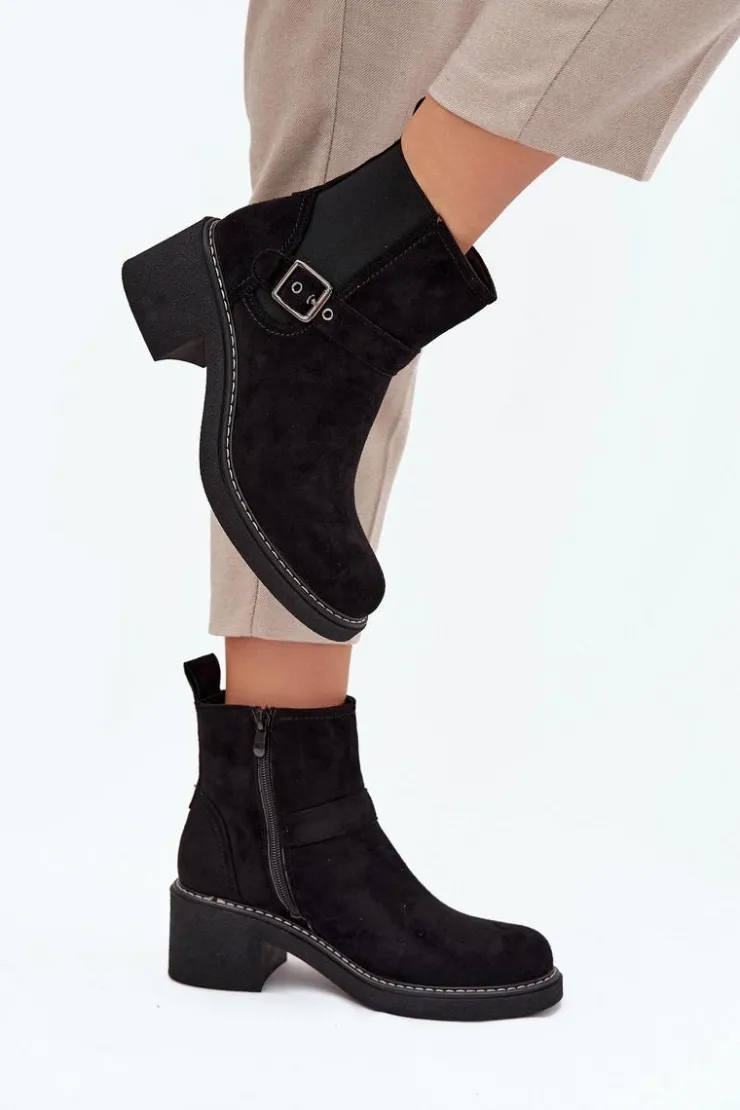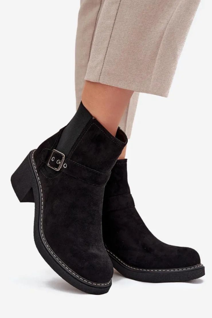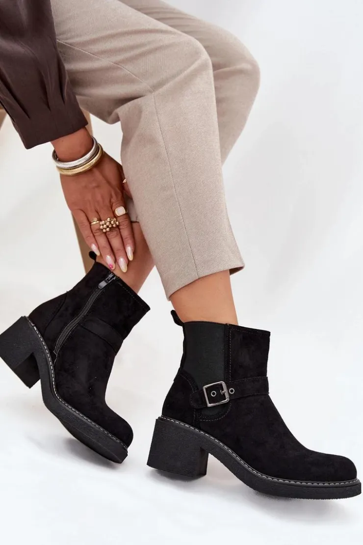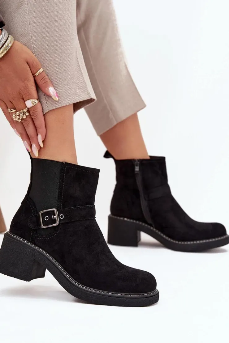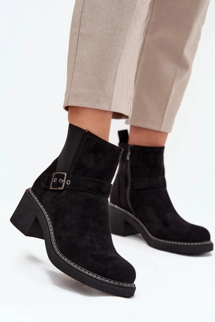 Damskie botki z eko zamszu to świetny wybór na każdą okazję! Posiadają wygodny obcas w formie klocka, który zapewnia stabilność, a zaokrąglone noski dodają im uroku. Pasek z klamrą na cholewce to modny detal, a zamek błyskawiczny sprawia, że łatwo je założyć. Idealne do codziennych stylizacji połączenie wygody i klasycznego wyglądu! Przy wyborze rozmiaru prosimy sugerować się tabelą rozmiarów.