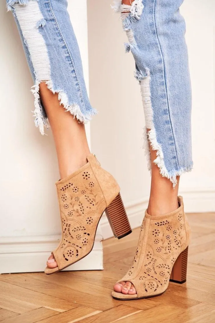 Spraw sobie odrobinę luksusu i wybierz nasze wspaniałe botki na słupku z odkrytymi palcami. Niepowtarzalny styl z ażurowymi wycięciami. Botki posiadają suwak ułatwiający zakładanie. Znajdą swe zastosowanie w wielu stylizacjach, zwiewne sukienki czy spodnie – pasują do wszystkiego! Przy wyborze rozmiaru prosimy sugerować się tabelą rozmiarów.