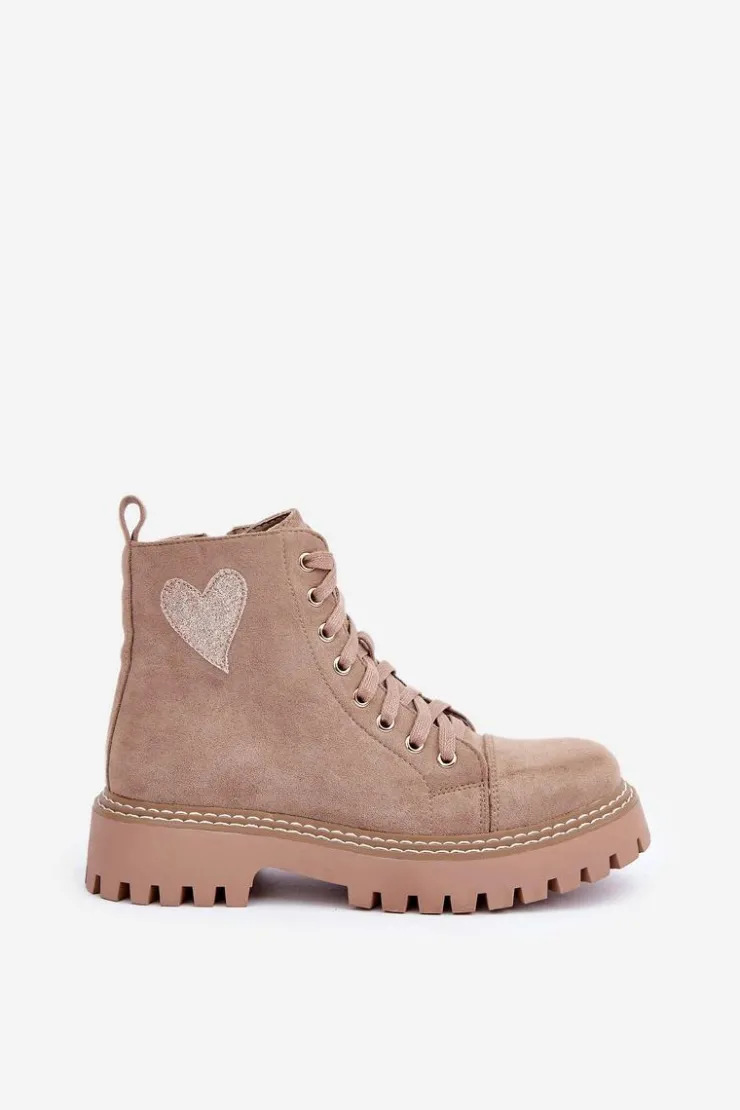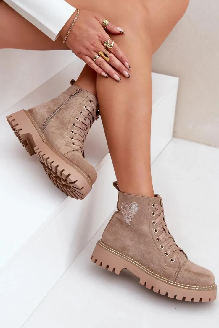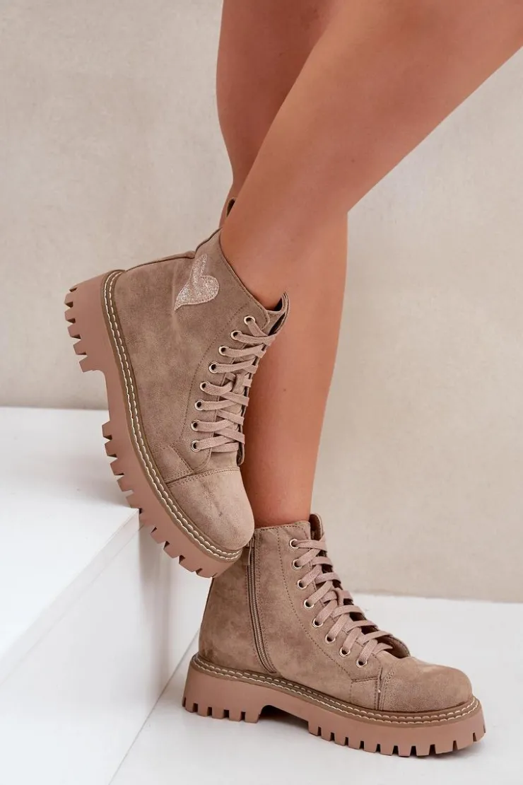 Damskie botki wykonane z eko zamszu. Model zapinany na zamek i dodatkowo sznurowany, co zapewnia doskonałe dopasowanie do stopy. Zaokrąglone noski gwarantują komfort podczas noszenia. Cholewka ozdobiona błyszczącym sercem dodaje uroku i unikalnego charakteru. Idealne na co dzień, świetnie uzupełnią casualowe stylizacje. Przy wyborze rozmiaru prosimy sugerować się tabelą rozmiarów.