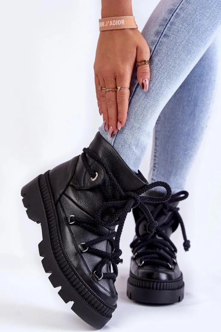 Świetne, damskie śniegowce zostały wykonane z wysokiej jakości skór. Model posiada grube, solidne sznurowanie. Botki zostały osadzone na płaskim obcasie oraz platformie ze żłobieniami. Śniegowce posiadają ocieplenie w postaci futerka oraz usztywniany zapiętek. Ten model z pewnością przyda się każdej miłośniczce ciepłego i wygodnego obuwia! Przy wyborze rozmiaru prosimy sugerować się tabelą rozmiarów.