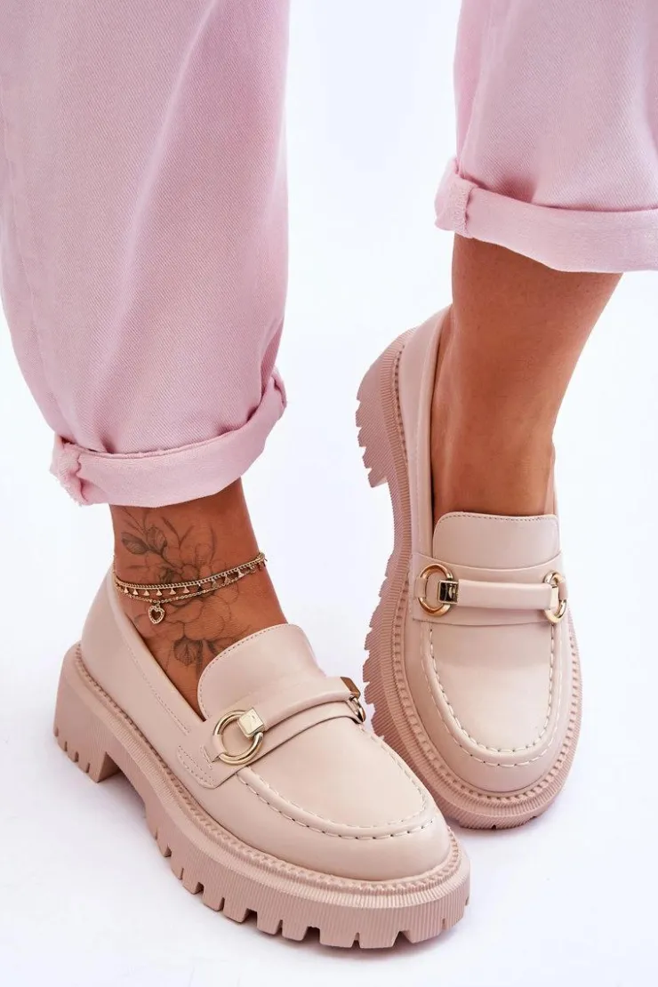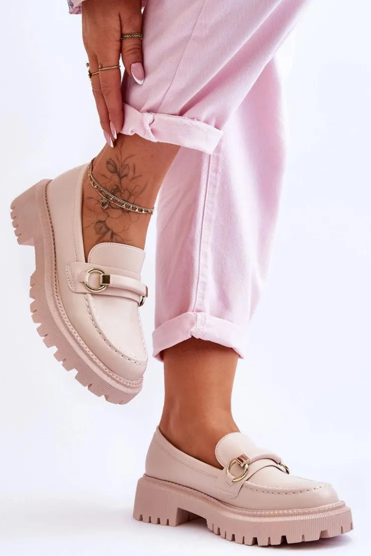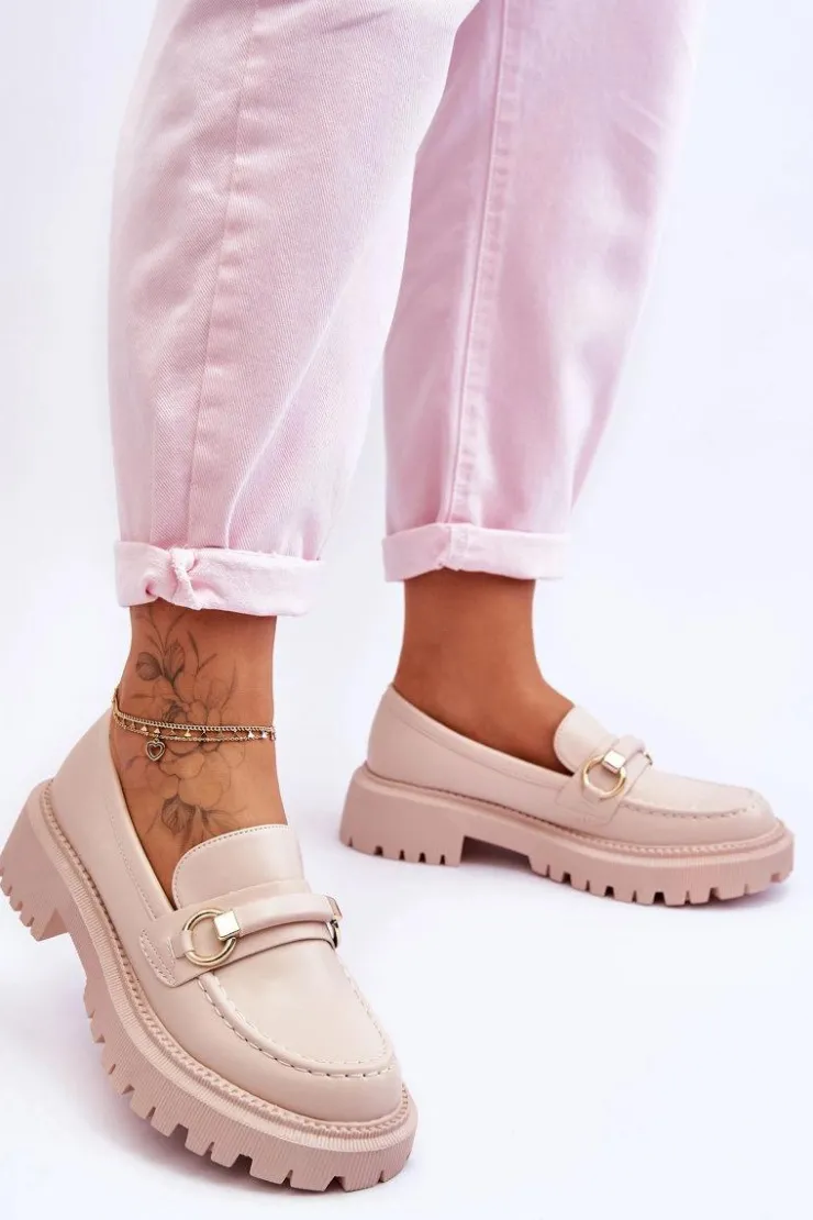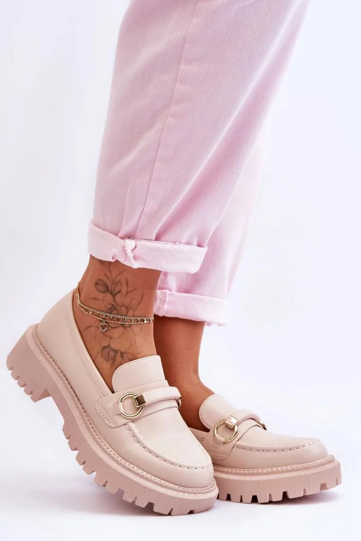 Damskie mokasyny osadzone na masywnej platformie i płaskim obcasie świetnie wpasują się w wiele stylizacji! To obuwie jest idealne na wiele sezonów! Mokasyny zostały wykonane z eko skóry. Posiadają delikatnie usztywniany zapiętek. Na pasku znajduje się ozdoba. Mokasyny posiadają także eko skórzaną wkładkę. Przy wyborze rozmiaru prosimy sugerować się tabelą rozmiarów.