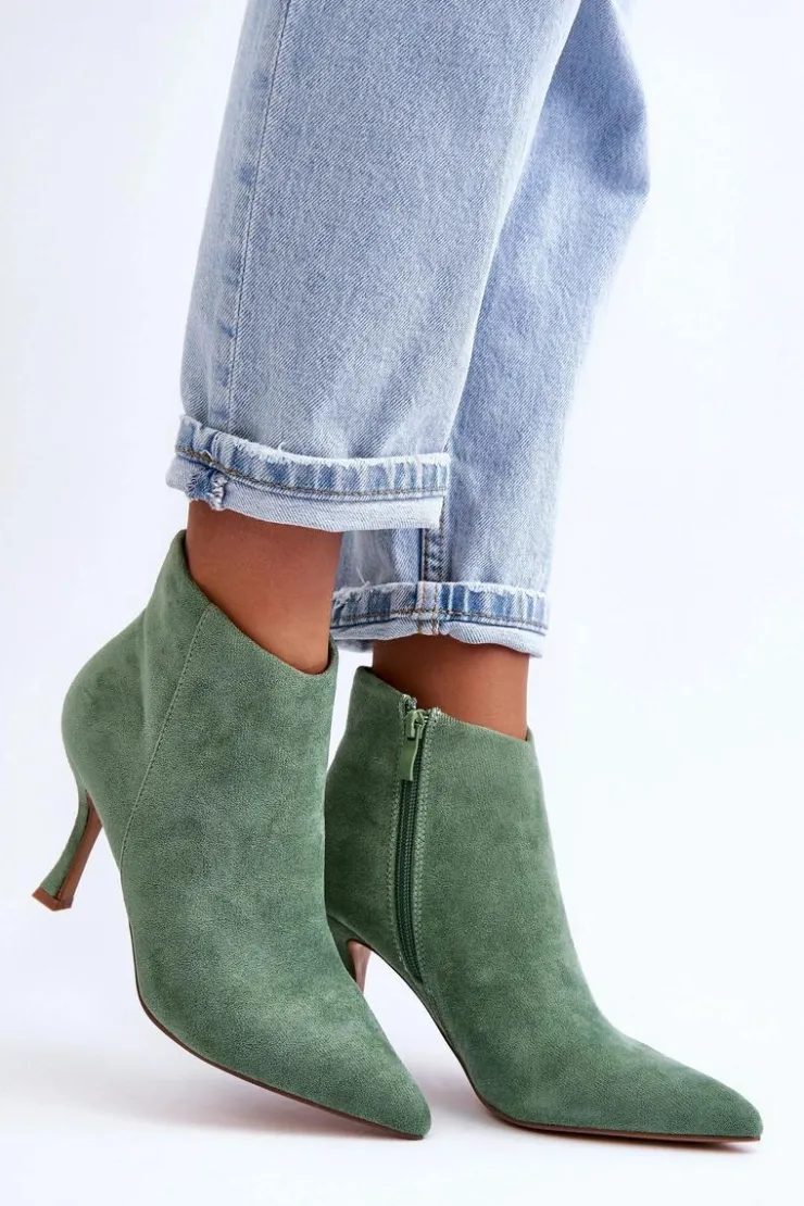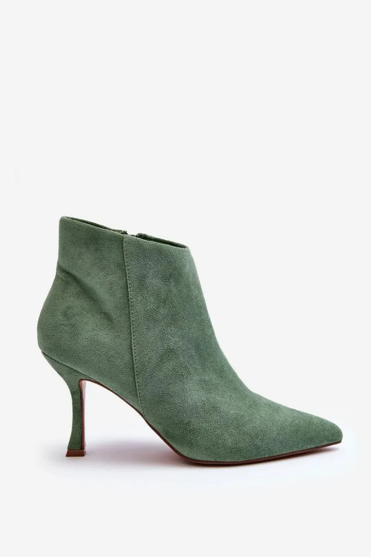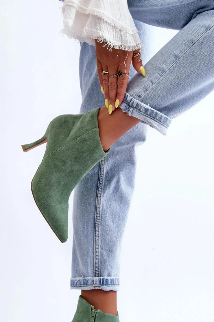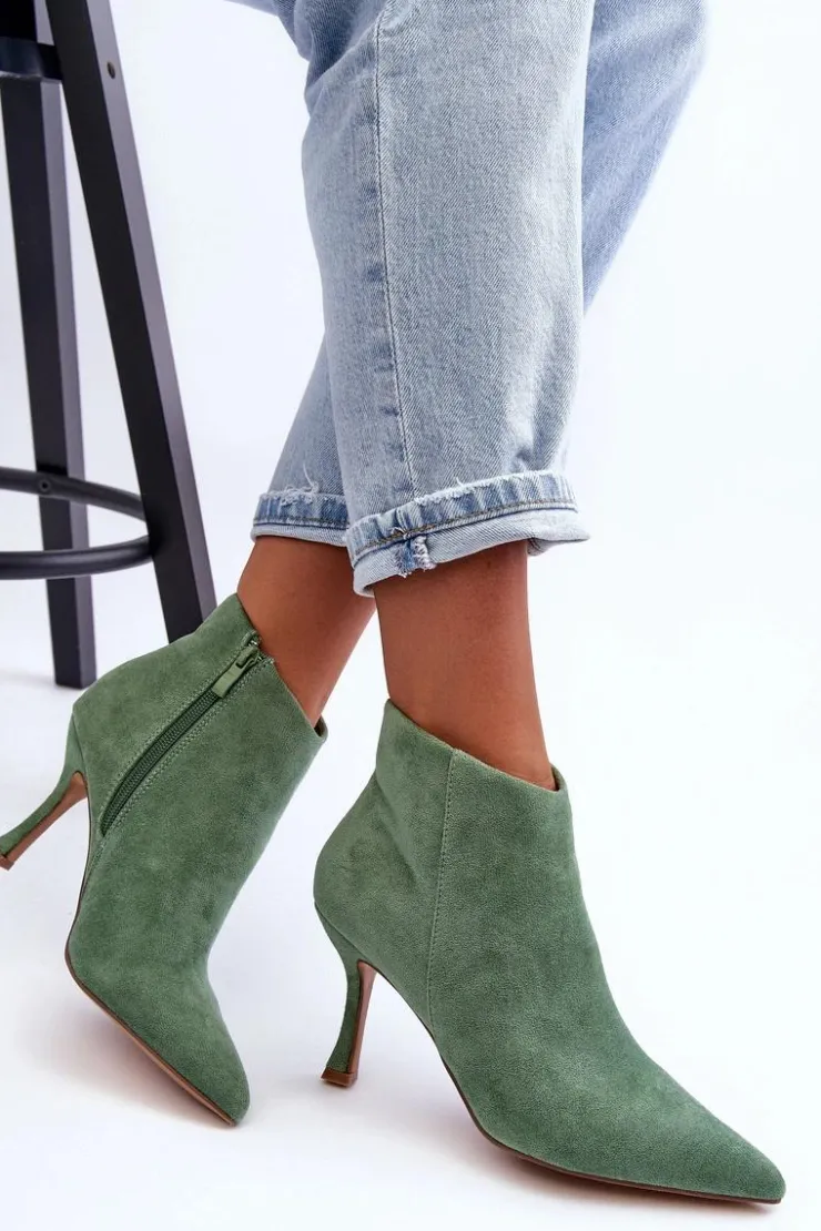 Eleganckie botki damskie zostały wykonane z eko zamszu. Model osadzony na obcasie w postaci szpilki, z noskiem w szpic świetnie wysmukli nogi. Botki są zapinane z boku na suwak. Zapiętek w tych botkach jest usztywniany. Model ten świetnie sprawdzi się w wielu stylizacjach np.: do sukienek, spódnic czy spodni. Te botki koniecznie powinny znaleźć się w Twojej szafie! Przy wyborze rozmiaru prosimy sugerować się tabelą rozmiarów.