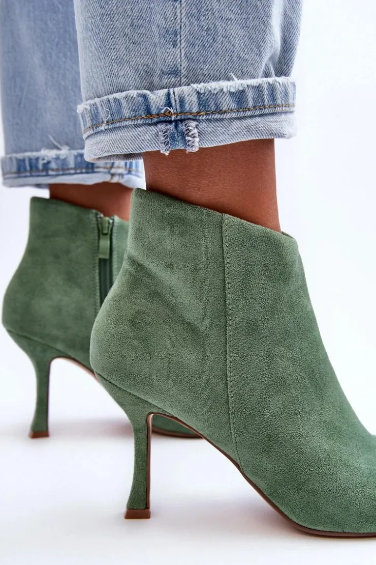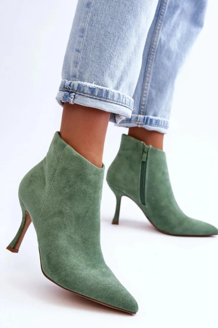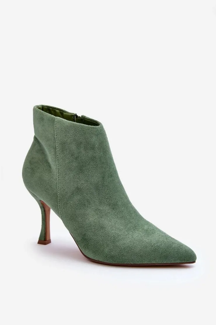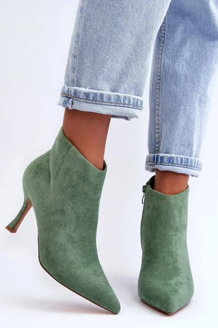 Eleganckie botki damskie zostały wykonane z eko zamszu. Model osadzony na obcasie w postaci szpilki, z noskiem w szpic świetnie wysmukli nogi. Botki są zapinane z boku na suwak. Zapiętek w tych botkach jest usztywniany. Model ten świetnie sprawdzi się w wielu stylizacjach np.: do sukienek, spódnic czy spodni. Te botki koniecznie powinny znaleźć się w Twojej szafie! Przy wyborze rozmiaru prosimy sugerować się tabelą rozmiarów.