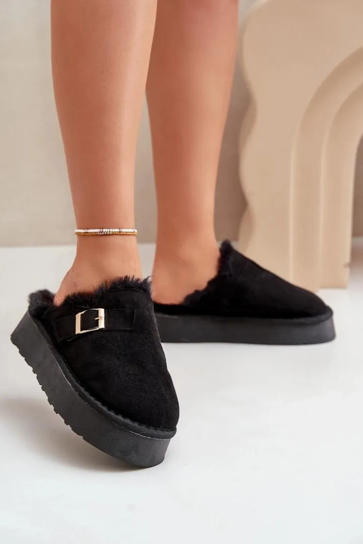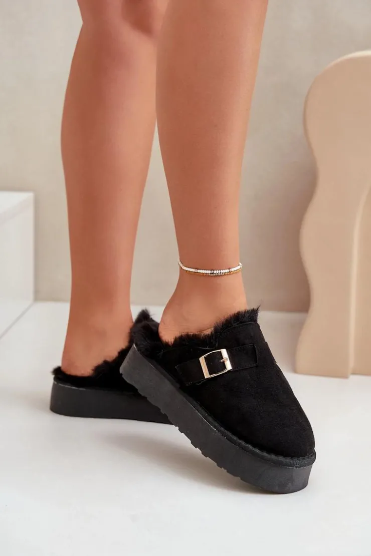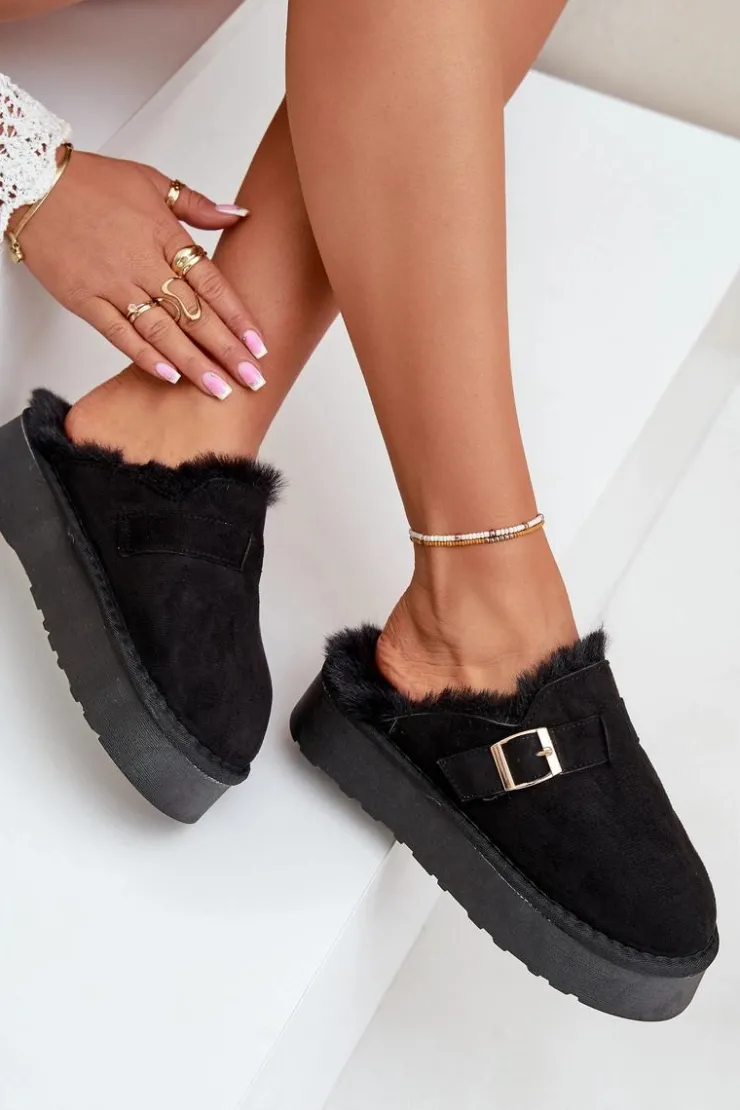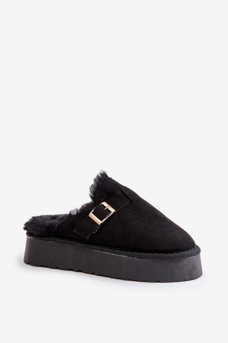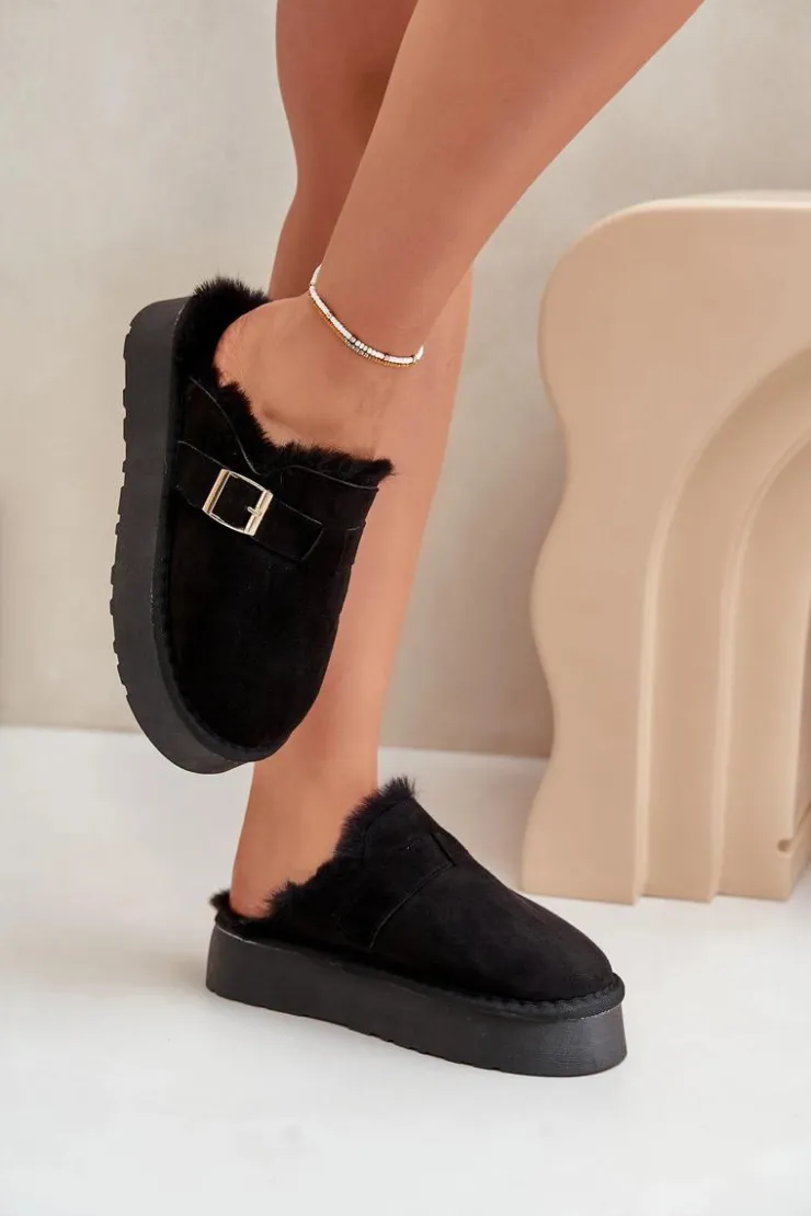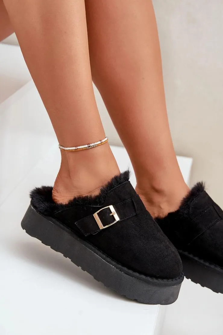 Stylowe damskie kapcie na grubej podeszwie to idealny wybór na chłodniejsze dni. Ocieplane miękkim futerkiem, zapewniają wyjątkowy komfort i ciepło. Ozdobione paskiem ze złotą klamrą. Idealne do noszenia w domu i szybkie wyjścia na zewnątrz. Przy wyborze rozmiaru prosimy kierować tabelą rozmiarów.