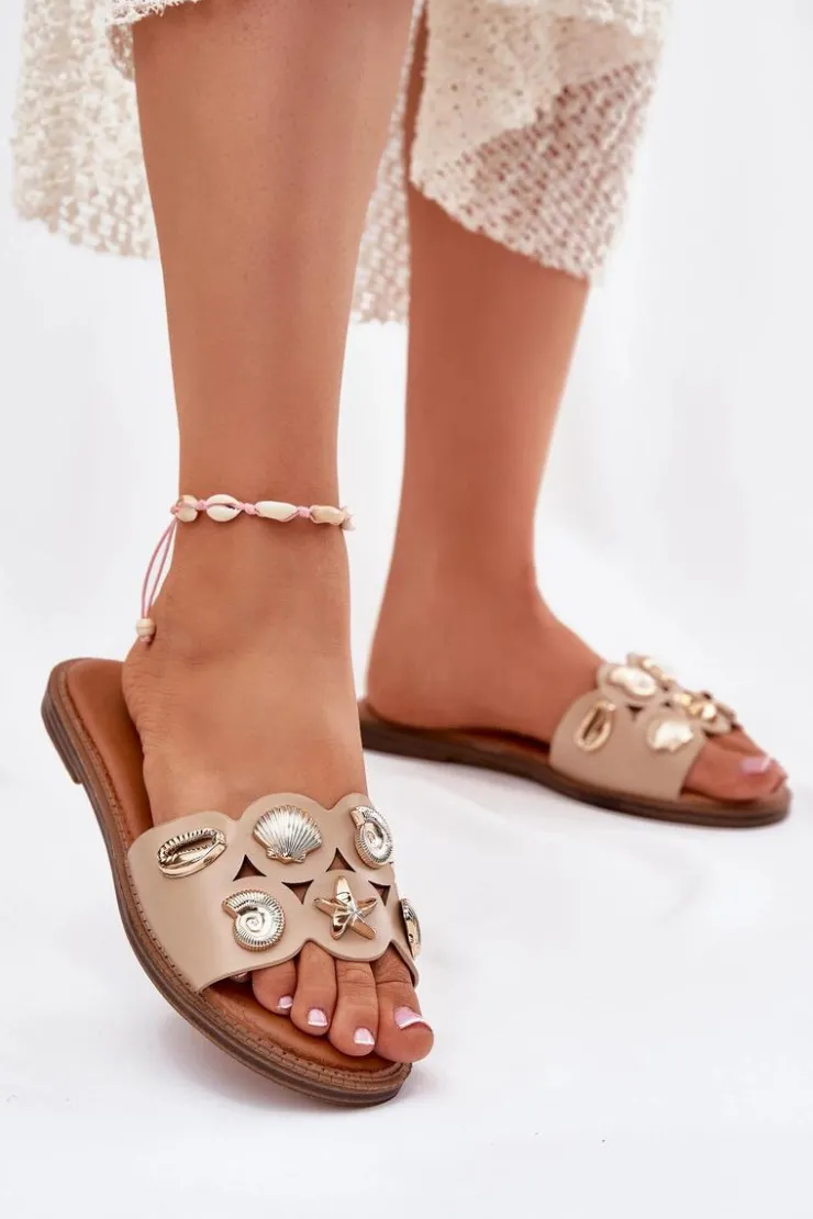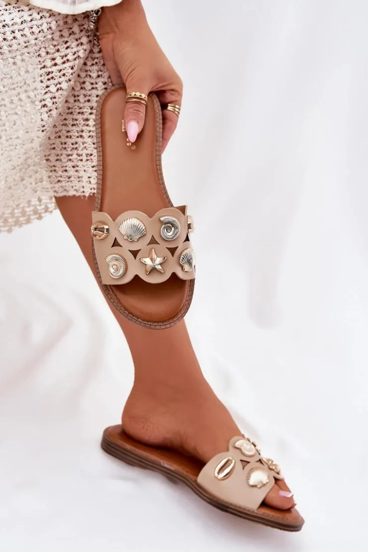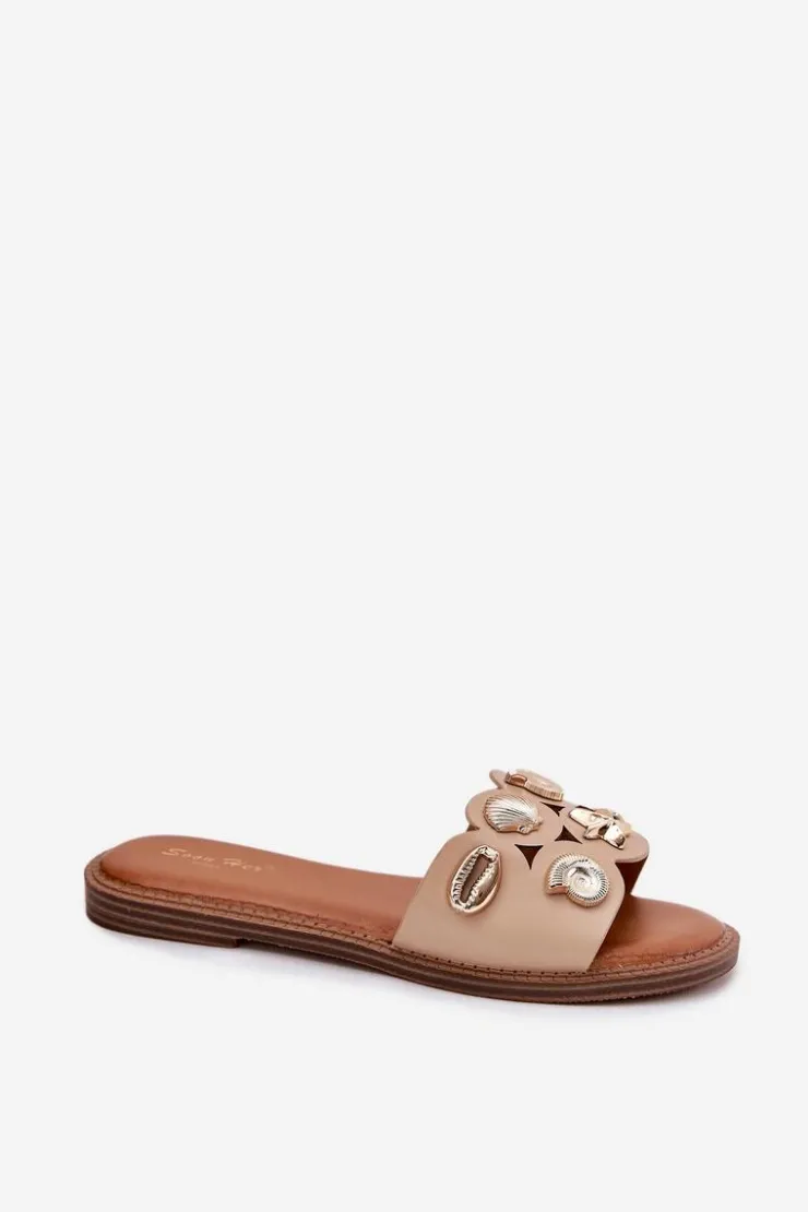 Sale Boto Klapki Damskie Na Płaskim Obcasie Ze Złotymi Przypinkami Beżowe Nalothiel Beżowy