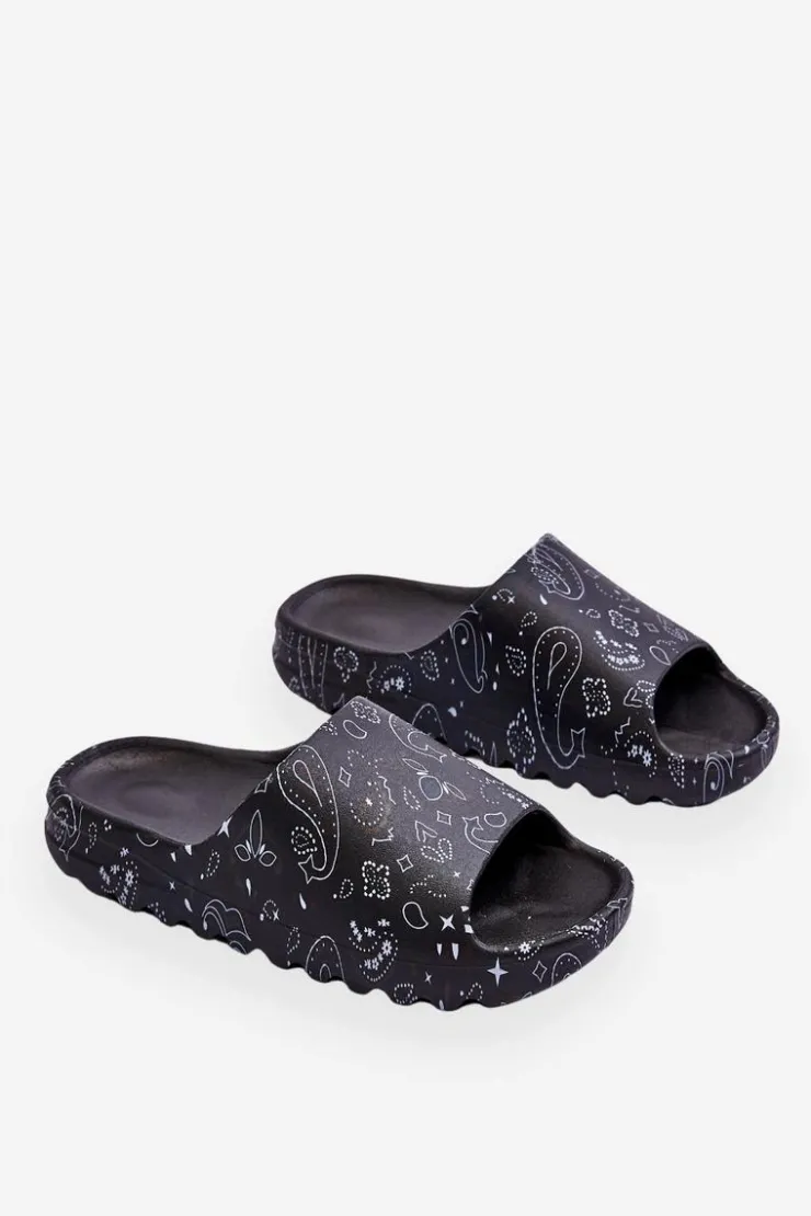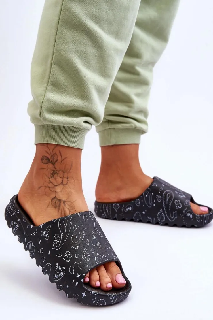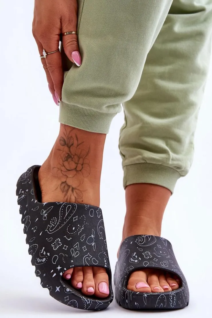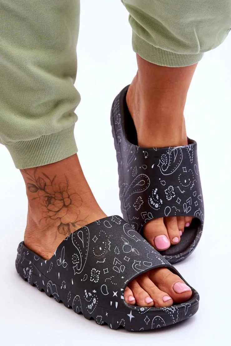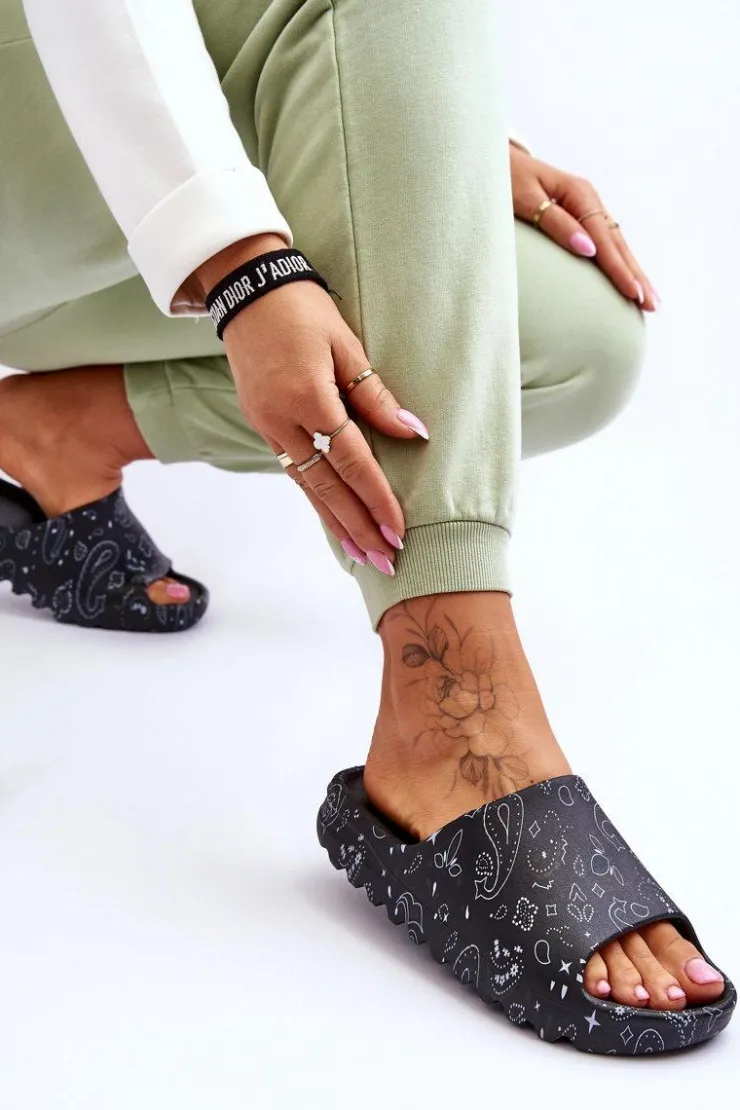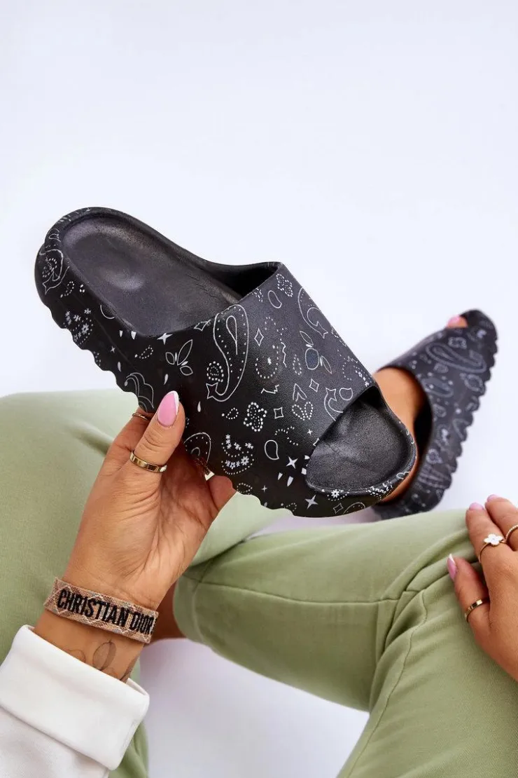 Te klapki powinny znaleźć się w Twojej szafie! Klapki zostały wykonane w całości z tworzywa sztucznego imitującego gumę. Model ten posiada modny, szeroki pasek. Na zewnętrznej stronie obuwia wykonano nadruk w ciekawe wzory. Klapki są idealne do codziennego użytkowania. Świetnie sprawdzą się zamiast papci czy jako klapki na basen. Niezwykle wygodny i komfortowy model. Po prostu musisz je mieć! Przy wyborze rozmiaru prosimy sugerować się tabelą rozmiarów.