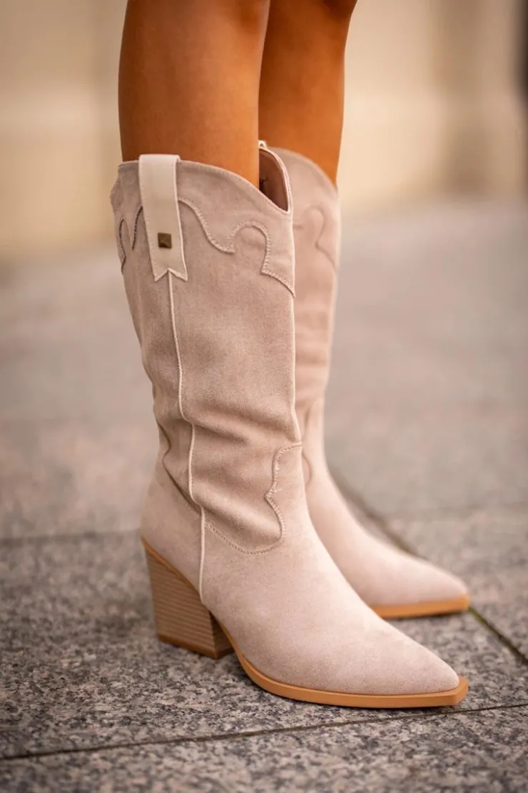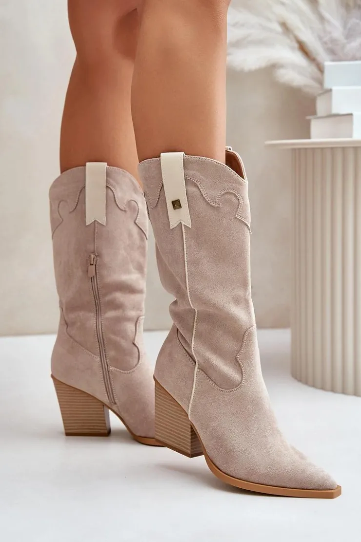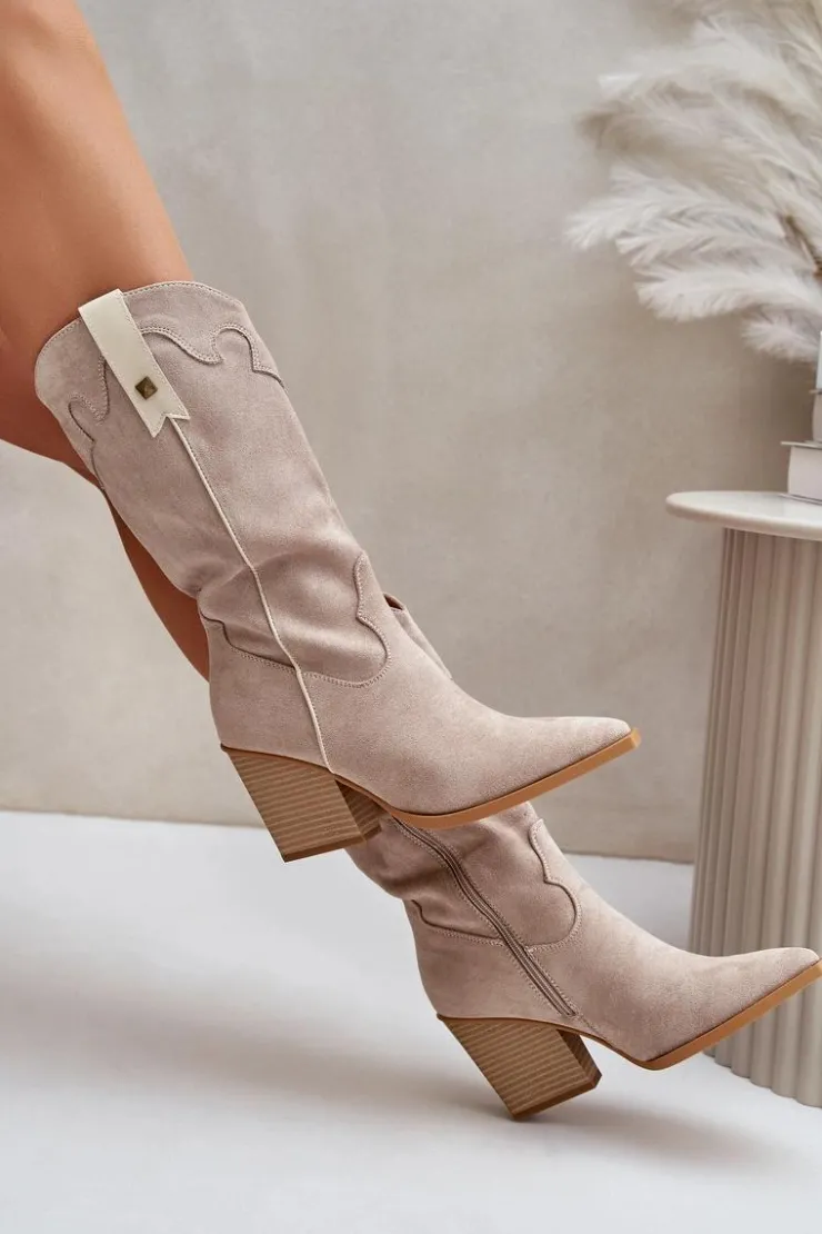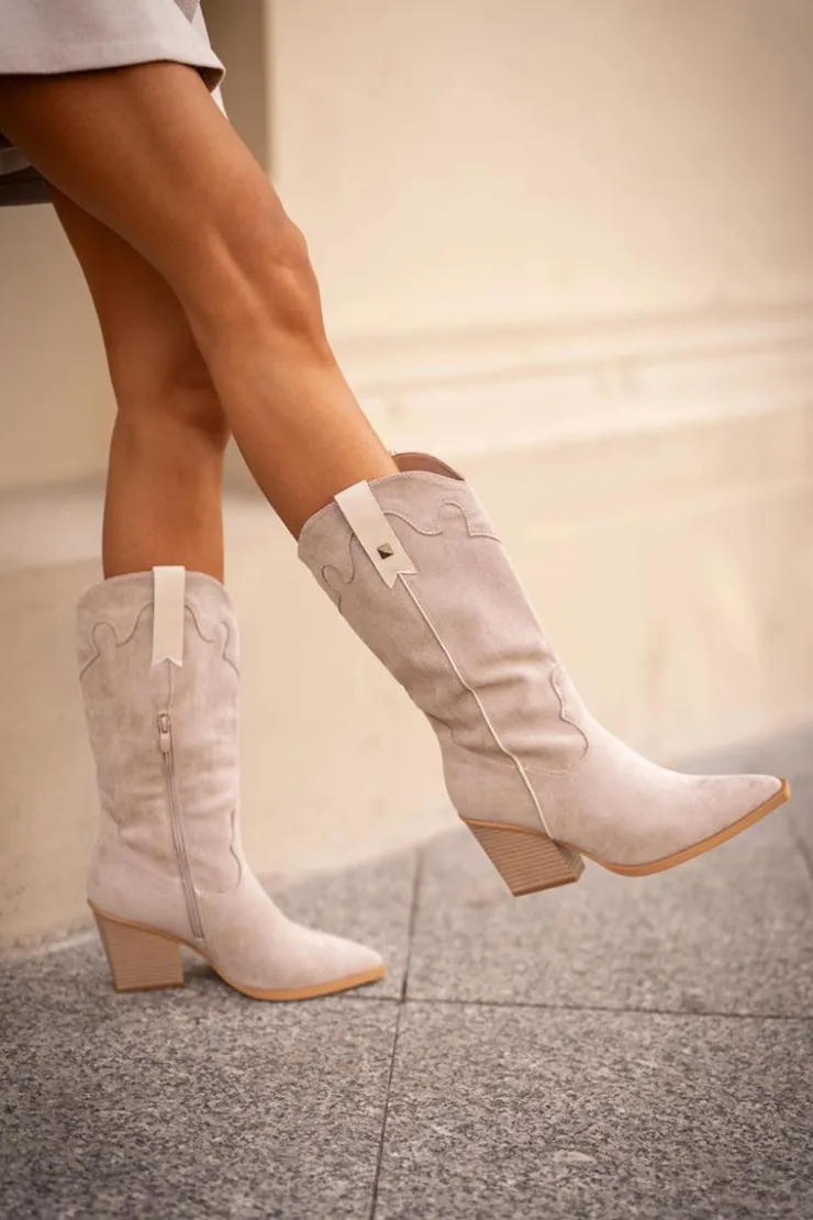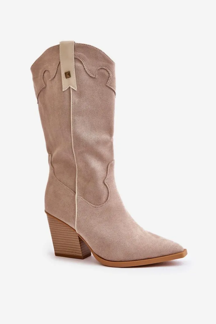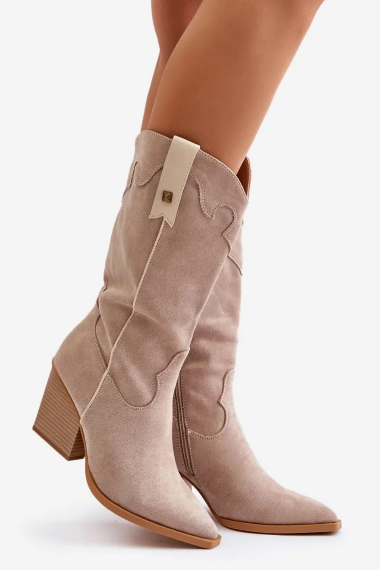Kozaki damskie wykonane z eko zamszu. Osadzone na obcasie w formie słupka. Noski w szpic. Środek ocieplany kocem obuwniczym. Cholewka sięga do połowy łydki. Ten model skradnie serce niejednej miłośniczce kozaków w stylu kowbojek! Świetnie sprawdzą się podczas jesienno-zimowych stylizacji! Przy wyborze rozmiaru prosimy sugerować się tabelą rozmiarów.