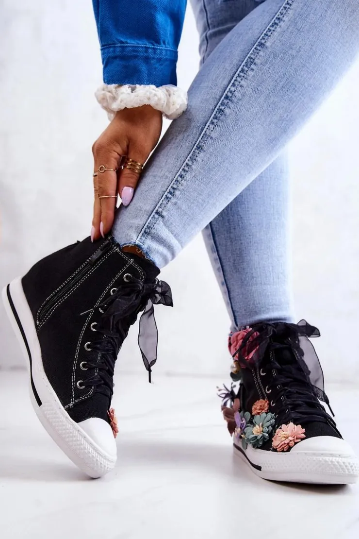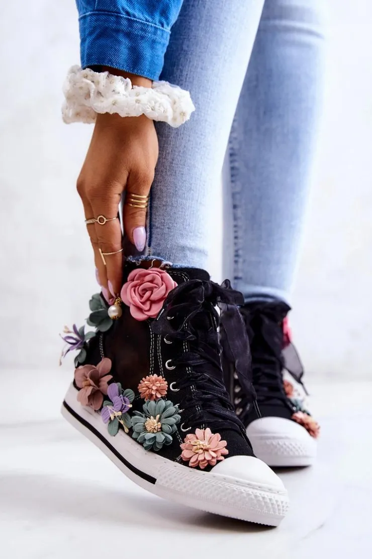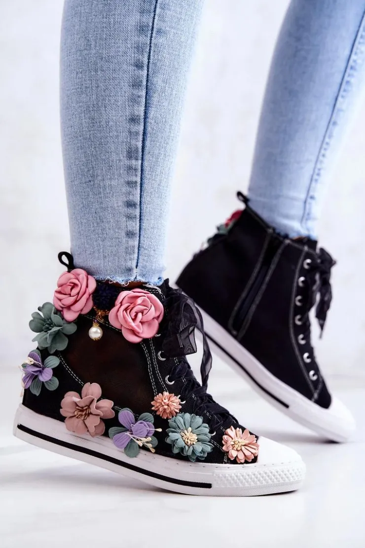 Wyjątkowe trampki, z którymi Twoje stylizacje będą wyróżniać się z tłumu! Model ozdobiony kwiatami ożywi Twoją garderobę! Wykonane z przewiewnego materiału tekstylnego. Z zewnętrznej strony cholewki znajduje się prześwitująca siateczka. Trampki są wiązane na sznurowadła z organzy oraz zapinane na suwak. Nosek wzmocniony gumowym tworzywem. Wkładka materiałowa. Podeszwa wykonana z gumowego tworzywa, antypoślizgowa. Przy wyborze rozmiaru prosimy sugerować się tabelą rozmiarów.