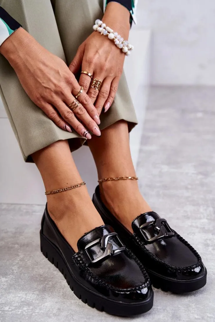 Klasyczne półbuty to doskonały wybór w stylizacjach do pracy. Świetnie prezentują się zarówno ze spodniami, jak i ze spódniczką. Zdobienie z tworzywa sztucznego pięknie podkreśla całość. Buty posiadają masywną podeszwę z wyraźnym wyżłobieniem. Lakierowana eko skóra o praktyczny wybór na co dzień. Półbuty Loafery to buty, które muszą znaleźć się w Twojej szafie! Przy wyborze rozmiaru prosimy sugerować się tabelą rozmiarów.