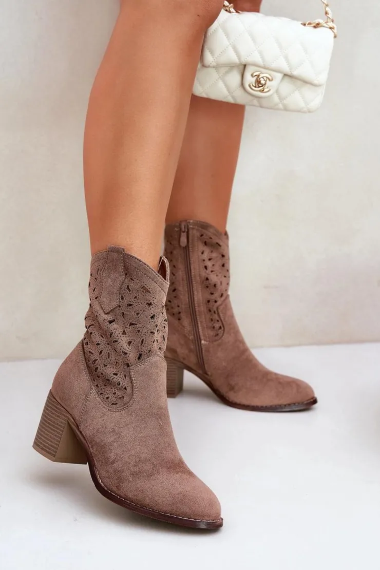 Stylowe botki damskie wykonane z wysokiej jakości eko zamszu. Osadzone na stabilnym słupkowym obcasie. Model ten wyróżnia ażurowy wzorek na cholewce. Noski w migdał. Zapinanie na zamek zapewnia wygodę i łatwość zakładania. Idealne na różne okazje, te botki będą stylowym uzupełnieniem Twojej wiosennej garderoby. Przy wyborze rozmiaru prosimy sugerować się tabelą rozmiarów.