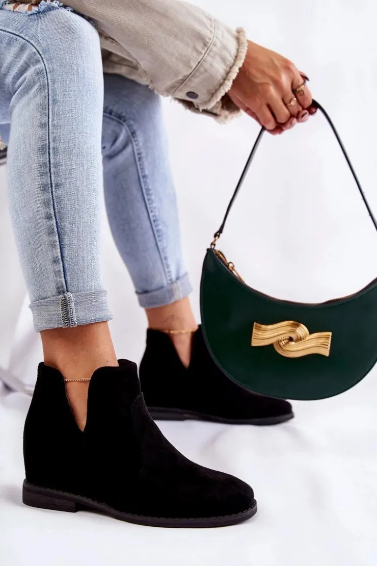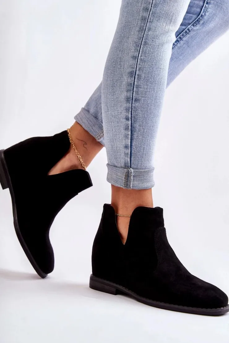 Cudowne botki na ukrytym koturnie i płaskim obcasie. Posiadają cholewkę za kostkę z wycięciami po bokach. Model wsuwany. Wykonane z wysokojakościowego eko zamszu. Miękka wkładka z eko skóry oraz usztywniany zapiętek pozwala na wygodne użytkowanie. Ten model sprawdzi się podczas wielu sezonów! Koniecznie powinnaś je mieć w swojej szafie! Przy wyborze rozmiaru prosimy sugerować się tabelą rozmiarów.
